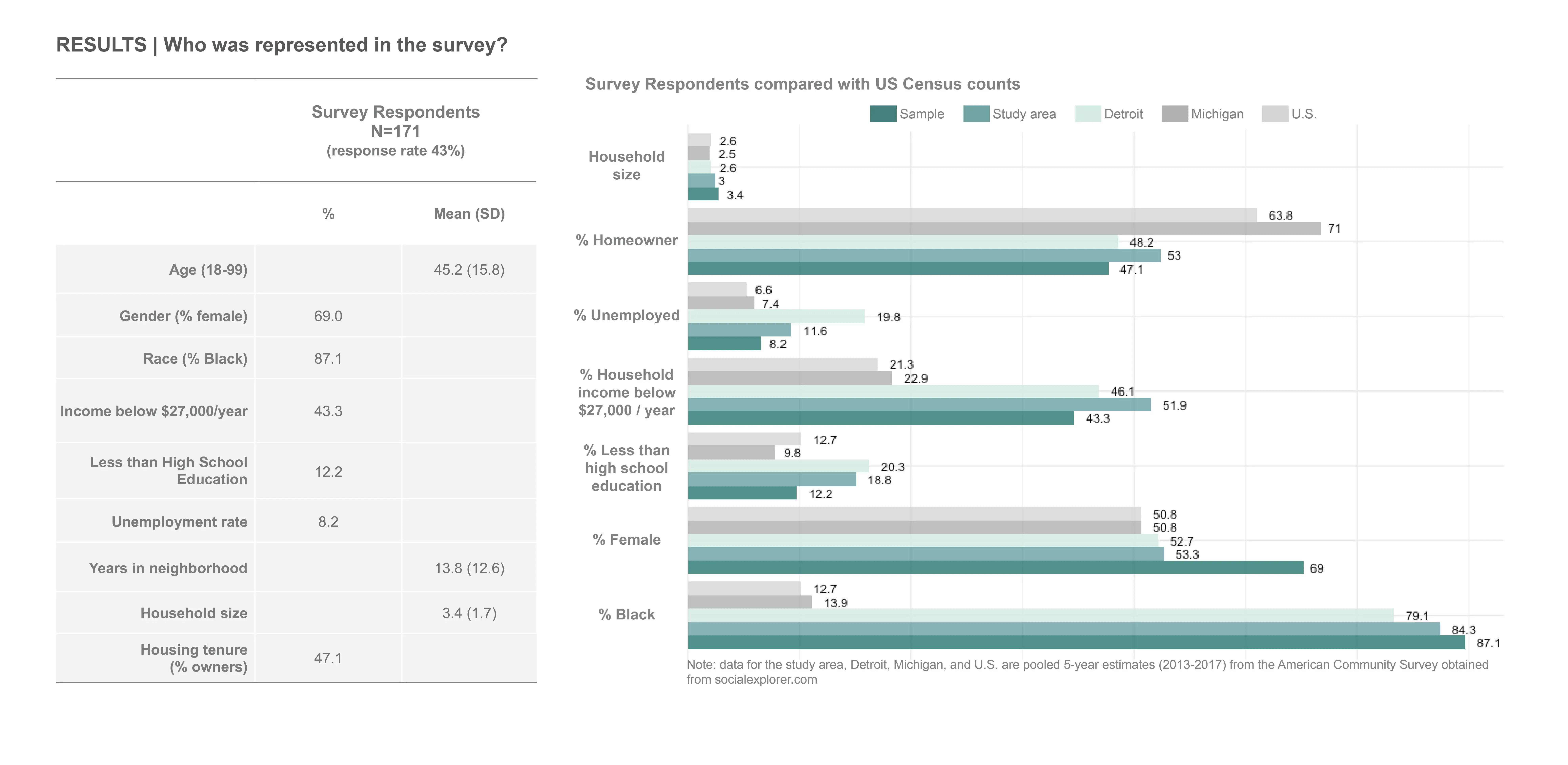 Considering race, education, income, and home ownership, the 171 households responding to our survey were representative of the 14 US Census Block Groups across both study areas. Respondents were more often female and older than in the Census, an expected result given than only a household members over age 18 was eligible to complete the survey.