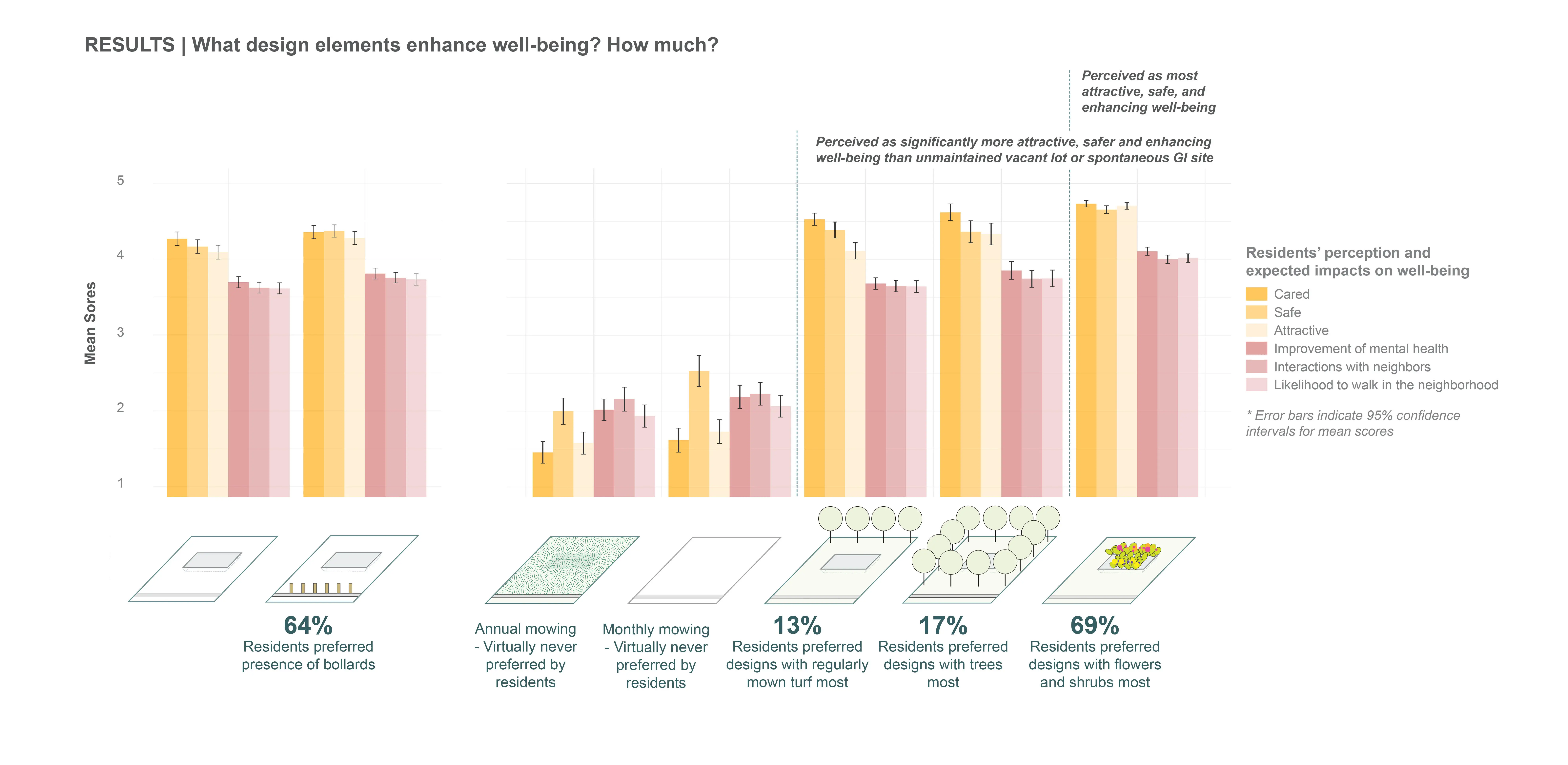 2. Basis in scholarly theory: testing the effects of landscape design elements on residents’ well-being in a replicable way that was informed by thorough review of the scholarly literature about well-being, preferences, and perceptions of neighborhood greenspace. Related to well-being, we identified a need to understand how small scale landscape elements might affect residents’ mental and emotional health, as well as their social and physical behavior that may affect health. Related to perceived care and safety, ample scholarly literature suggests that perceived care and safety of neighborhood greenspace affects well-being of residents of legacy cities, and many studies identify design elements that act as cues to care or safety. However, there is a need to put the pieces together to address inequity in neighborhood greenspaces - experimentally varying design elements to quantify their relationship to preferences, perceptions, and well-being.