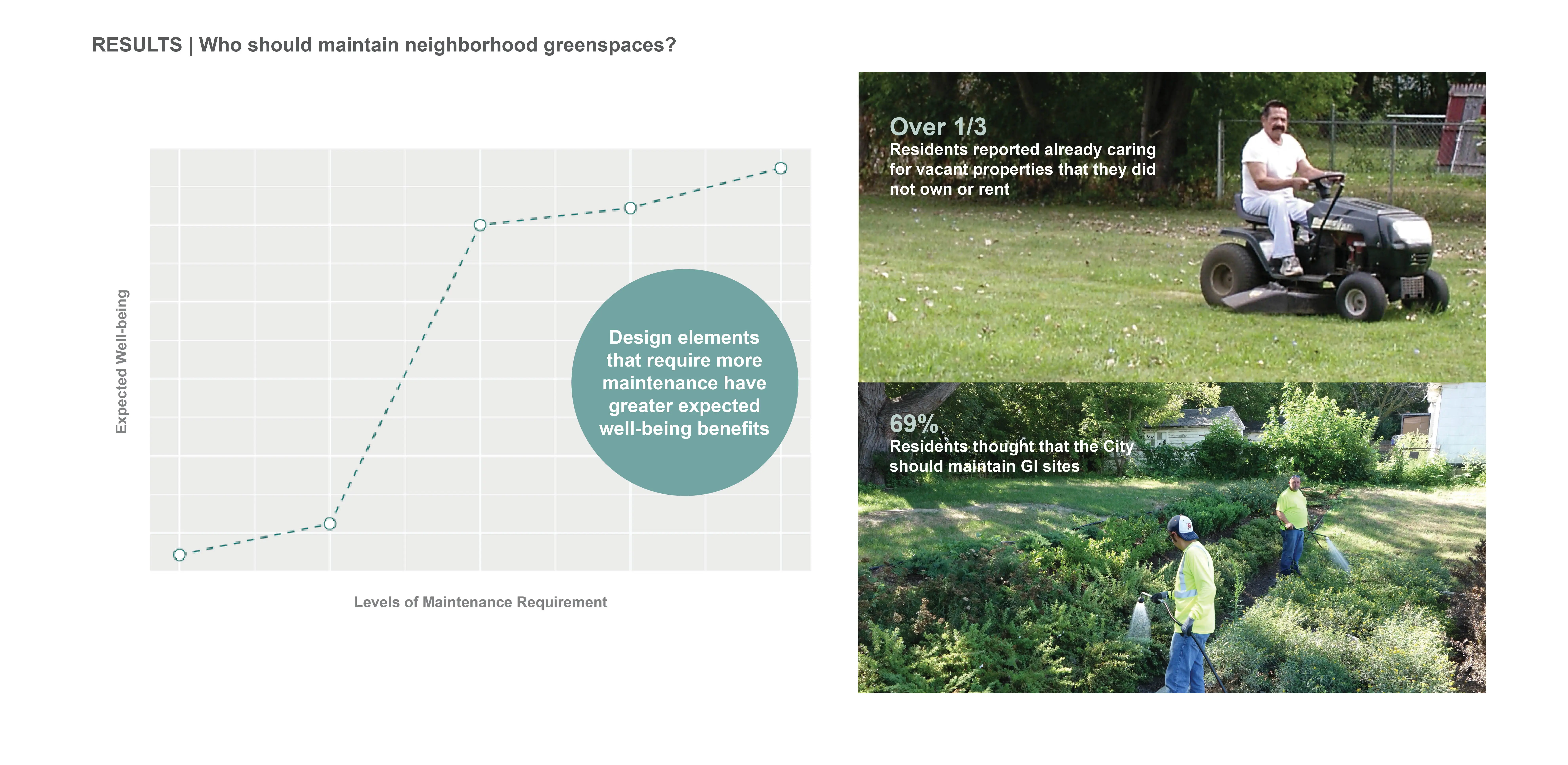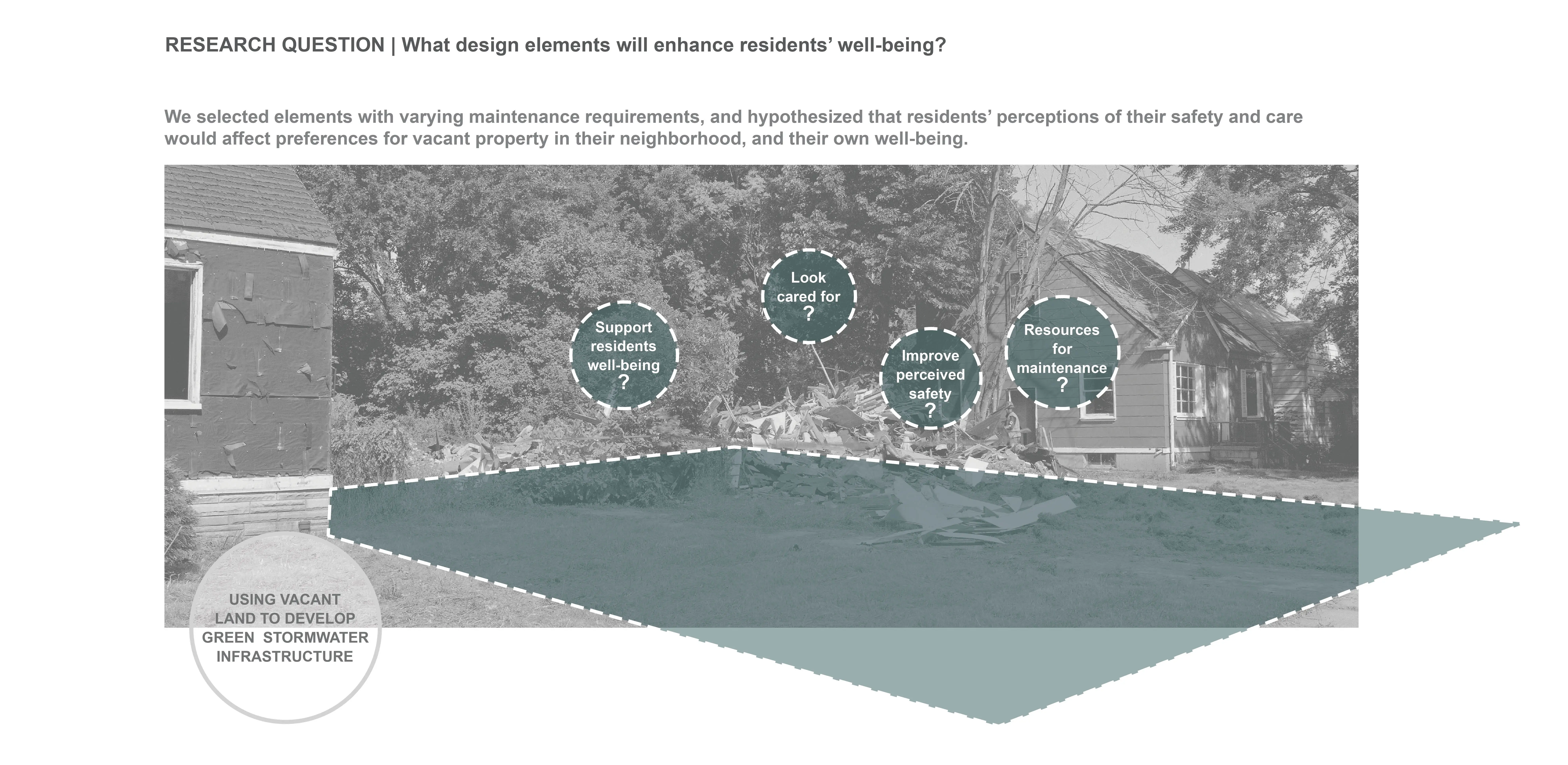 Our research problem was to identify how much small-scale design elements of neighborhood greenspace that presented different maintenance requirements could enhance residents’ well-being. Framing the problem in this way, we could focus on well-being of residents while also tuning results to address maintenance challenges of legacy cities.