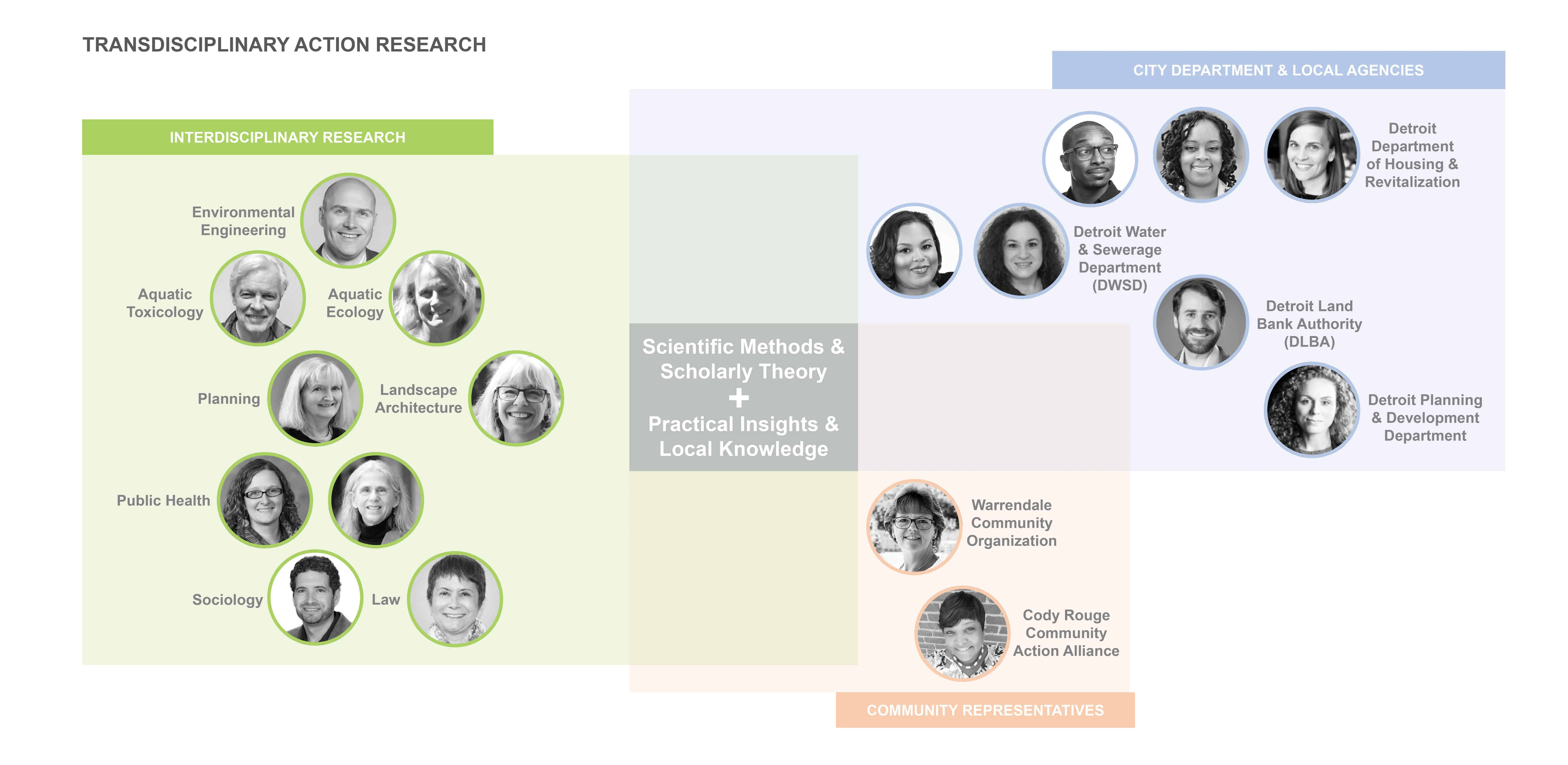 This multi-year transdisciplinary research project in Detroit, MI, USA, addressed the relationship between greenspace and residents’ well-being in neighborhoods struggling with widespread vacant property. Leveraging green stormwater infrastructure (GSI) investments by the water utility to create new neighborhood greenspaces, it investigated which design elements were essential to well-being, and which had the greatest effect on well-being of residents. Detroit, like many legacy cities, has a history of deindustrialization, racist housing policies, and years of disinvestment contributing to depopulation. Poverty and property vacancy disproportionately affect disadvantaged residents in some neighborhoods. These residents’ experiences with vacant property undermine their well-being, personal safety and property values. Greening of vacant lots may promote well-being, depending upon how residents experience the qualities of greenspace landscapes. However, maintenance to ensure that vacant lots are well-cared-for is challenged by budgetary limitations of legacy cities. For this reason, understanding how to select GI design elements that can be maintained over time and that will make a difference in residents’ well-being is essential to landscape architecture’s capacity to address systemic inequities in legacy cities.
