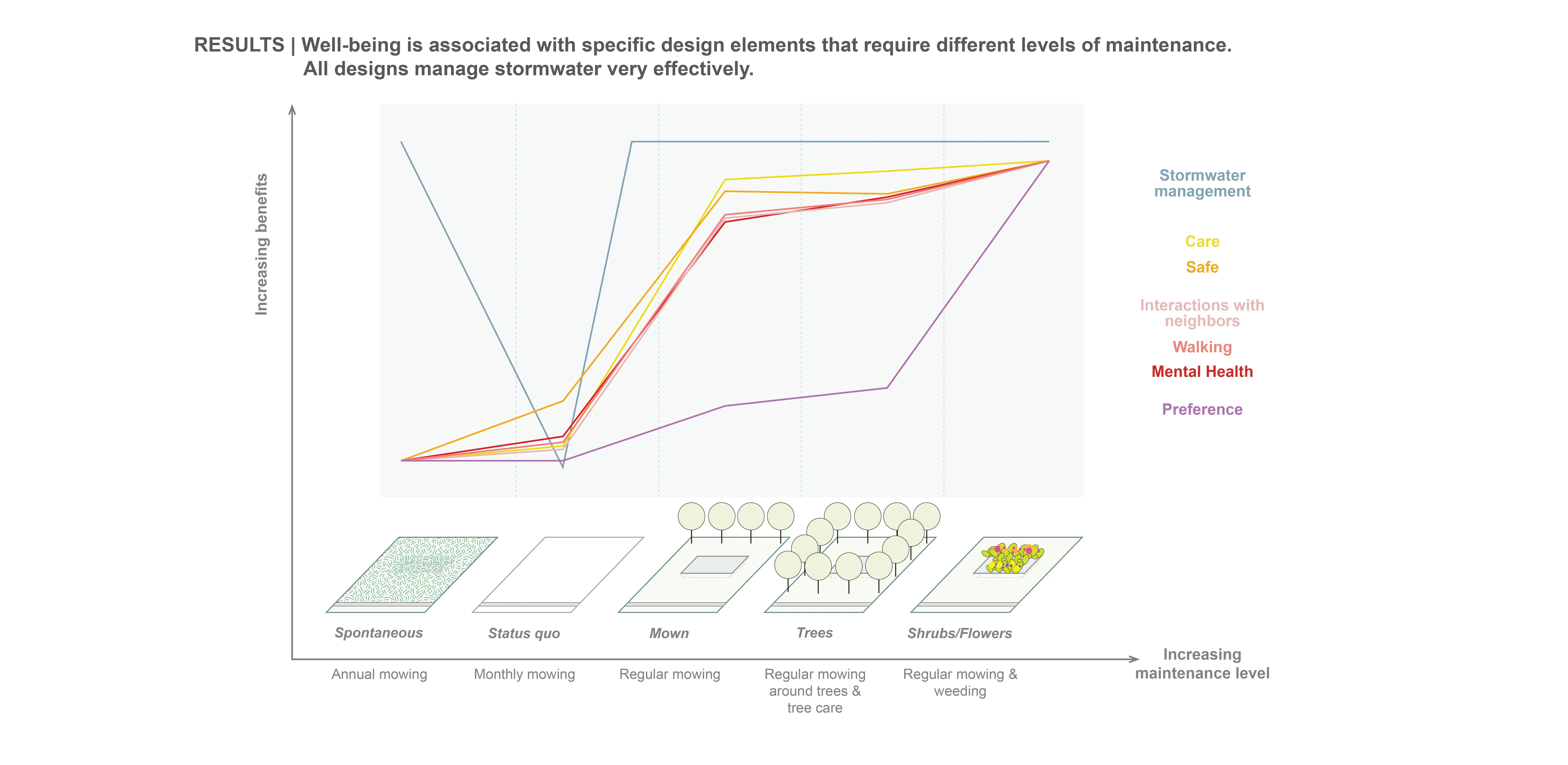 • Considering the need to minimize maintenance requirements, mown turf is the landscape element most essential for enhancing well-being of residents. However, other landscape elements, especially low-growing vividly flowering shrubs and herbs significantly enhance well-being compared with mown turf alone.