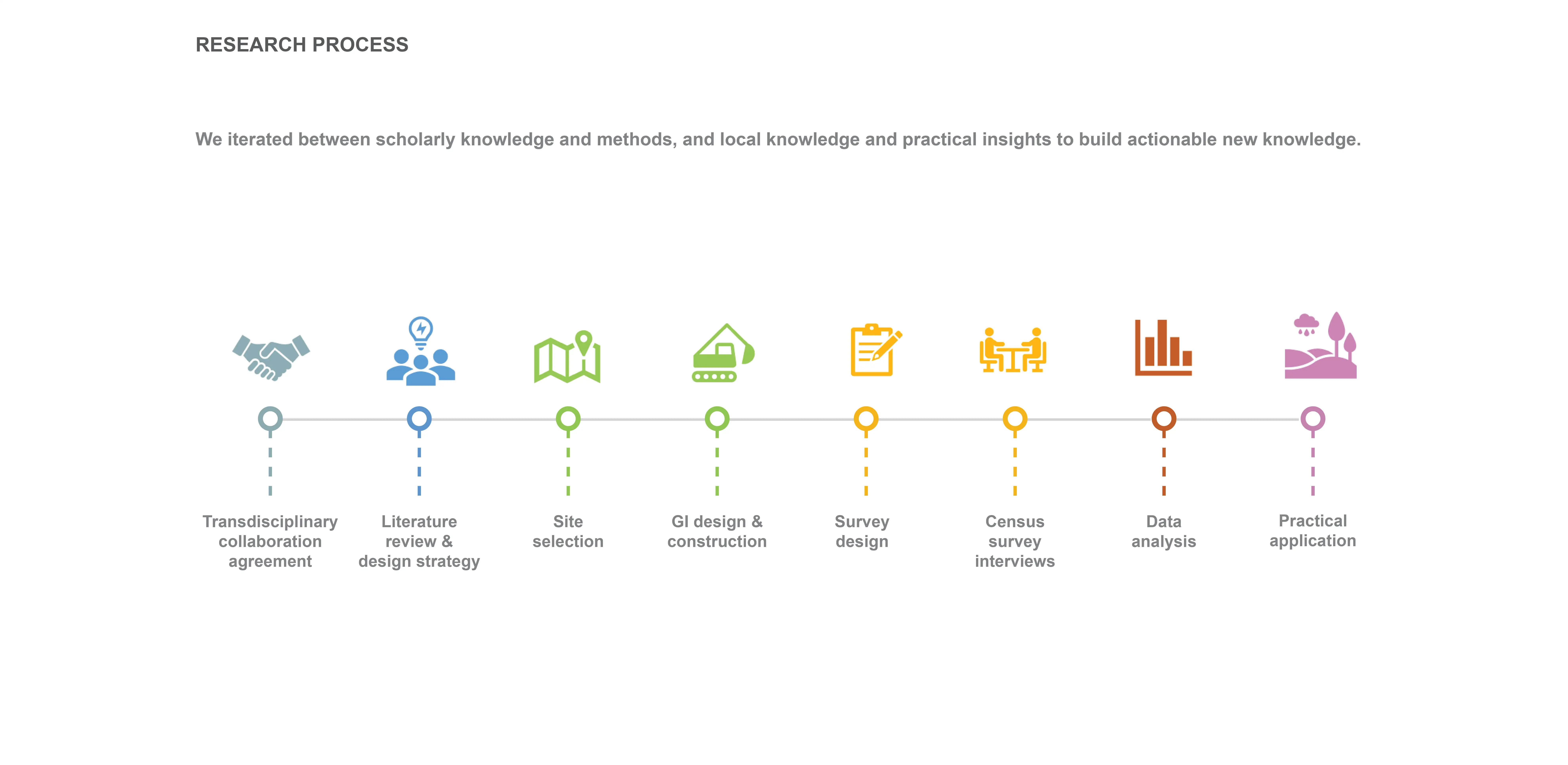 1. Basis in practical understandings and local knowledge: a transdisciplinary action research process that produced immediate change in a disadvantaged neighborhood. This required intensive iterative collaboration among agencies, NGOs, neighborhood residents and an interdisciplinary research team over seven years. It led us to understand that neighborhood greenspaces in legacy cities should be maintained by agency staff rather than relying on volunteers. Accepting the limited revenues of legacy cities, we framed our research questions around design alternatives that offered a range of maintenance efficiencies.