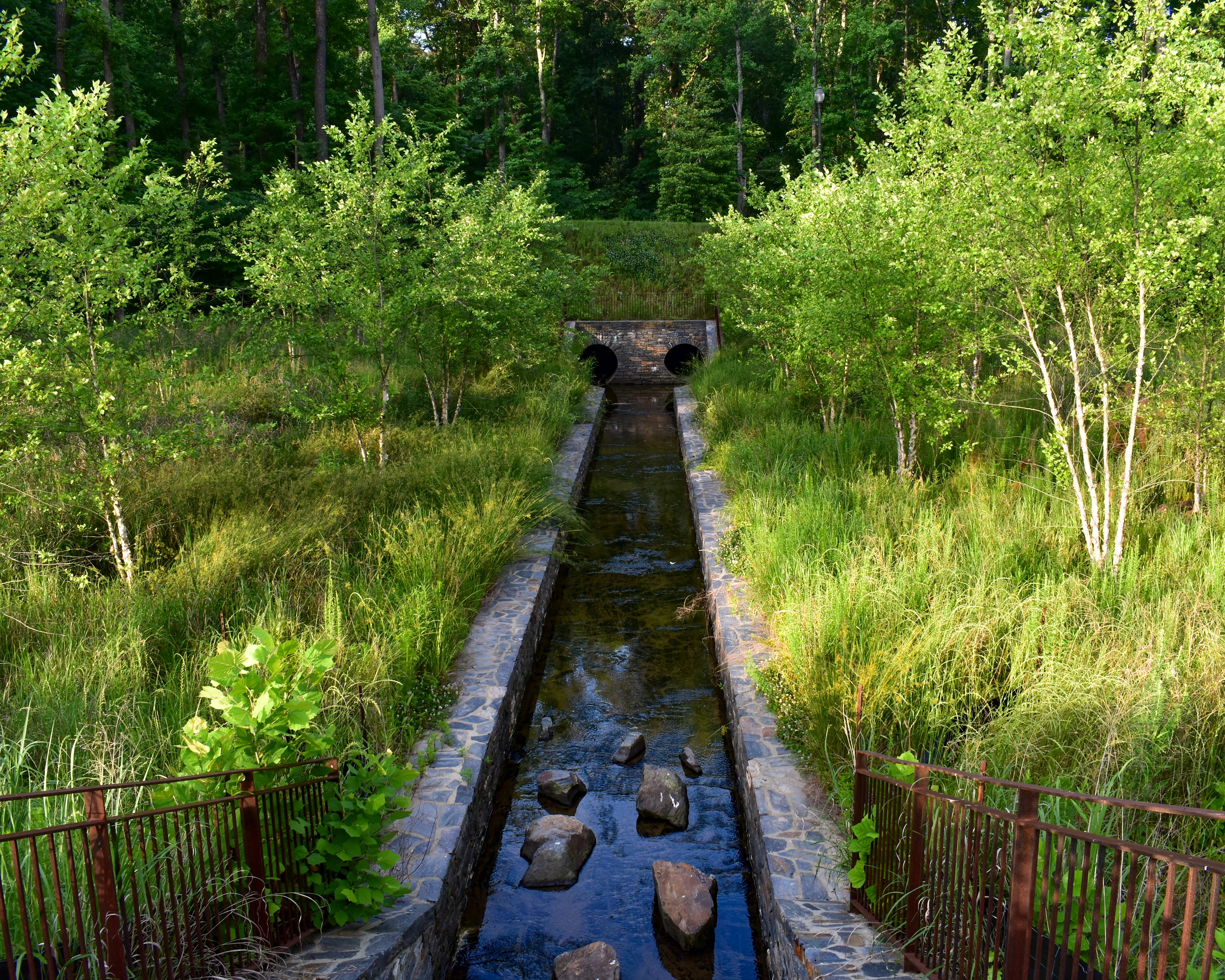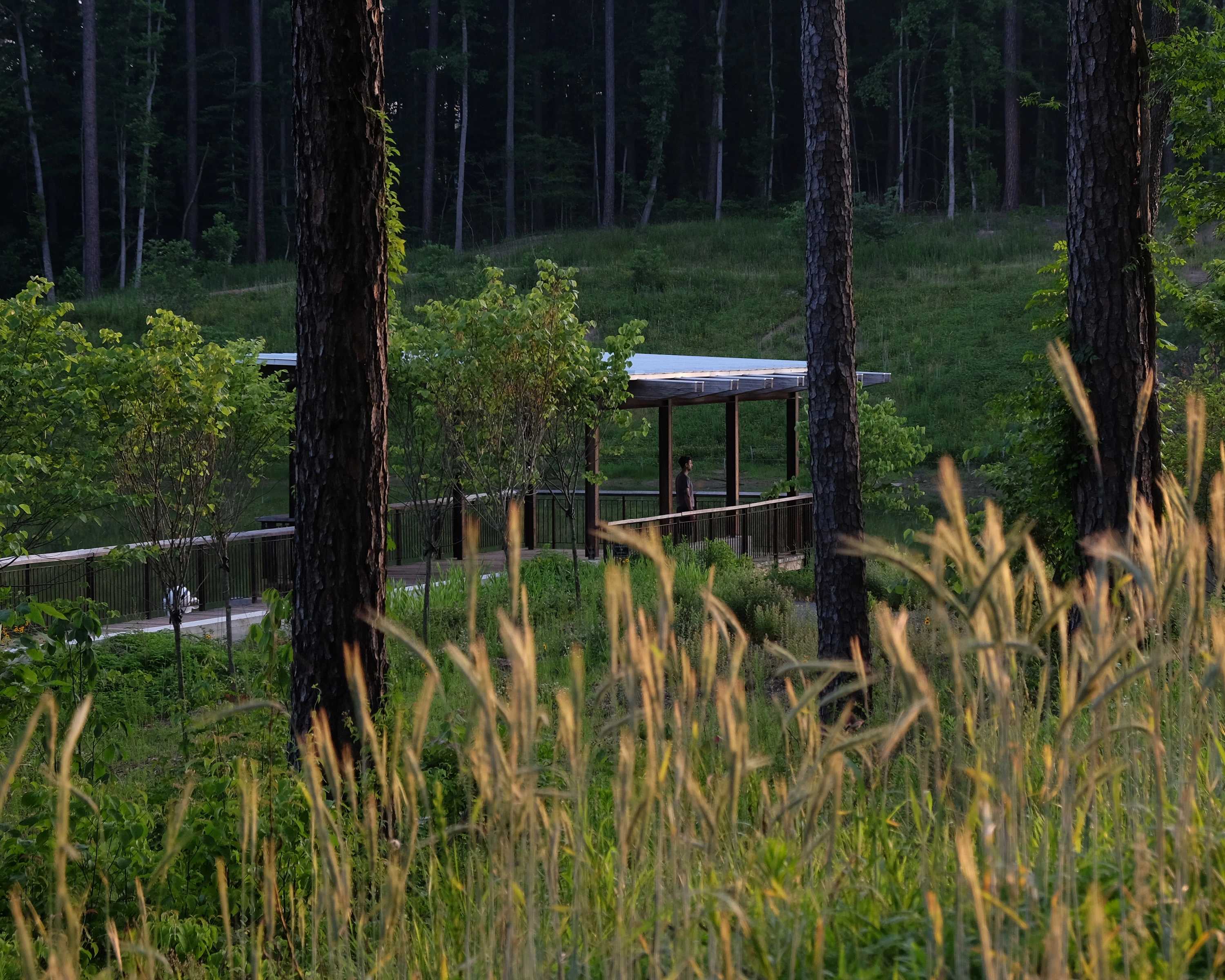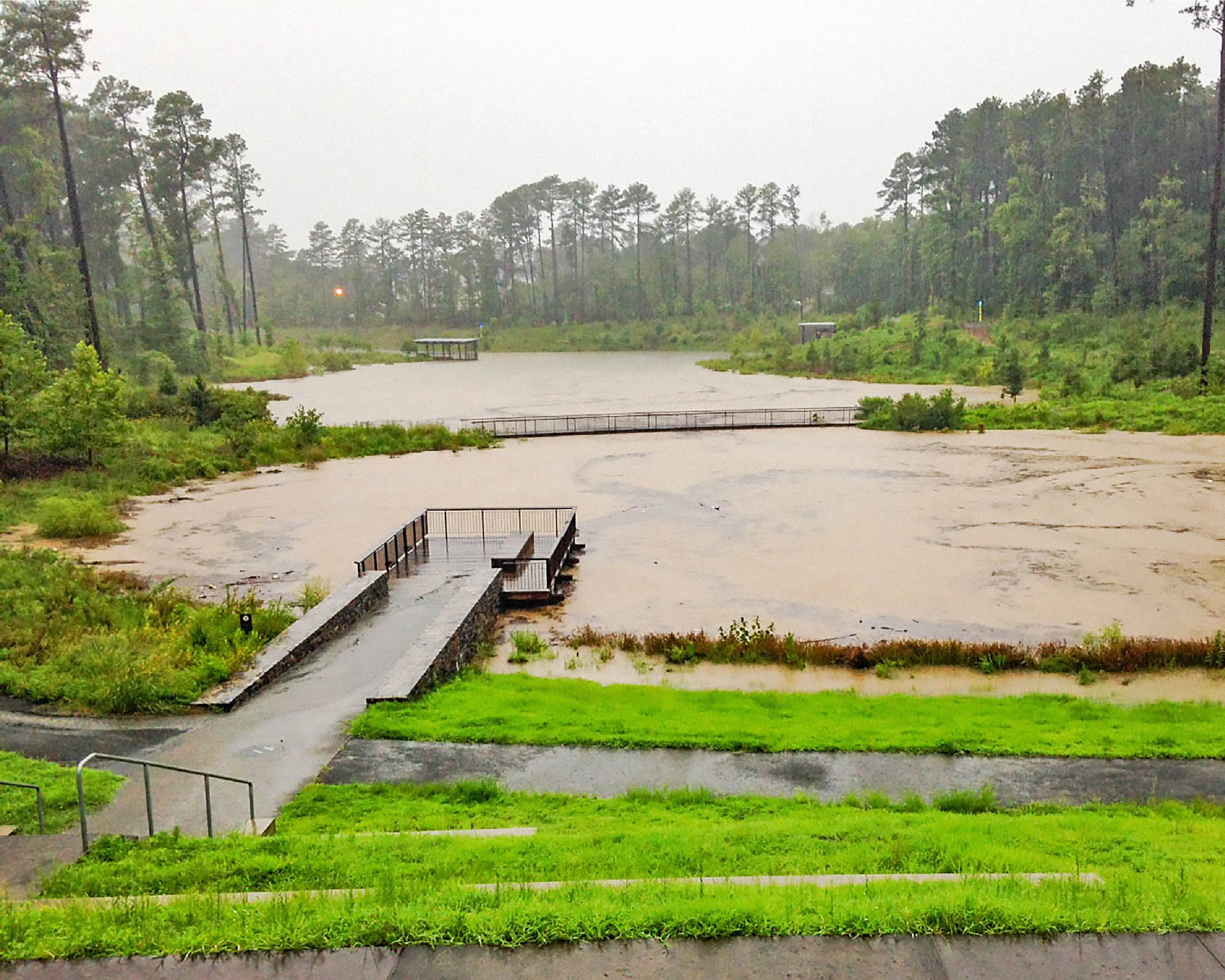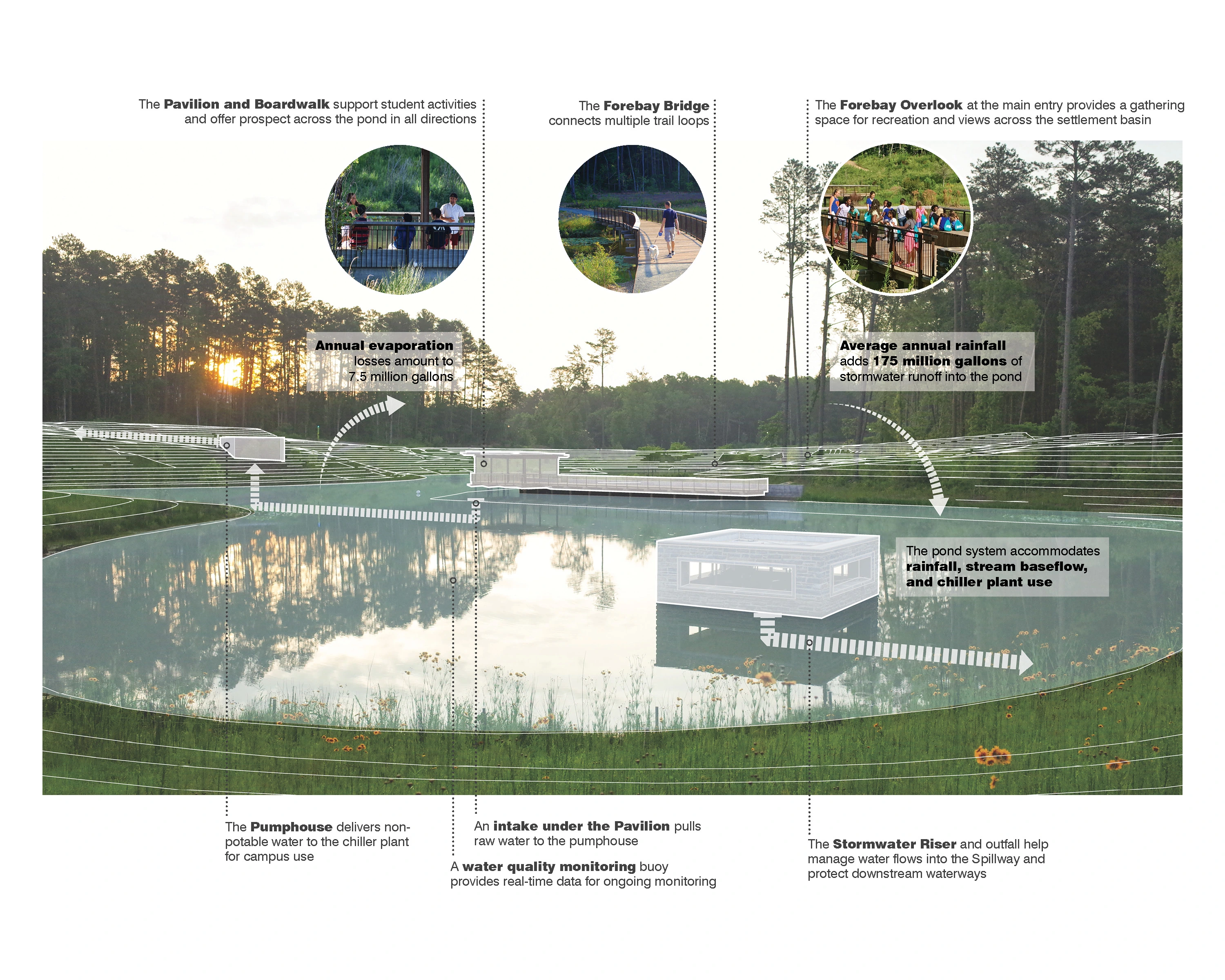 In light of the extremes of prolonged drought conditions and torrential storms, Duke Pond—a water reclamation site within Duke University’s Durham, N.C., campus—seeks to capitalize on infrequent but heavy rainfall events to harness runoff and fulfill a large portion of its water consumption. What was once a neglected gully now serves as a functional catchment basin and pedagogical tool, transformed from infrastructural afterthought into a prime location for interaction with nature along the pond edge. The efforts recognize the scarcity of water as a resource and turn it into a celebrated asset, with social spaces that promote engagement with the water while reducing strain on municipal systems.