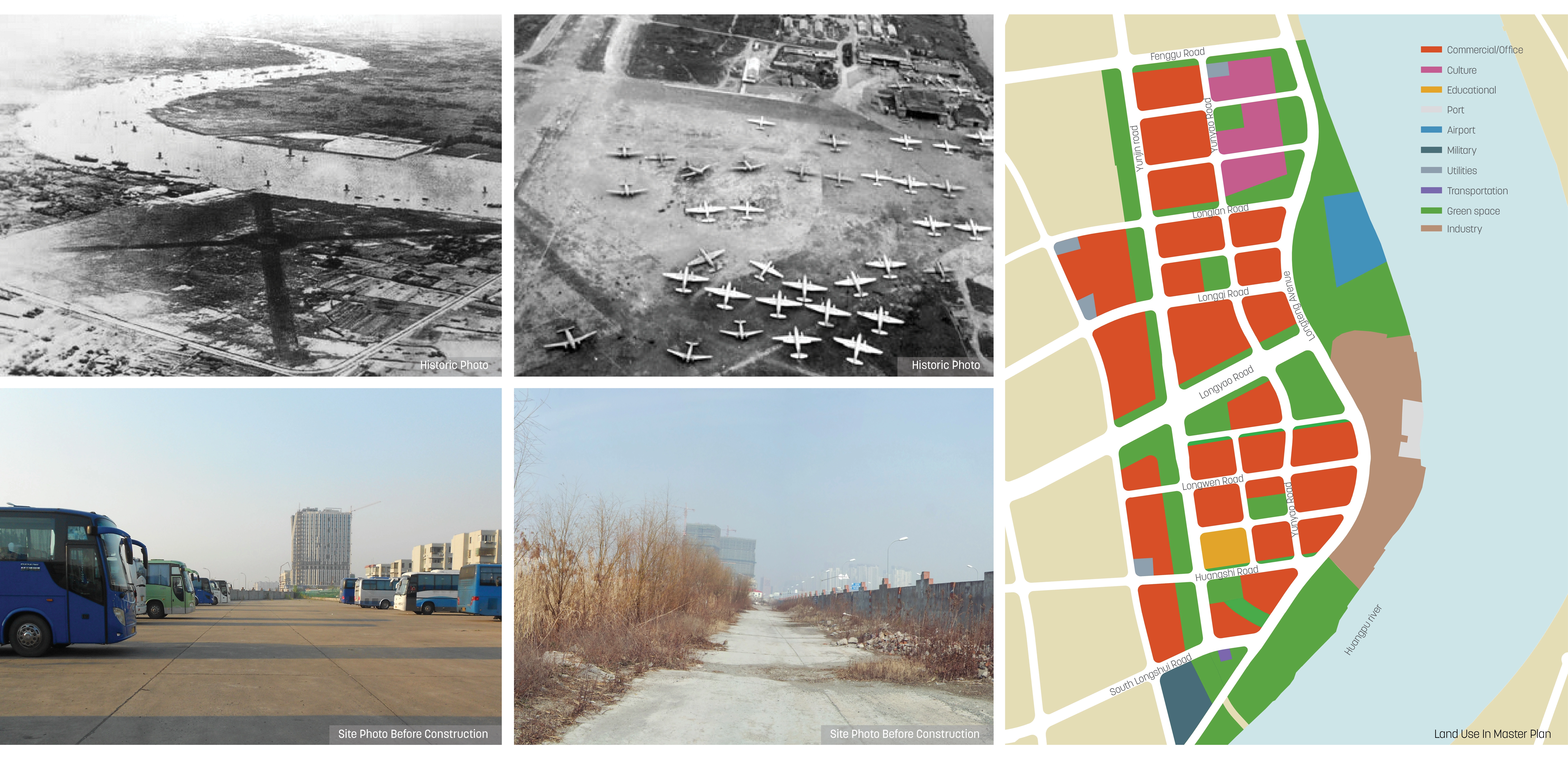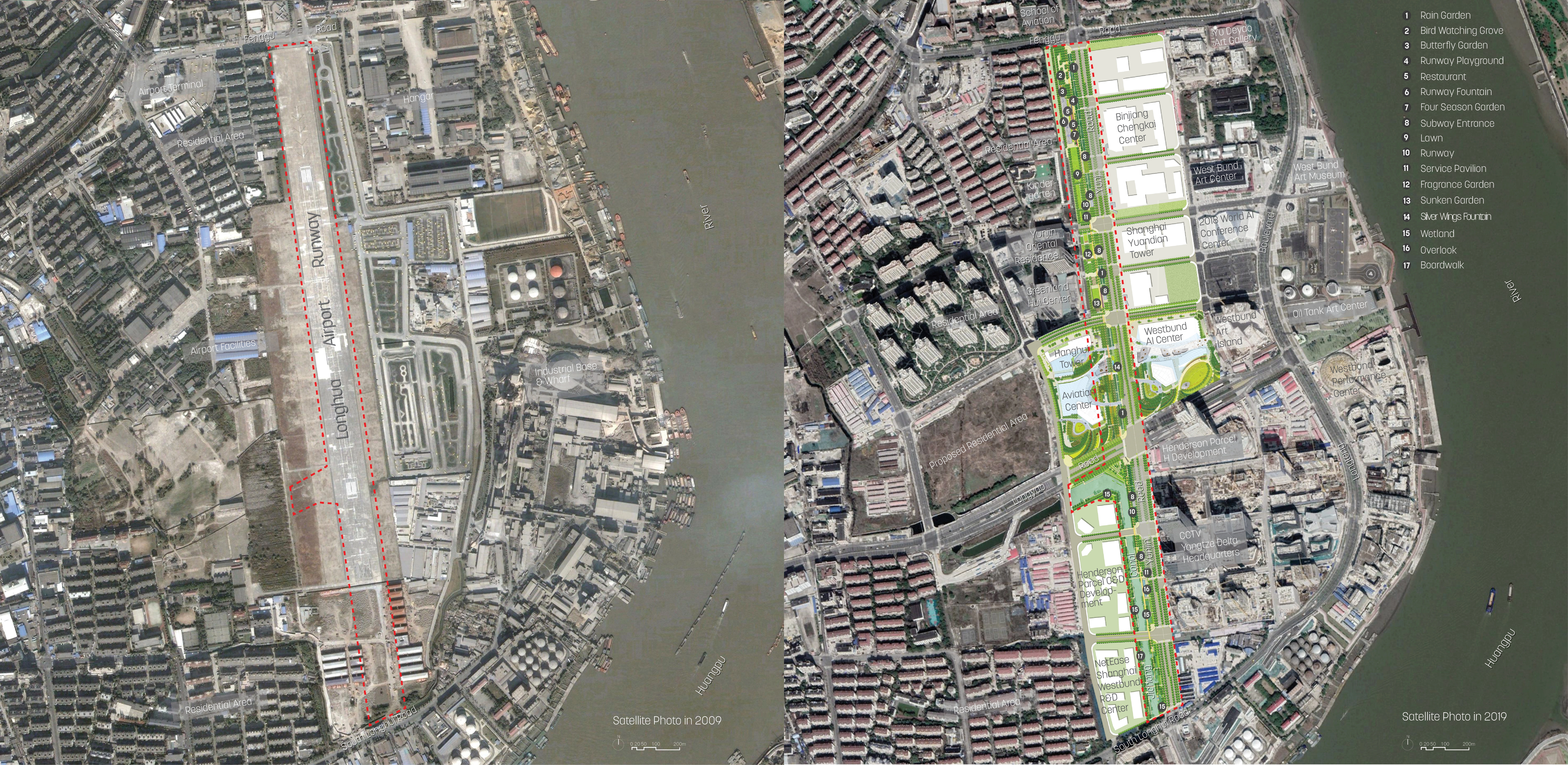 Xuhui Runway Park is an innovative urban revitalization project that breathes new life into a unique piece of Shanghai’s history. Located in Xuhui Riverfront area, a formal transportation, storage and manufacture base of the city, the 14.63-hectare (36.15-acre) site was once the main runway of Longhua Airport. The airport was originally built in 1922 as a military airstrip and then converted into a civil airport in 1929. In 1946, when China joined the International Civil Aviation Organization, Longhua Airport, the largest international airport in East Asia at the time, was designated as China’s primary international airport. After Shanghai relocated its civic aviation base to Hongqiao in 1966, Longhua Airport remained in operation as a general aviation airport. The concrete runway, which was built in 1948 and at 1830 meters long and 80 meters wide, was in constant use until the airport was decommissioned in 2011.