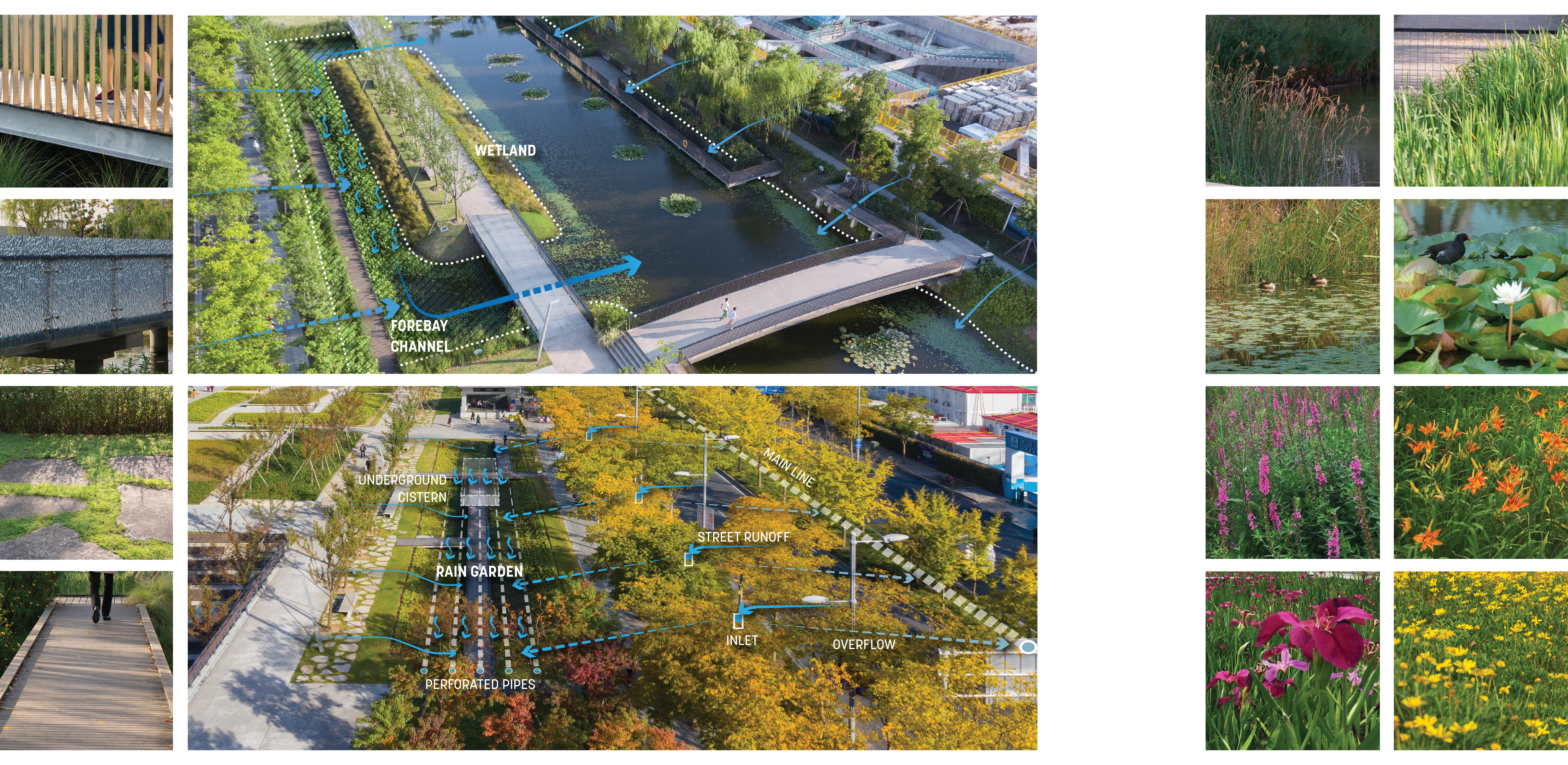 The stormwater from both the park and Yunjin Road is managed along the street through the 5,760 square meter (1.42 acre) rain garden and the 8,107 square meter (2 acre) constructed wetland. This roadside rain garden system is the first of its kind built in Shanghai. After treatment at the rain garden and the forebay, the stormwater meets the quality requirements for recreational water suitable for human touch in accordance with the Surface Water Quality Standard of China. A portion of the treated runoff is collected at a 39.4 cubic meter (10,408 gallon) underground cistern for park’s operational use when necessary. It is sufficient for irrigating 19,700 square meters (4.87 acres) of planted areas or providing a full water supply for the Runway Fountain.