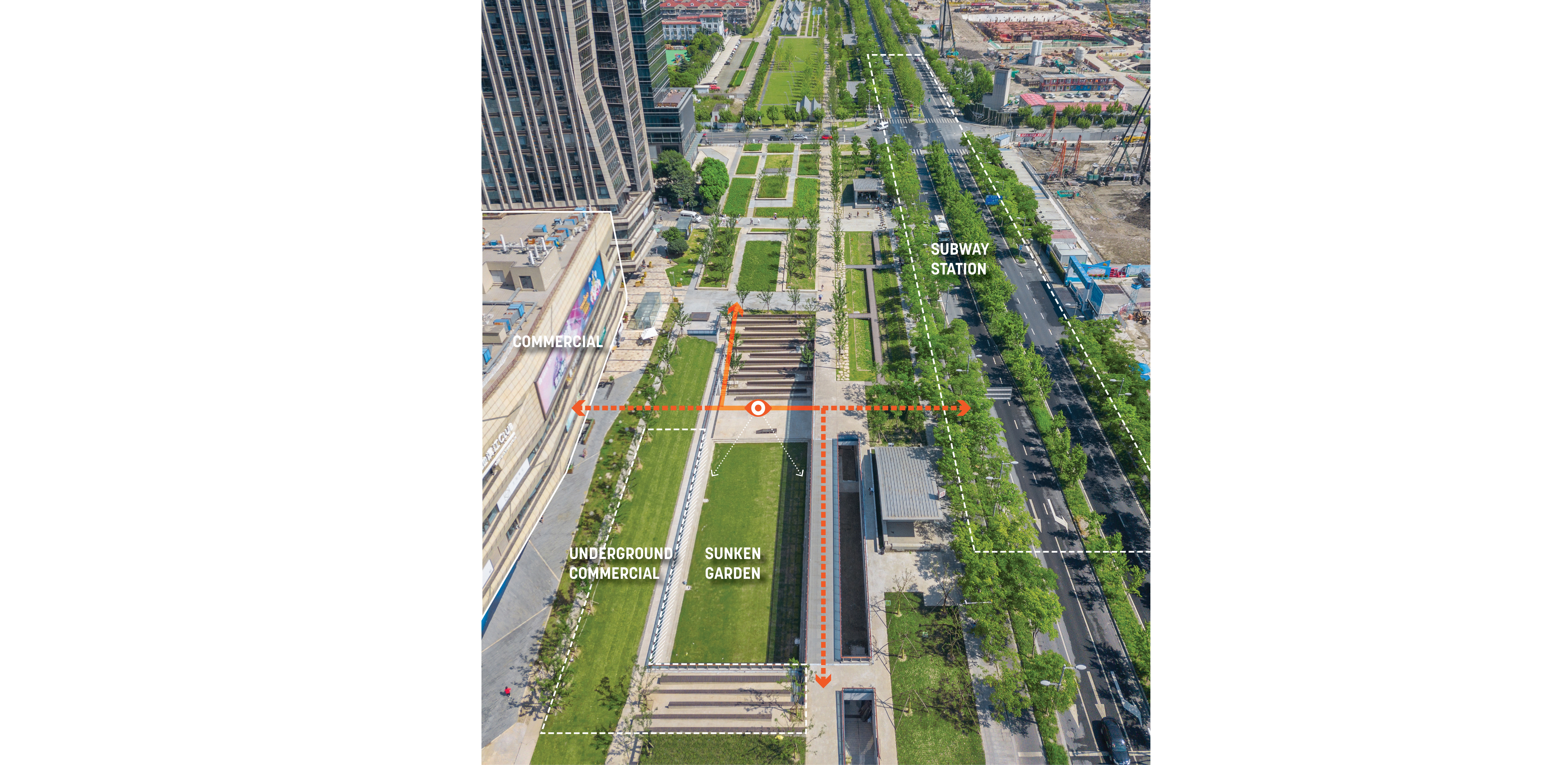 A sunken garden is carved between the park's subway station and adjoining development parcels, improving the walking experience to and from transit while enriching the spatial composition of the park in its conveyance of an extended descending and ascending experience. Additional commercial frontage lines the garden perimeter, which activates the garden space while introducing revenue-generating program to the park to support its operations and maintenance costs.