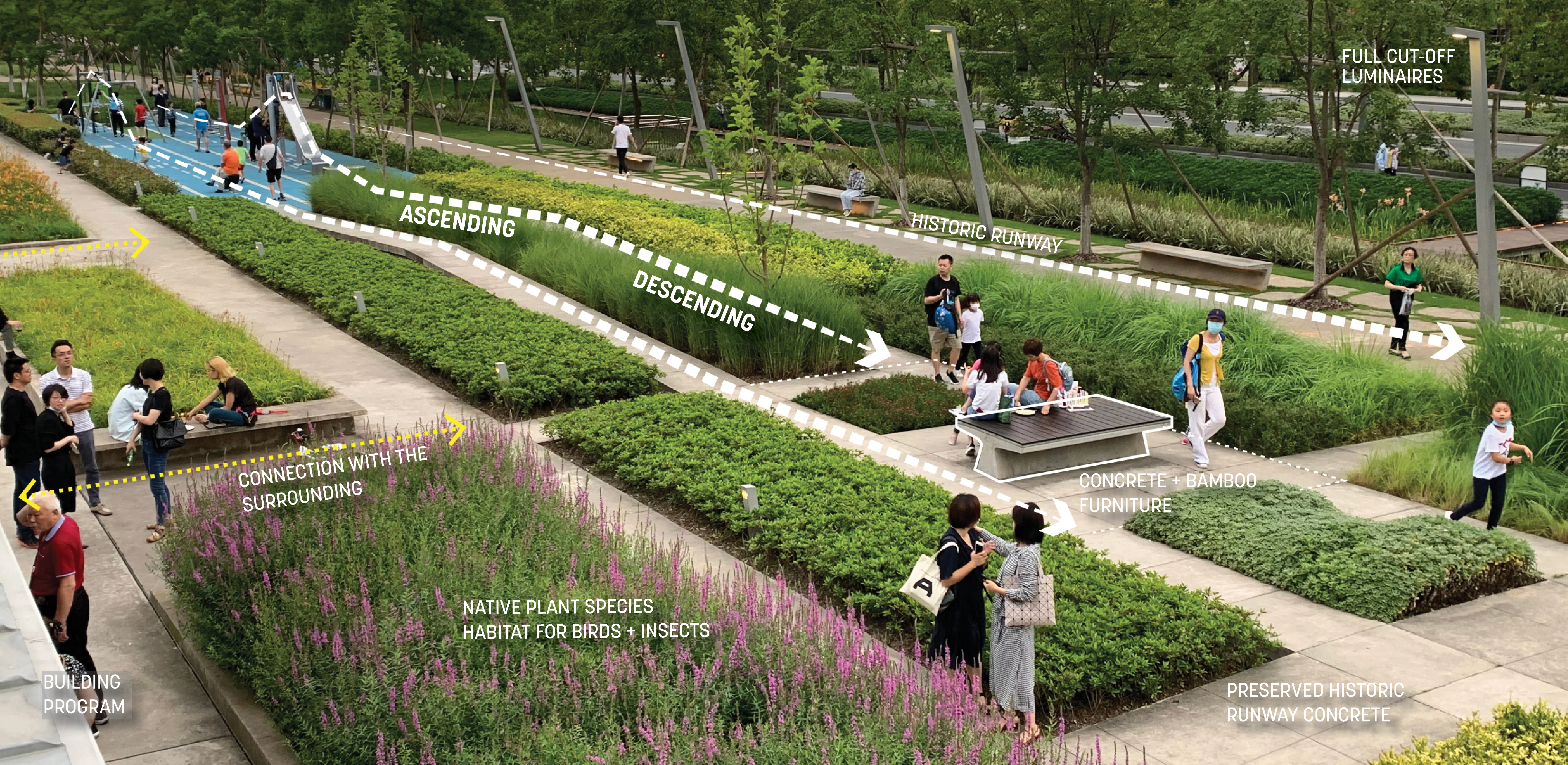 Abundant wildlife habitats are integrated with the landscape, with 100% of plant species in the park native to the Yangtze River Delta. These habitats include both land and marine typologies, representing a total of 82 plant species. Of those, 2,227 new trees were planted on site, with Trident Maple as the iconic tree species delineating the alignment of the preserved runway panels. Deciduous trees shade over 68% of the park’s hardscape, providing a comfortable microclimate while reducing the urban heat island effect of this post-industrial site.