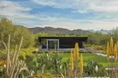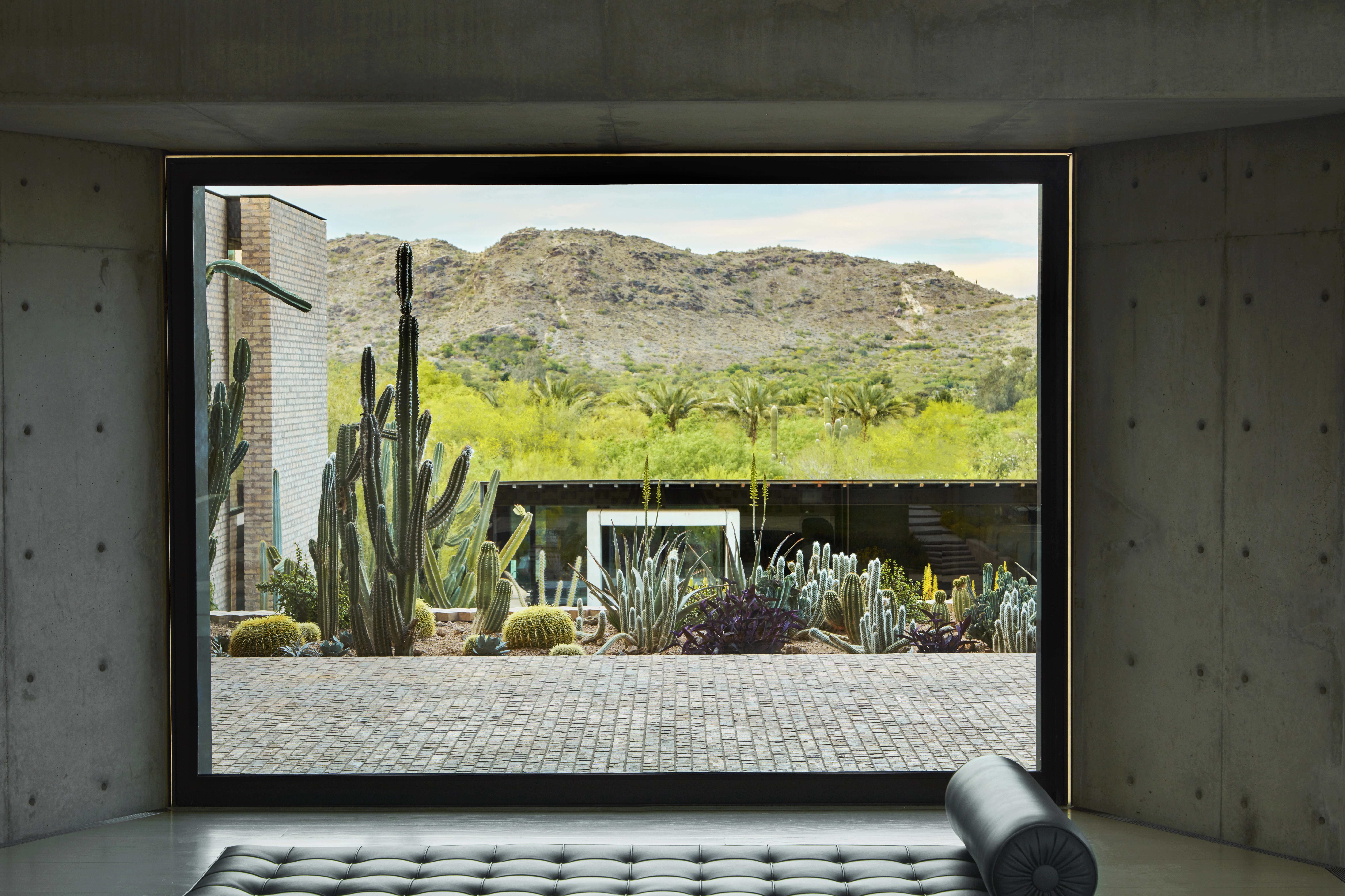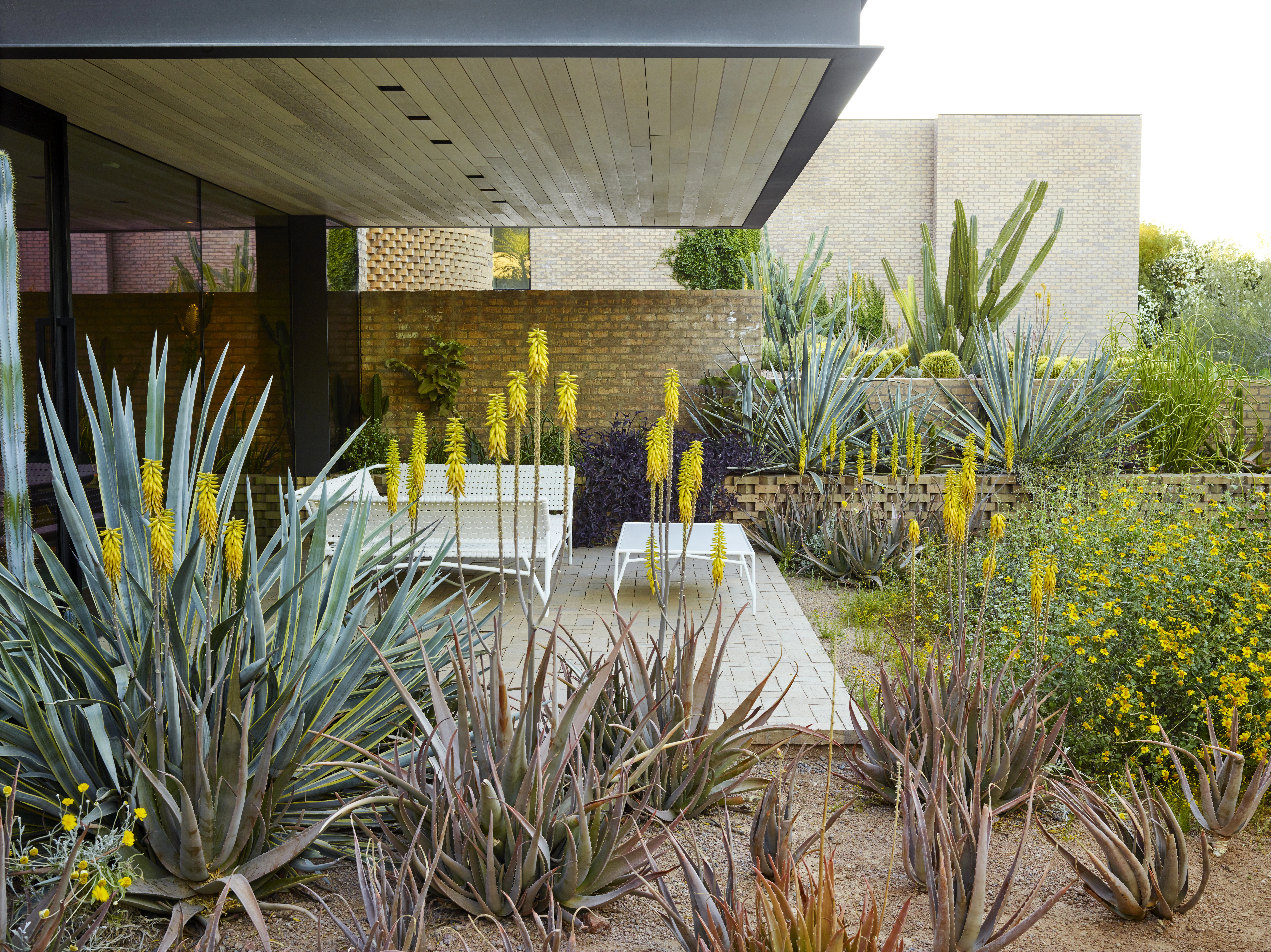 Floor to ceiling glass windows generously bring the garden views into the house and make indistinct the line between indoor and outdoor. A majority of specimens can thrive on rainwater alone after establishment, require no fertilizer, little to no pruning, and conversely provide a rich and lively habitat for a multitude of wildlife. The small citrus grove, one of Arizona’s five ‘Cs’ (Cotton, Citrus, Copper, Cattle, Climate) boasts different cultivars of citrus trees, each providing sensory enjoyment when in bloom; their bountiful fruit is donated to local homeless shelters.