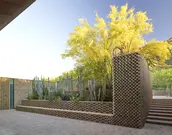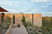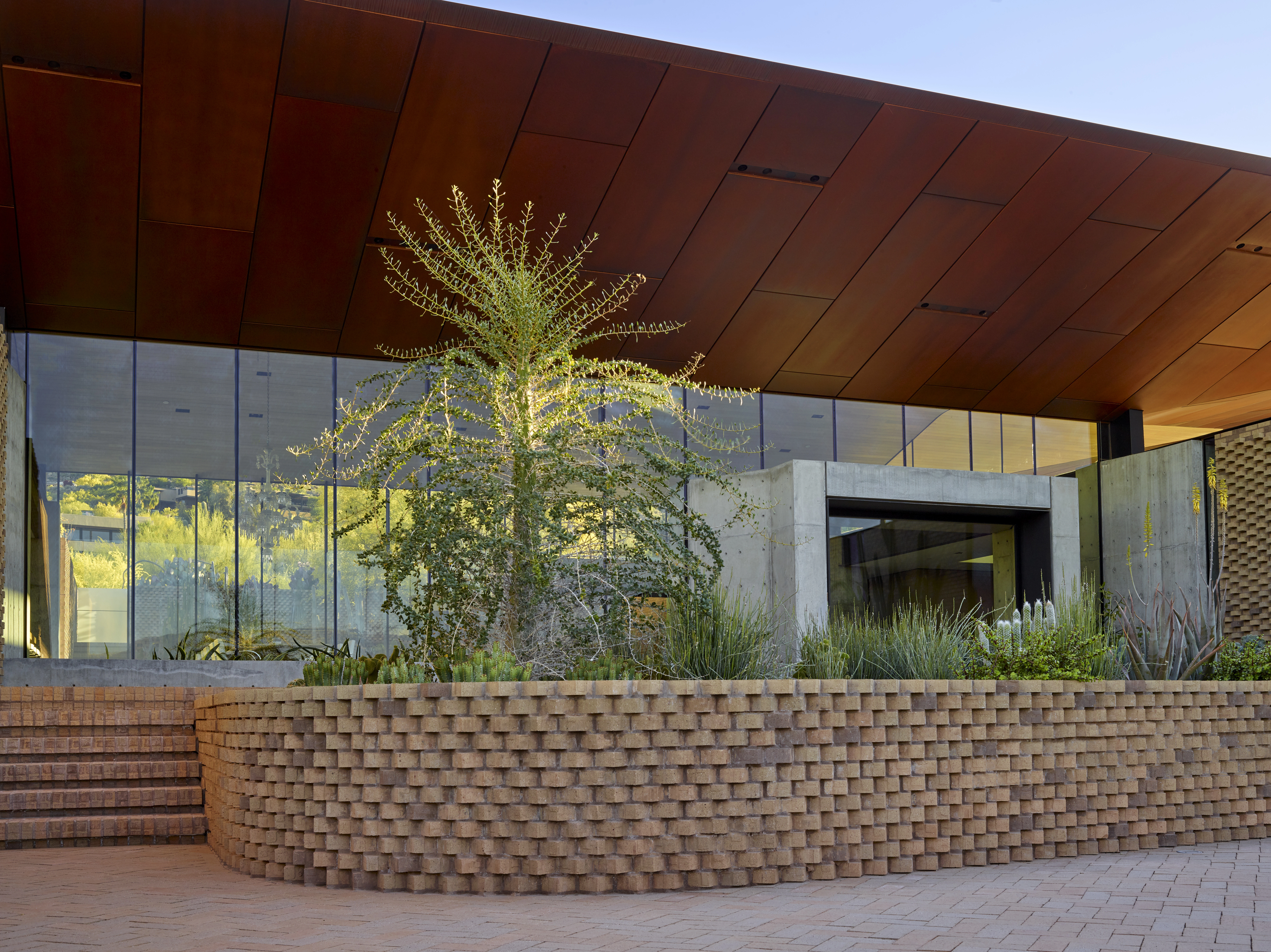The entry sequence from Dragoon Lane begins through a rusted steel gate and screen wall, down a decomposed granite drive through a Palo Verde bosque. Salvaged from the site, a boulder outcropping sprinkled with prickly pear form a berm retaining soils at the driveway and screen the house. At the entry auto court permeable brick pavers allow for water infiltration. A large brick sculpted planter wall draped with Octopus Cacti Stenocereus alamosensis separates the entry courtyard and auto court.