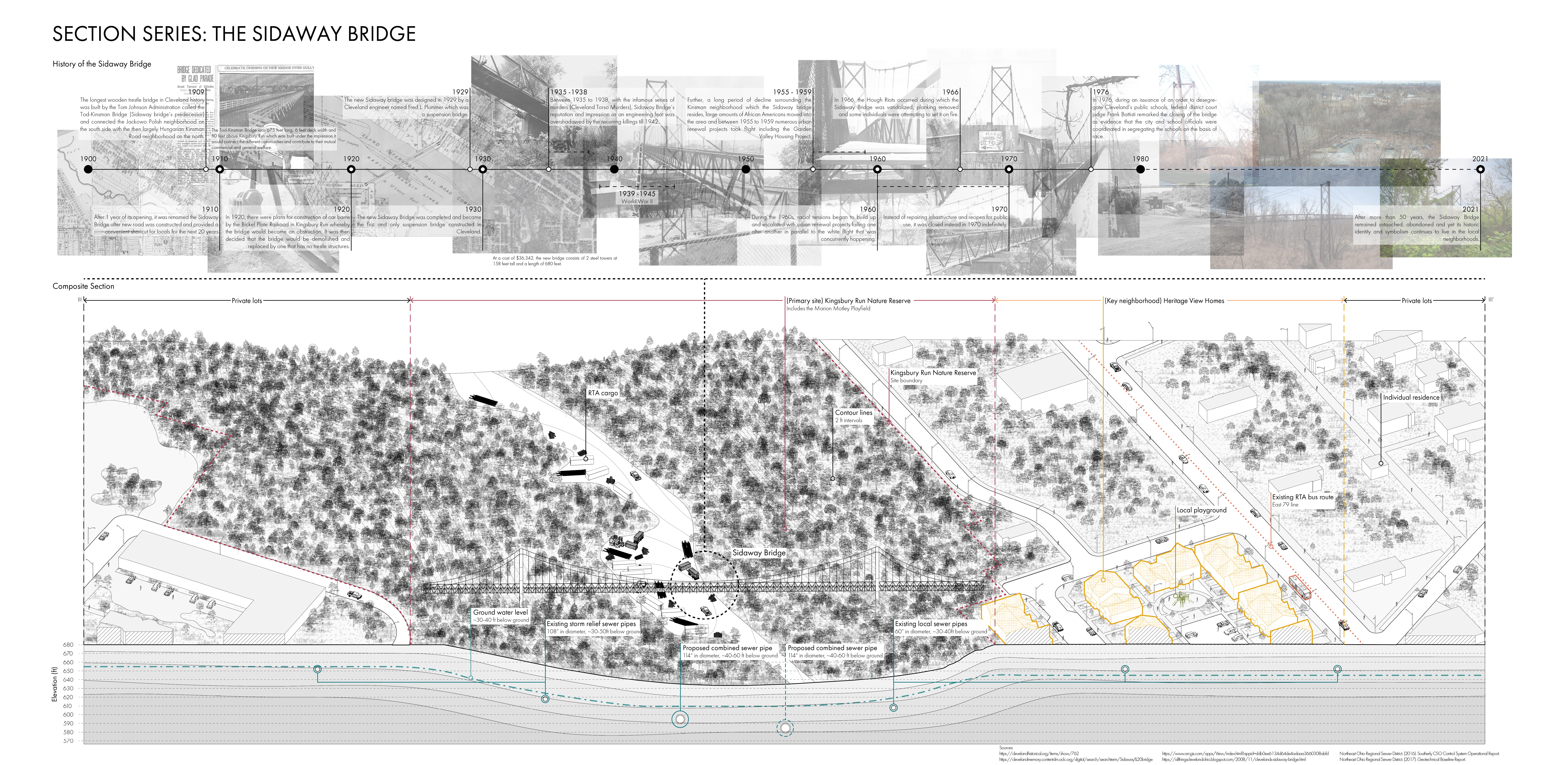 Through 3-dimensional deep sections, site scale analysis was carried out unfolding the intricacy of spatial relationships and landscape systems that would not be visible, legible in other previously used sales. Using sectional diagrams, it revealed the geography of the site by which soil contamination remains an issue requiring treatment, the opportunities for ecological enhancement thereby promoting sustainability, the topographic orientations and potentials for hydrological interventions that build resiliency, but also the historic heritage of the Sidaway Bridge that cuts through the site, potentials of reconnections, diversification of programs to make a profound impact on the surrounding communities.