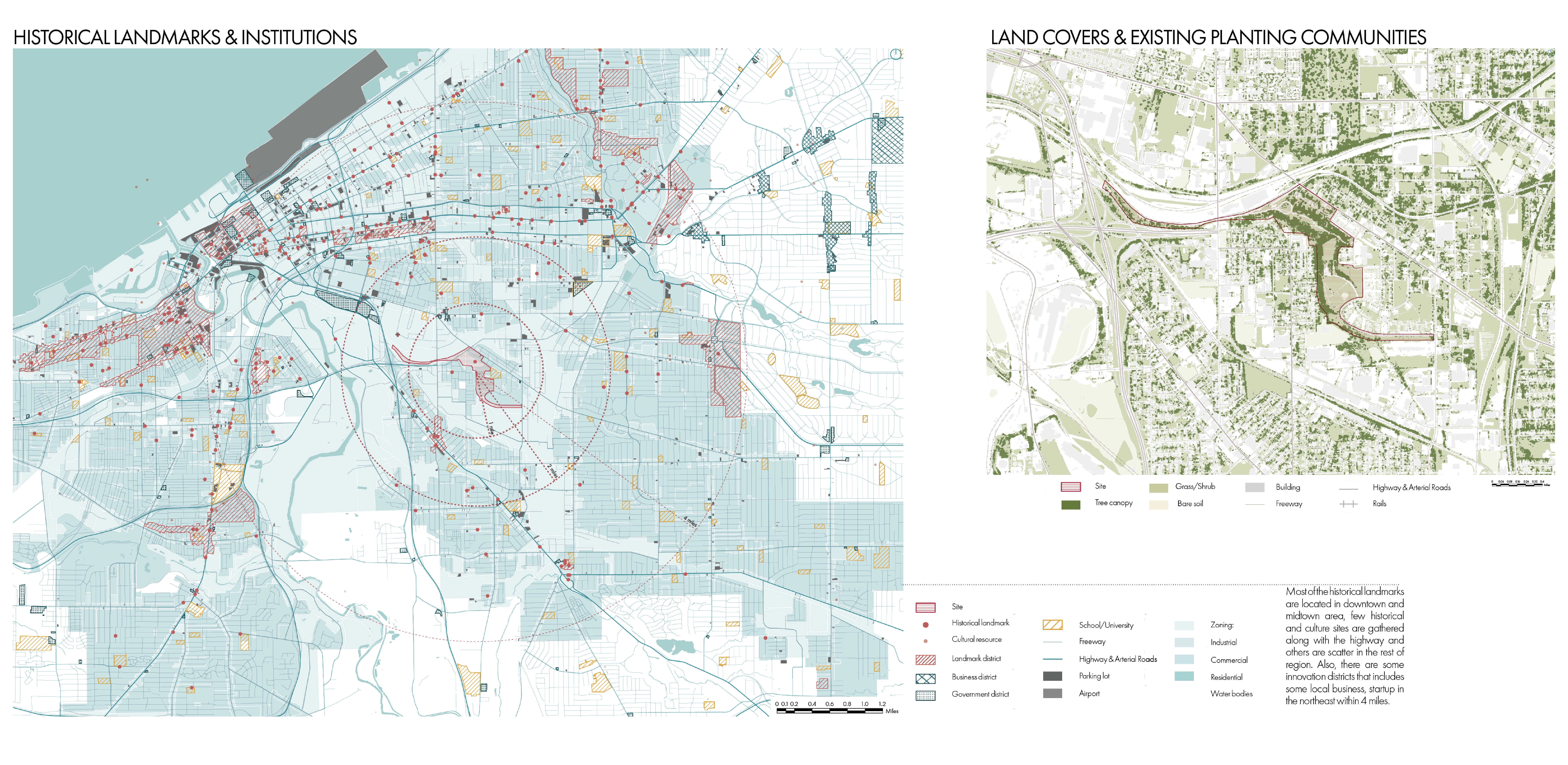 Kingsbury Run Nature Reserve: Collective Re-imagination began its journey with a task, and that was the proposition of a new future for the site in its services for the surrounding neighborhoods. Located in Cleveland, Ohio, the site has gained considerable attention during the last 10-20 years in redevelopment schemes for improving the local communities given their past mistreatments from environmental injustice, toxic dumping in the site that posted serious health hazards for the inhabitants living directly next to it. But also, to fulfill the promises from urban renewals around the site that never came to be as advertised. In order for us to gain a deep understanding of the site, a dive into the analytical approaches in revealing existing contextual complexities was made before engaging in discussions with local stakeholders for meaningful community engagements. Through robust and rigorous site investigation and documentation research, a holistic methodology to “know” the site and the people was developed. And by the exploration into the different systems, their interrelationships, combined with active conversations with stakeholders concerning the prospects of the site’s redevelopment, the rich analytical exercises helped in conceptualization of the project such that it is highly performative, functional and dynamically experiential.