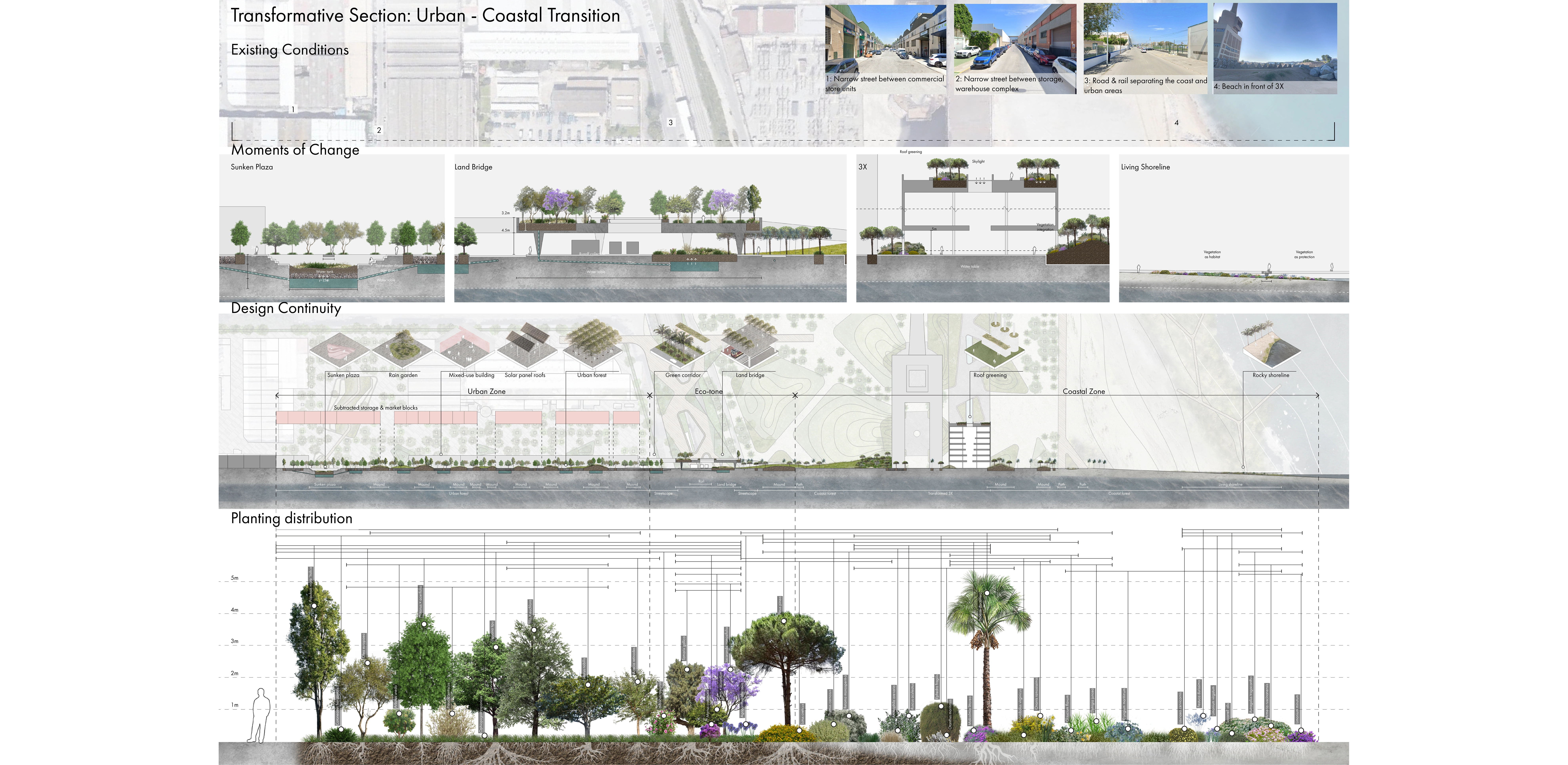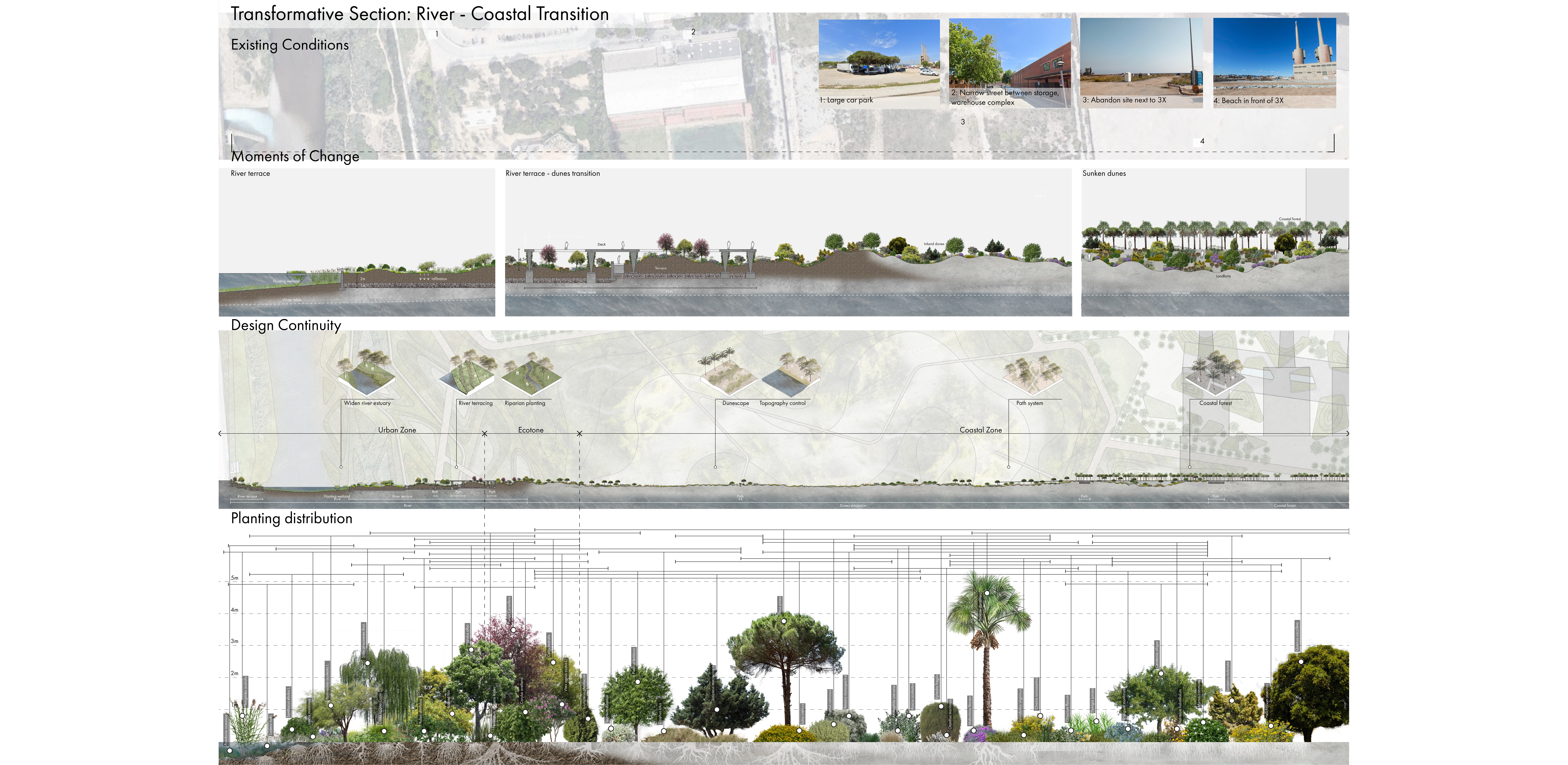 From these typologies there is a level of hierarchy in which some modules are more extensive and instrumental to the overall design of the region such as the dunes simulation, the networks of water tanks and stormwater drainage system that connects the 3 zones, river terracing and sunken plazas that has a diverse set of performative qualities serving as retention ponds but also Mediterranean rain gardens with vegetation. These became the building blocks, the assemblage of the design that begins to build resiliency with anticipation of flooding and sea level rise from climate change but also promote sustainable development that active integrates and enhances local biodiversity while at the same time provide a robust site programming that enables diversity and inclusion.