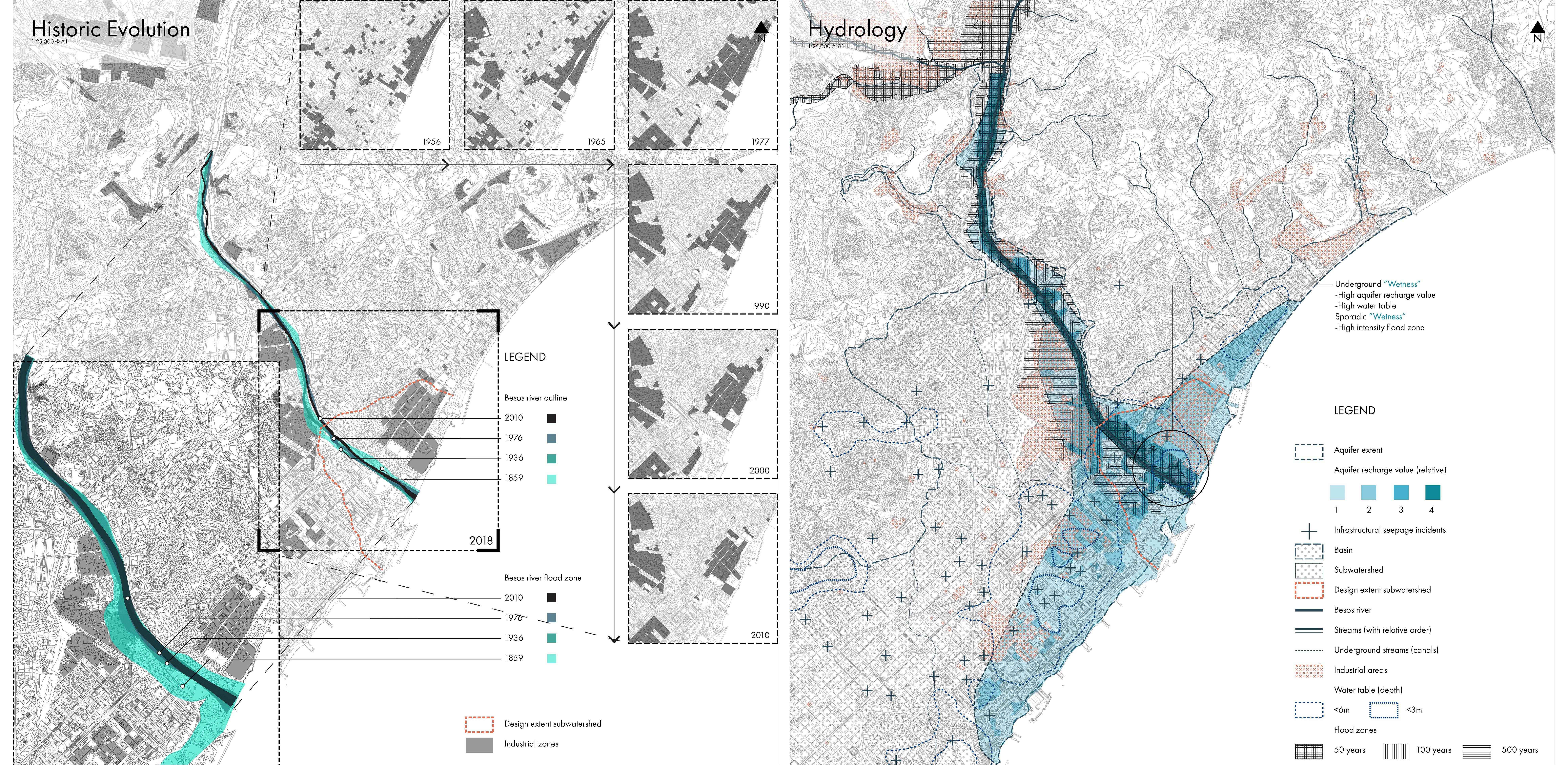 This project in its ambition to tackle complexities in the wicked problem of undesirable “dryness” that persists in Barcelona’s postindustrial waterfronts and urban fringes, aims to leverage the concept of “wetness” in its various interpretations and representations in order for reimagination of a better future by building resiliency, vitality and adaptability. Through rigorous cross-scale analytical processes to unfold the multidimensional existing qualities surrounding the site and its larger regional settings, a robust design inventory and strategy systems through typological investigation as well as articulated spatial manipulation, orientation are distilled to address issues at hand. In its essence, the design uses a diverse yet interconnected set of tools in an attempt to reach a level of comprehensivity that begins to resolve the different “dryness” in social, economic, ecological, geographical and infrastructural terms under a dynamic urban scale inclusive of a waterfront, riverscape and urban center. It is a design by inquiry, through research, realized via investigation, expanded from exploration and projection.