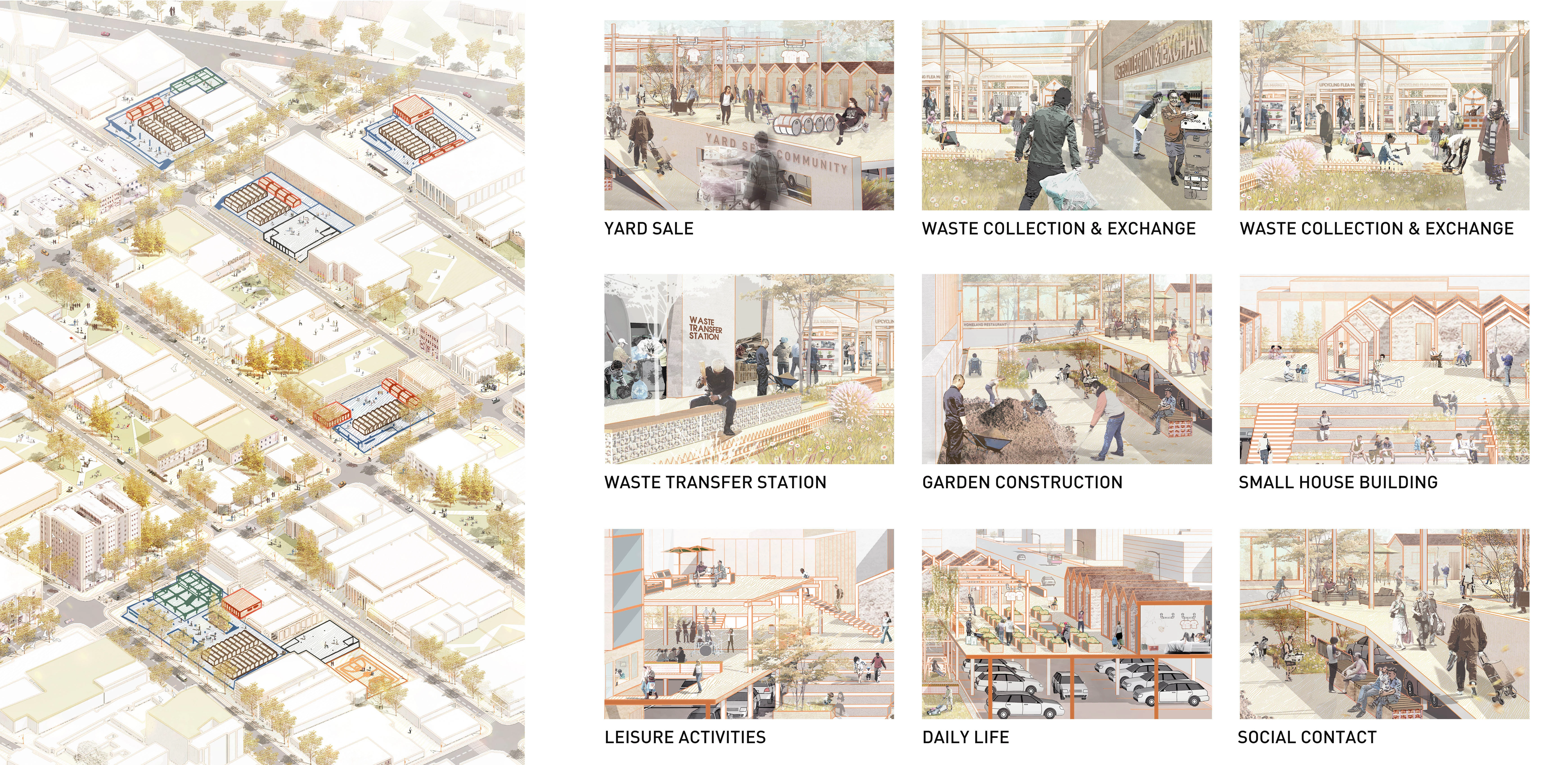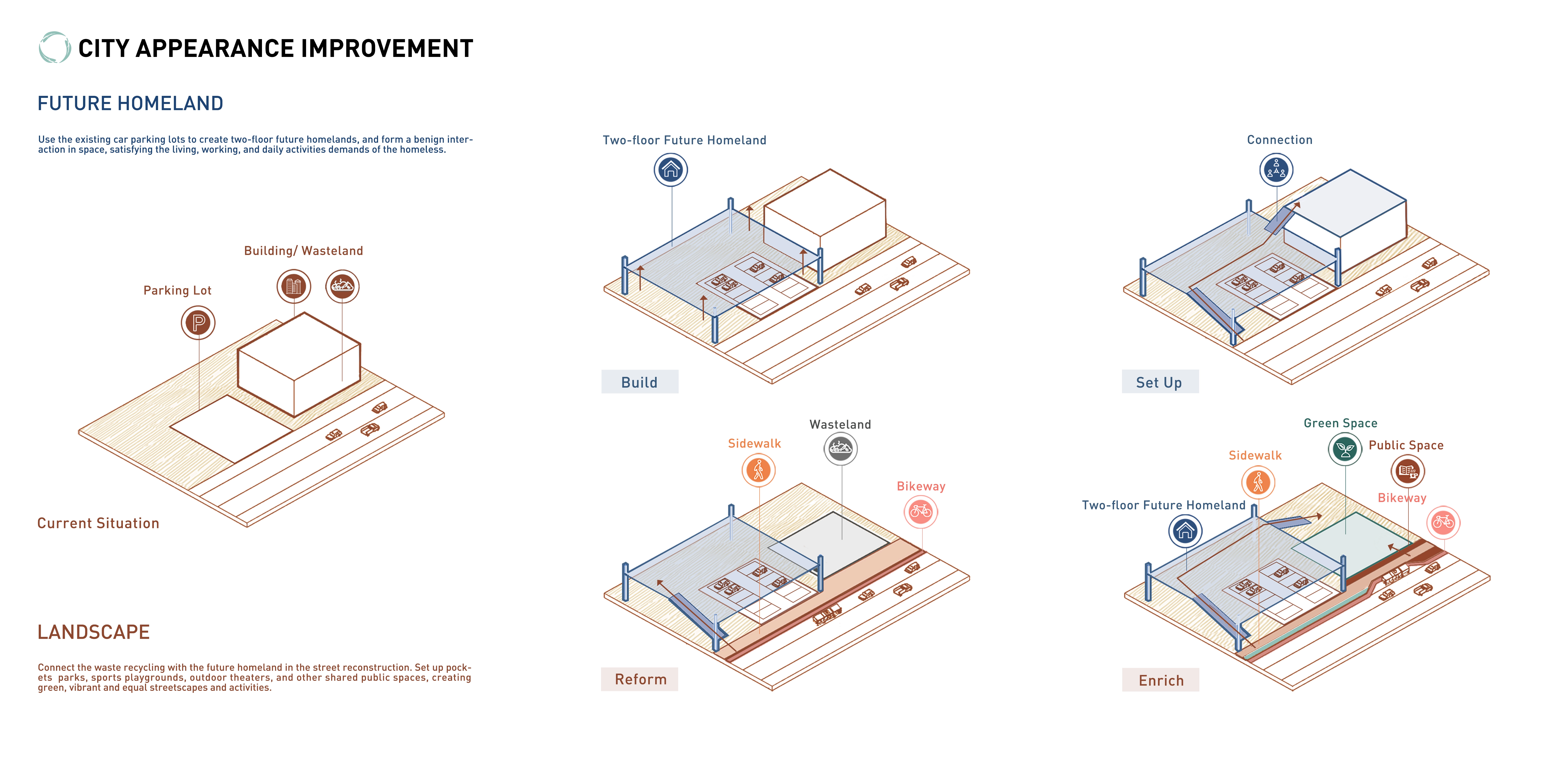 The project establishes on-site waste disposal and reuse mechanisms, and builds the future homeland, trying to reuse the waste to create accommodation and reform public environment based on existing one-floor parking lot, wasteland, and surrounding buildings. These strategies respond to the problems of tents occupation and waste dumping ingeniously, which also replies to 'zero waste Los Angeles'. In the meanwhile, it provides homeless people with dwellings and job opportunities, restore regional landscapes, and create a benign cycle of diverse social activities to reshape healthy, balanced and sustainable development for urban landscape and social relations sustainably.