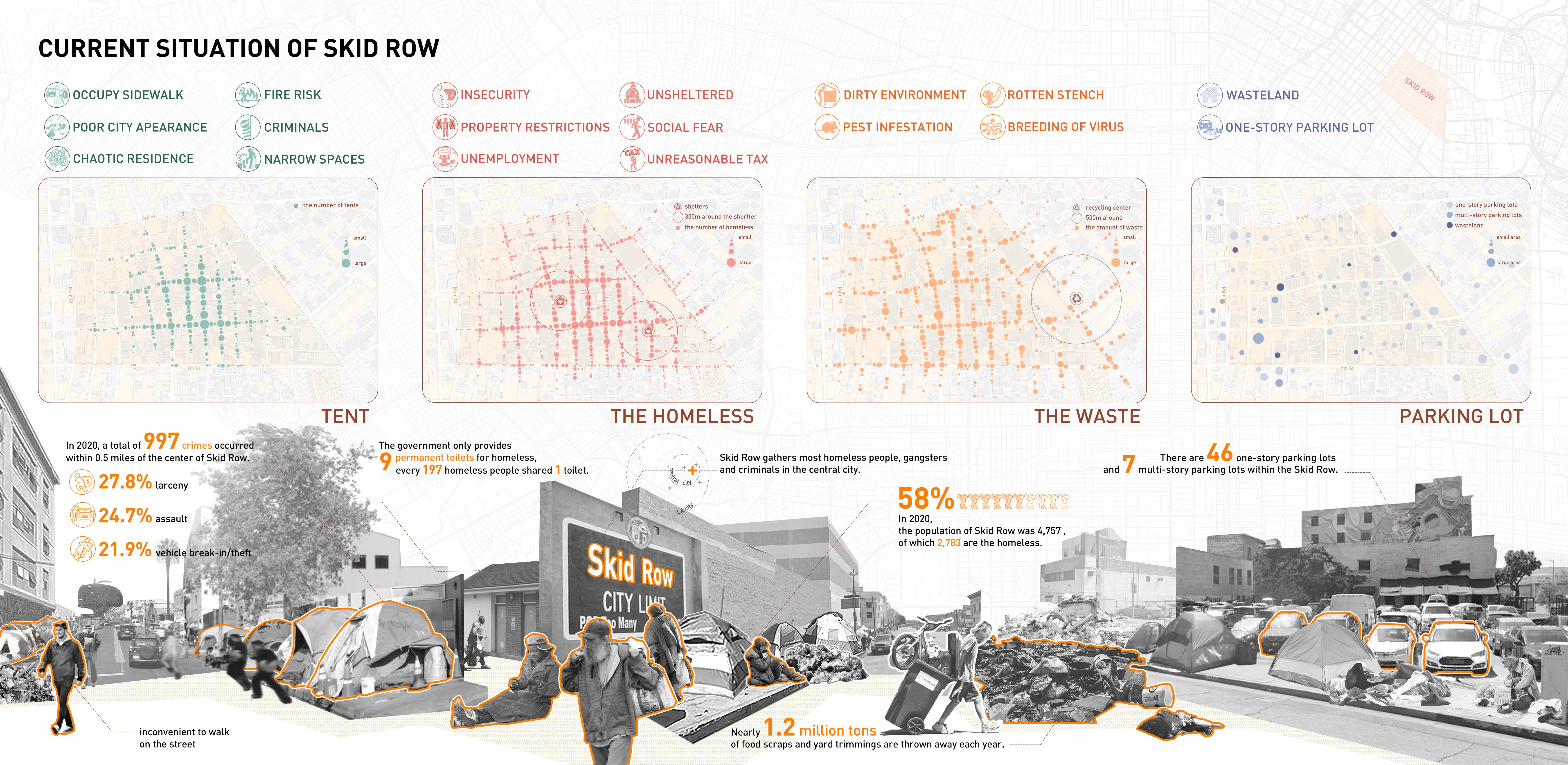 69% of the homeless in Skid Row are 18-62 years old, most of them are mentally normal and have a certain ability to work. The main reason for their wandering is the lack of skills or ways to re-enter society and the difficulty of getting rid of poverty. It's obvious that the living environment of homeless people and the problem of street waste jointly limit the development of regional public health, environmental landscapes and social relations. The project believes that the response to the complex problems should be effective both in the near future and long-term. That is to establish on-site waste disposal and reuse mechanisms, improve city living condition and urban scape, offer a series of stable work for the homeless, thereby reshape a healthy, balanced and sustainable development for urban landscape and social relations.