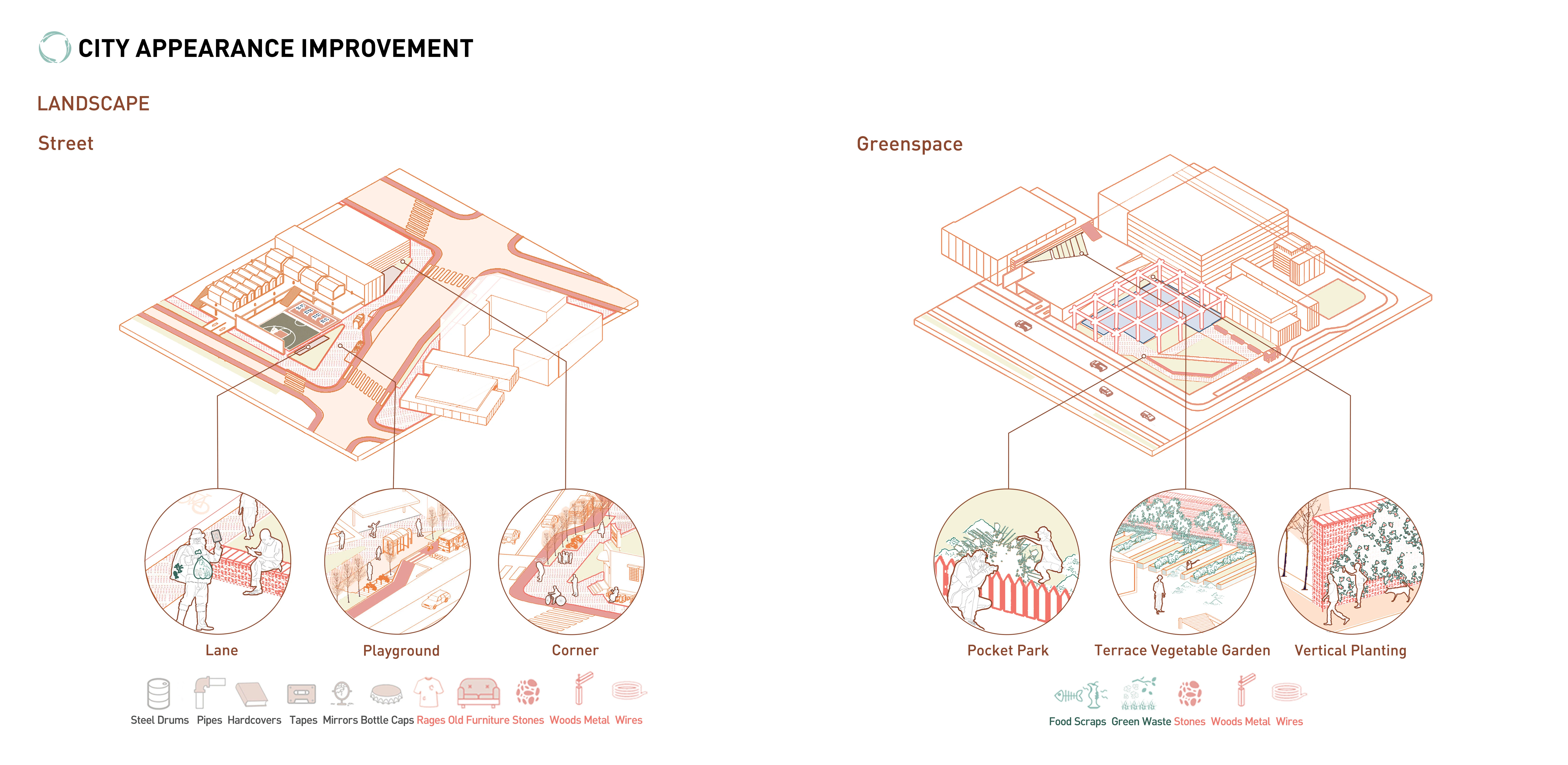 Reconstruct streets and public spaces based on the status quo to enrich the streetscape and public activities. In the street reconstruction, the waste recycling would be fully as well as the street furniture, fertilizers, artworks, etc., connecting with the future homeland to form a community-greenspace-public activity space-walkway-cycling lane vehicle structure hierarchy and set up pocket parks, sports playgrounds, outdoor theaters, upcycling flea markets and other shared public spaces, creating green, vibrant and equal streetscapes and activities.