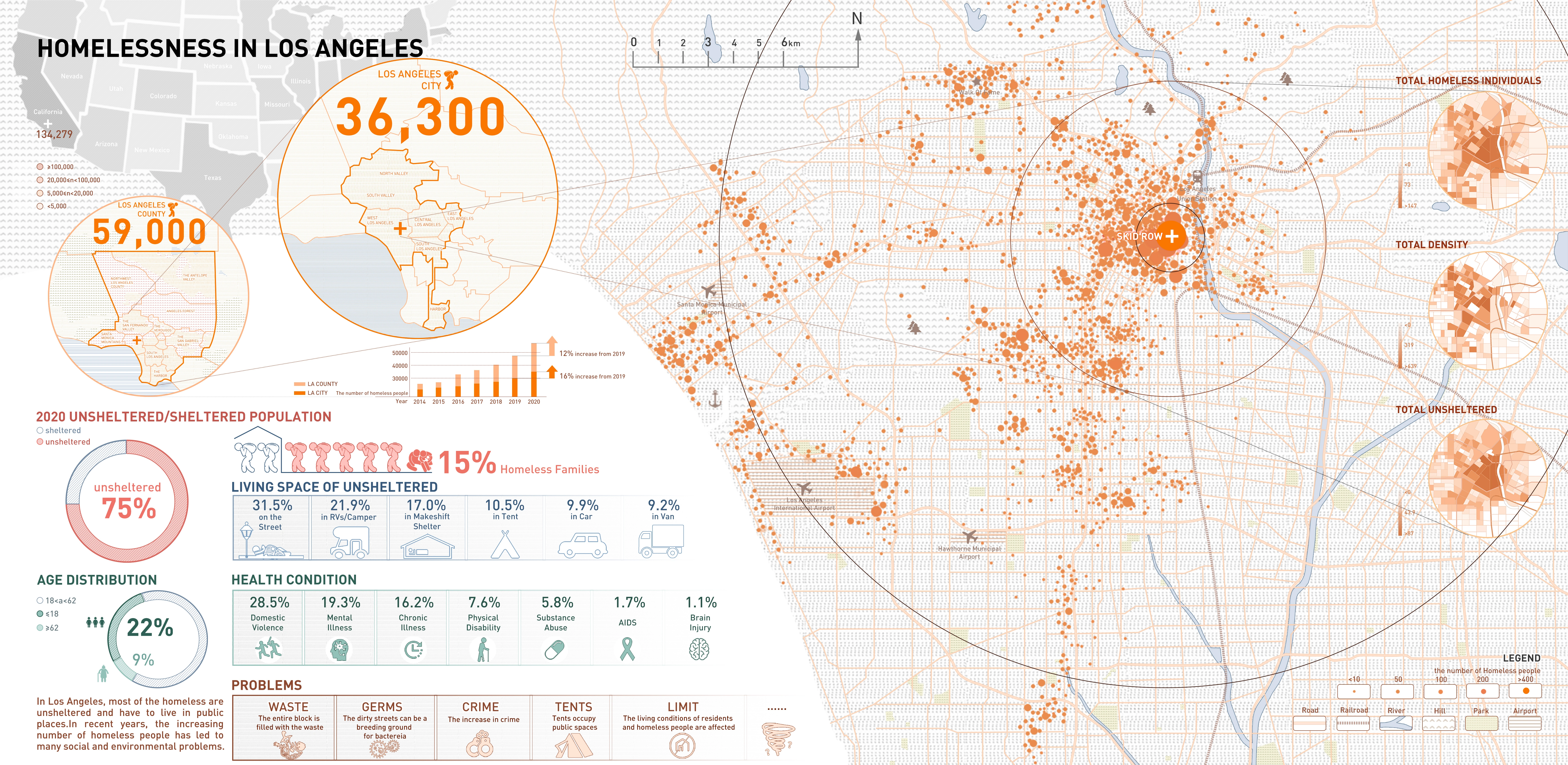 Starting in 1970, a large number of homeless people began to appear in Los Angeles. The number of the homeless has continued to grow significantly, reaching 36,300 in 2020, accounting for 61.5% of Los Angeles Counties' population. The city center Skid Row is one of the largest homeless gathering places in the United States. They set up tents in the streets and occupy a large number of free parking lots or other public spaces, which has seriously spoiled the cityscape and brought more crimes. Local government officials have been working hard to balance the homelessness issues with urban development needs. For example, the street sweeping operation started in February 1987; the Homeless Property Restriction Regulations in 2016, hoping to reduce the number of street homeless people; in 2017, a tax of $4.6 billion was levied to build houses (10,000 houses can be built within ten years), supporting the homeless; 'LIFT Act' provides up to $6,000 tax credits for low- income working families; May 2018 'Permanent Supporting Housing Regulations' took effect, shortening the time for homeless people to get housing. However, the various measures did not achieve the expected results, and even exacerbated the homeless' fearing of the governors, uncompromising of residence policy rules, and mistrusting of the government. Today's Skid Row is not only covered with tents, but also surrounded by waste, which causes more commuting, health, and security problems for local residents. Combined with the perennial heat and humidity of Los Angeles, the rapid growth of germs has become a major threat to the regional environment and public health, which further aggravating the conflicts between homeless people, residents and governments.