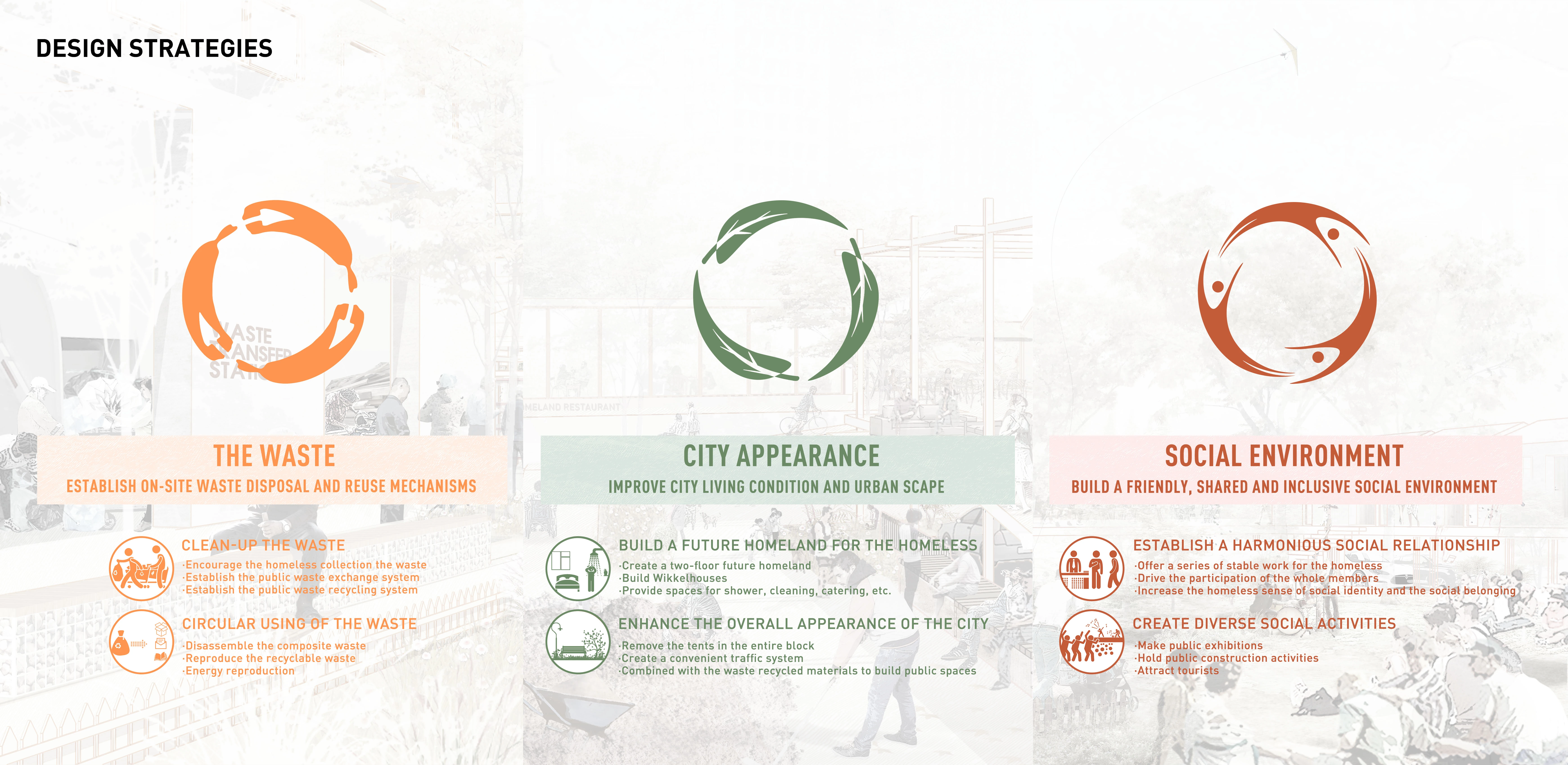 Responding to the problems of tents occupation and waste dumping, the project establishes on-site waste disposal and reuse mechanisms, and builds the future homeland, which will make joint effort to rehouse the waste and the homeless. Furthermore, it will provide homeless people with jobs. Los Angeles county is expected to achieve zero-waste by 2030. There will be no makeshift shelters on streets, and the homeless will have work to do, the crime rate will be reduced in the long run. The project will reshape a healthy, balanced and sustainable development for urban landscape and social relations sustainably.