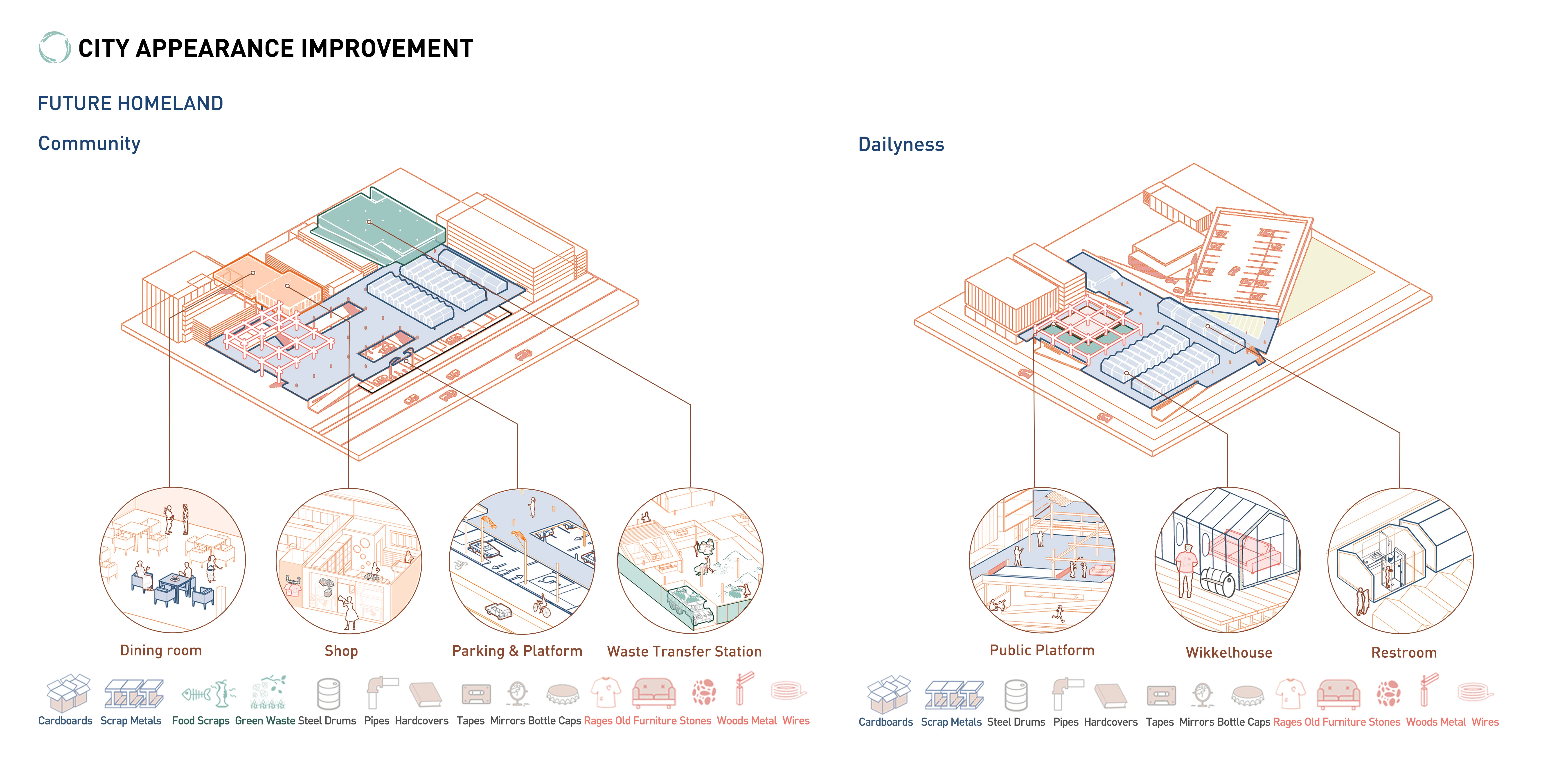 In the process of waste recycling and the construction of future homeland, the participation of homeless people in social activities would change public's stereotype of them. Among them, short-term social activities are mainly street waste collection, collection of residents' waste and waste sorting, combined with the waste recycled materials to build public spaces, Wikkelhouses and various daily necessities to help improve the appearance of the city; after establishing a certain amount of public space, some public activities can be reformed to job opportunities for homeless people, such as waste sorting and recycling activities.