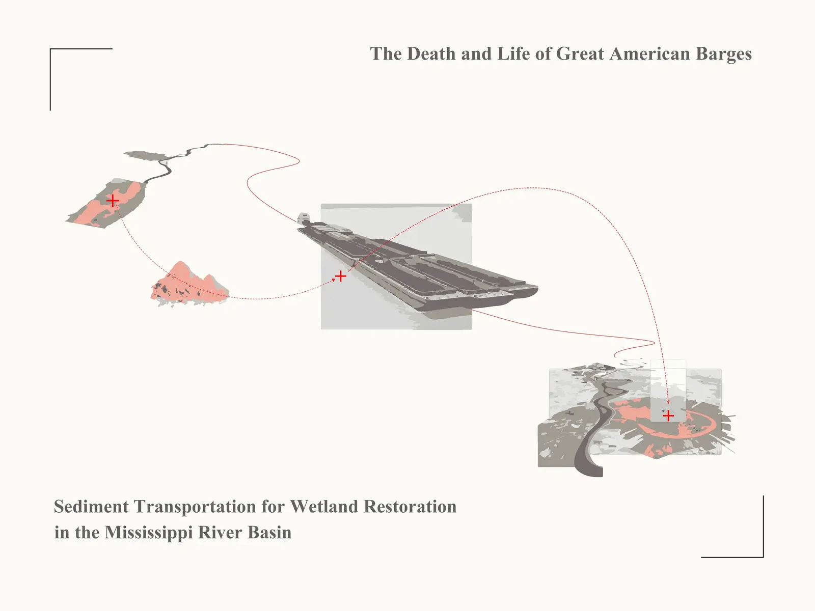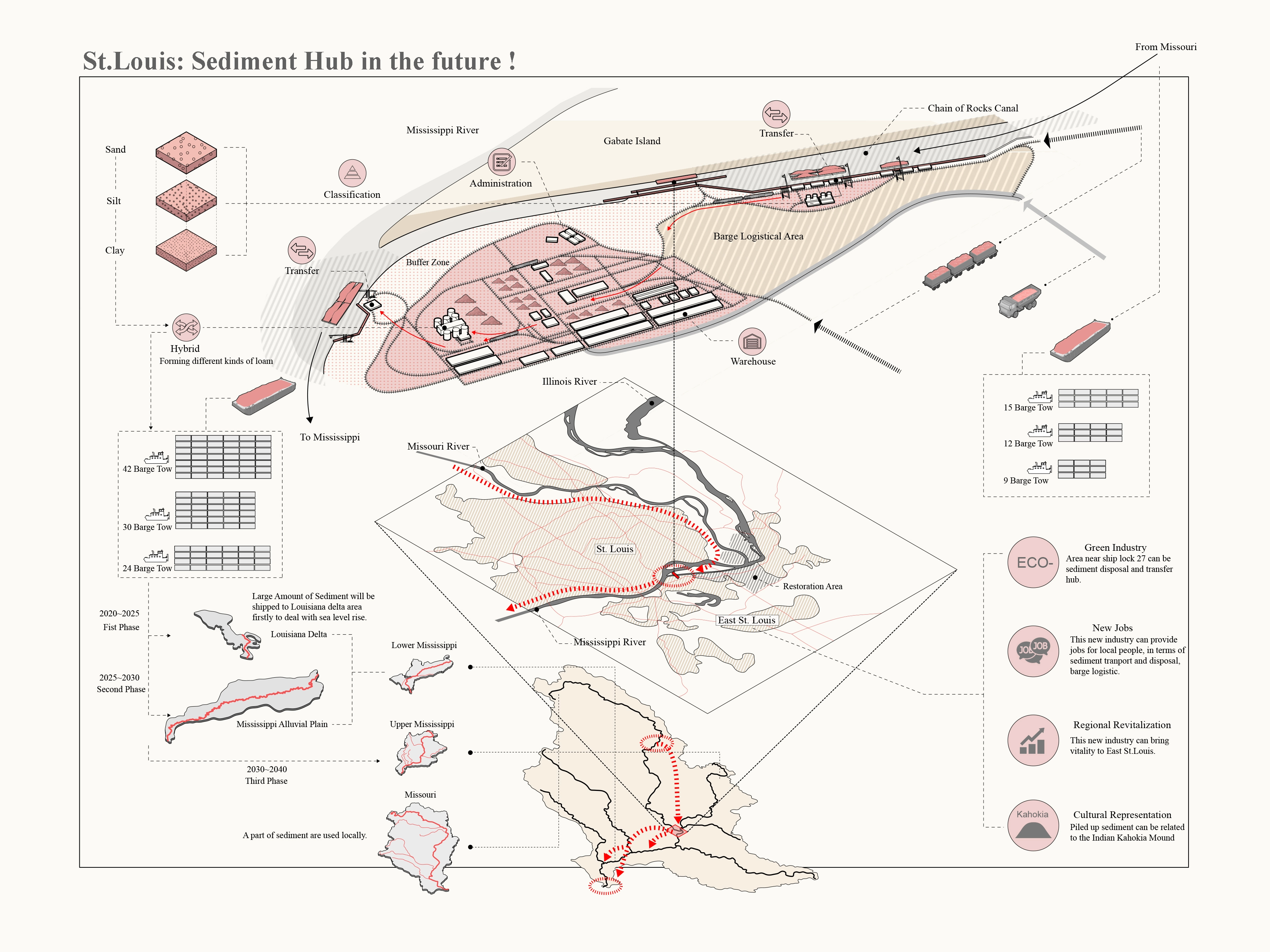 The Mississippi River is the primary navigation and shipping artery of the United States’ heartland, connecting croplands and communities. Throughout the past two centuries, locks and dams were constructed on the Mississippi river to maintain waterways for inland navigation. Levees were constructed to protect croplands and towns, thereby securing economic growth. But this “20th century” mode of development is not sustainable anymore. Due to dams, the free flow of sediment transport in the river has been drastically reduced. Flooding has become one of the major ecological challenges impacting the Mississippi River Basin. The combinations of floodplain developments, bigger levees and the negative effects of climate change lead to flora and fauna deterioration and economic damage to communities. This strategy proposes adapting the barge industry regime to transport trapped sediment to restore riverine wetlands, in turn creating a resilient, ecological, multi-use flood buffer zone along riparian zones and floodplains. The project proposes a compensation mechanism coupled with a step-by-step approach, to tackle emerging environmental issues and help traditional industries transition to a new era.