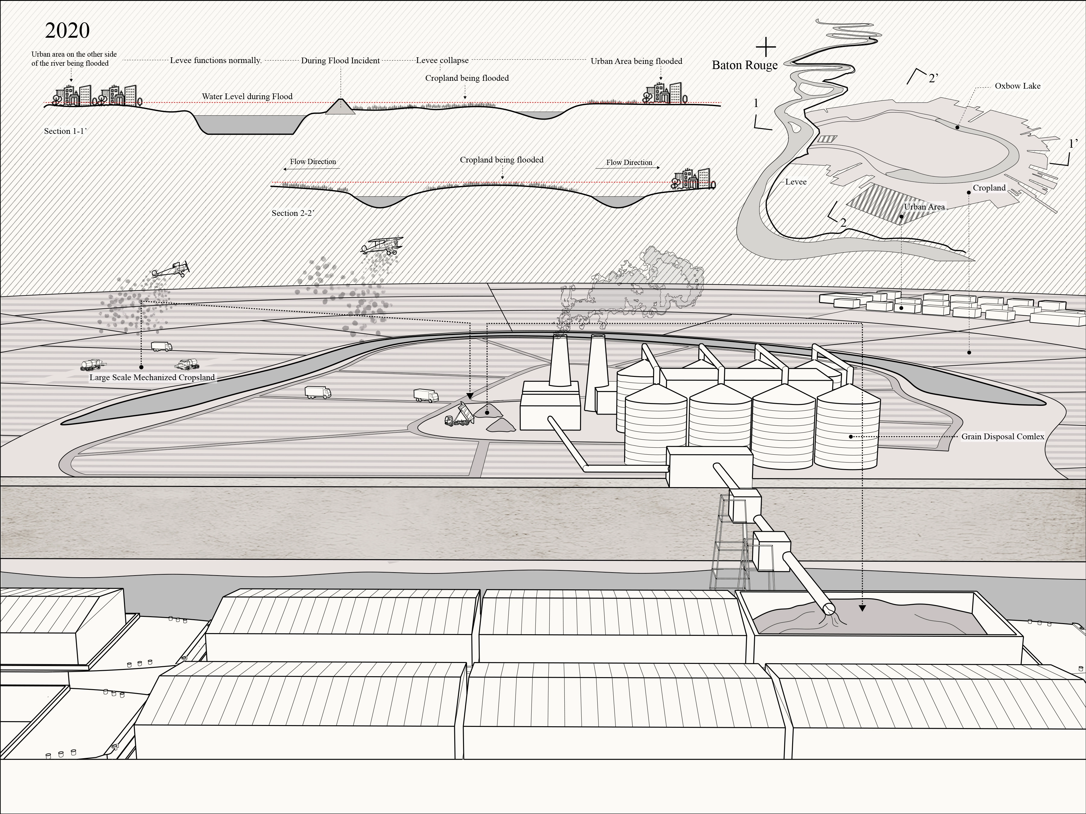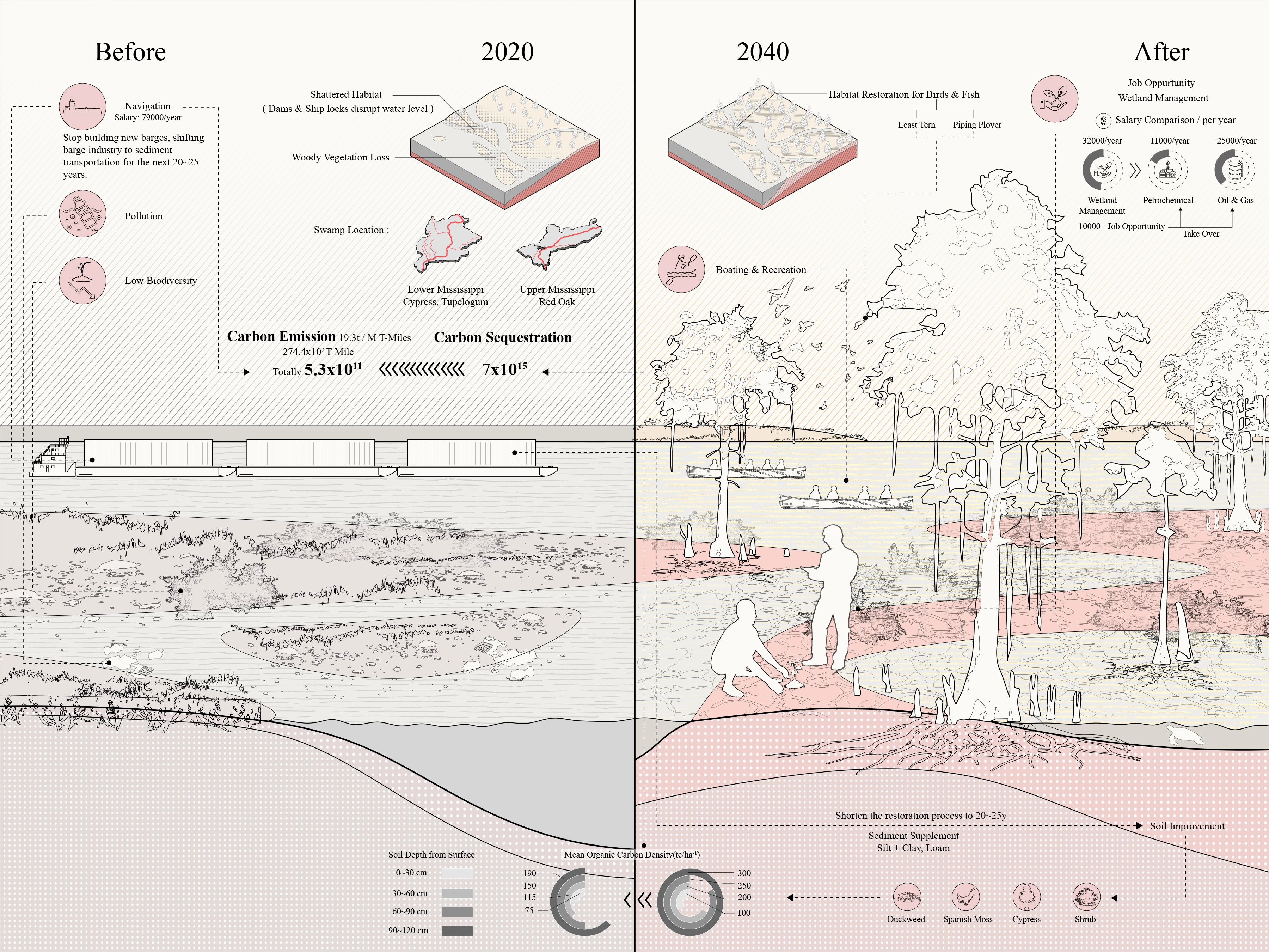 Climate change and economic inequality have deep influence on both social and ecological environments globally, especially in recent decades. Because of people’s endless exploitation of resources and land for the development of human society, anthropogenic disasters such as sea level rise, subsidence and flooding and storm surge cast huge shadows on riverine and coastal communities. Social inequality also shifts the harm of these environmental disasters onto people living in disenfranchised conditions. Now, it is the time to call for a more ecological and sustainable development mode for entire river basins. Besides the environmental importance proposed by this project, it is also a response to the call for new infrastructure plans for the United States, as a reasonable option to switch the old riverine development mode to an ecologically based new one. It not only proposes environmental beneficial, but also brings new job opportunities to local communities, which hopefully can help close the social inequality gap in the United States’ heartland.