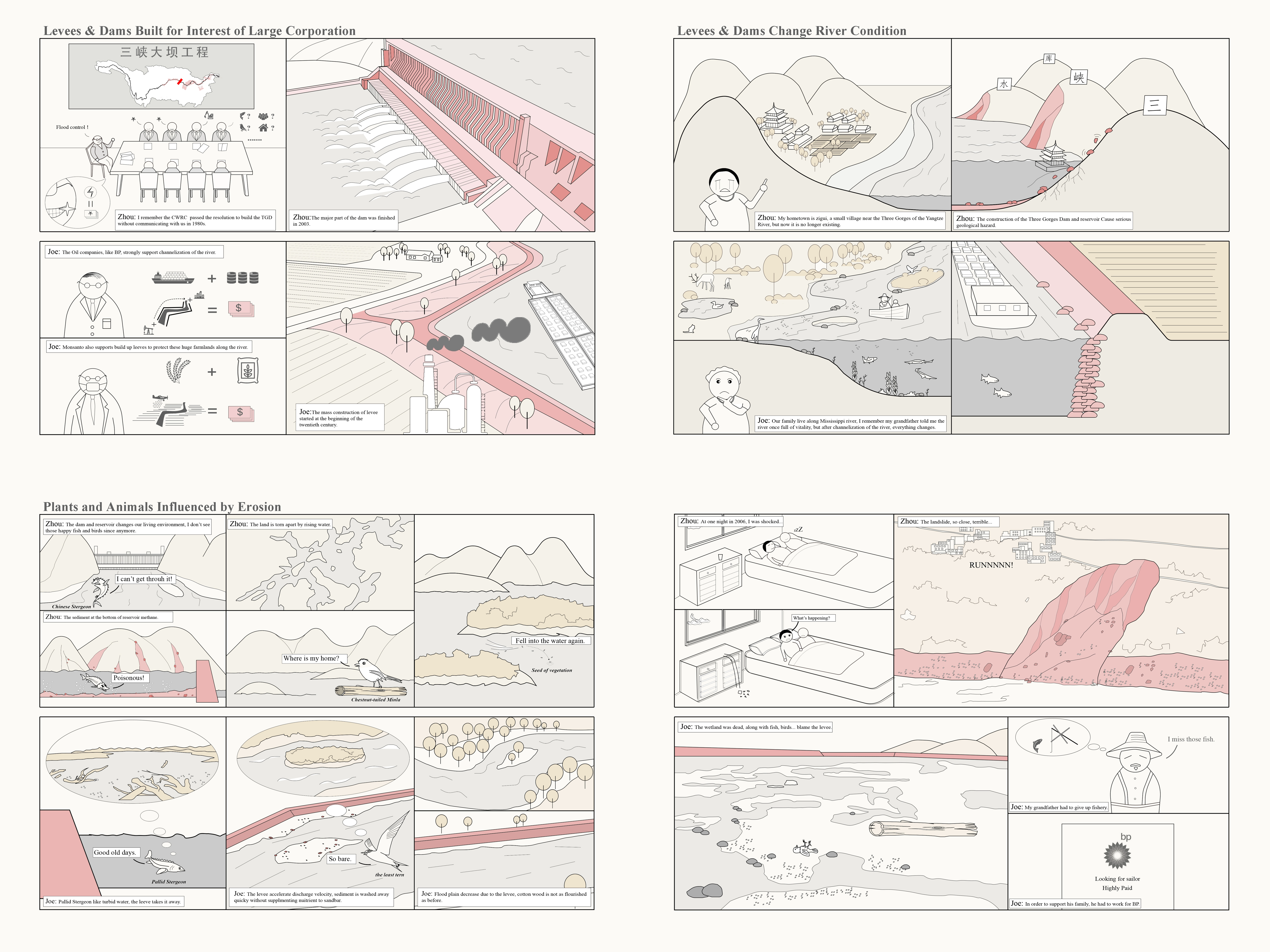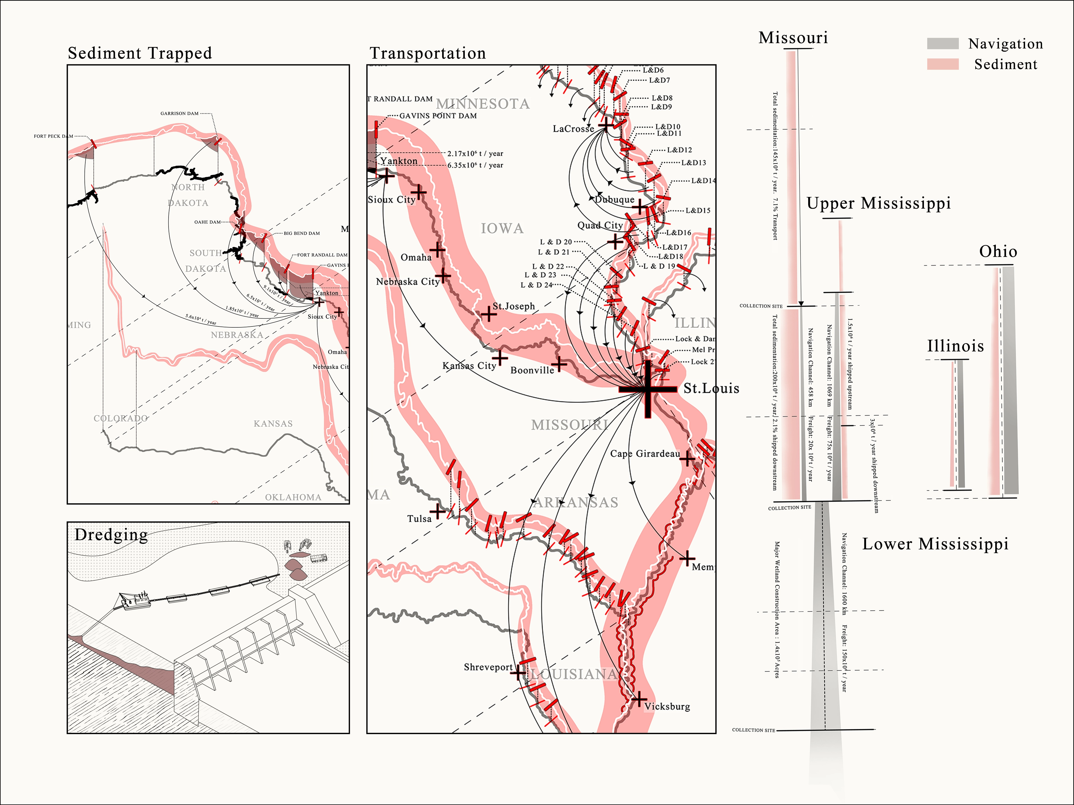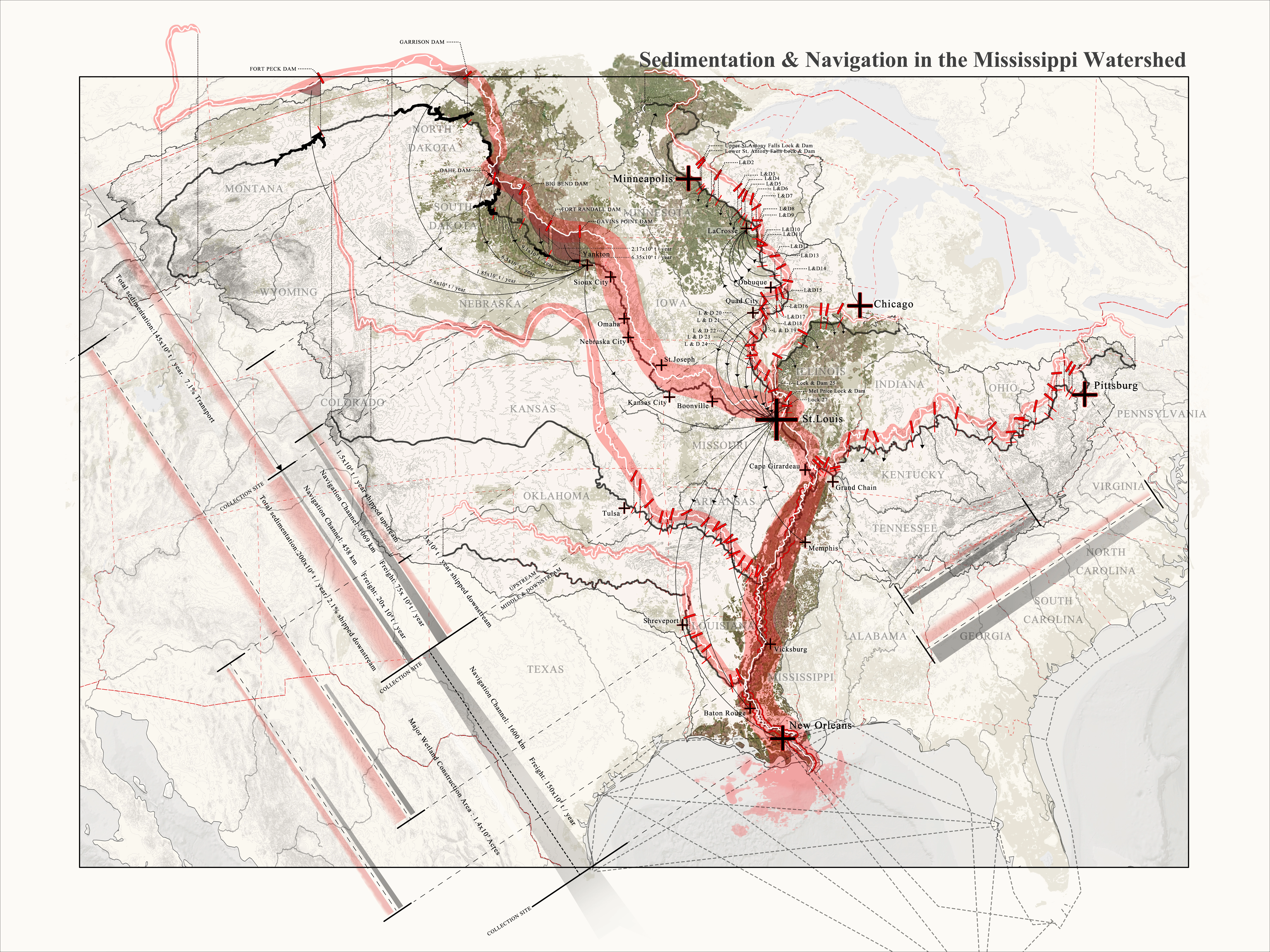 These locks, dams and levees negatively impact local and regional ecologies, and of course scale up to global scales economically. As such, this project not only analyzes the functions of locks, dams and the barge industry and their environmental influences on the Mississippi River Basin, it importantly analyzes comparative contexts globally, specifically the Yangtze River Basin. The Yangtze is also a highly-engineered system, and suffers from similar frequent and damaging flood issues as the Mississippi. In order to better understand how the ship locks and dams work and how they influence the ecological environment in the Mississippi River Basin, as well as in other river basins in the world, this project speculates a cooperation with the US Army Corps of Engineers (USACE) for new research and monitoring of locks and dams in the Mississippi River Basin, as well as the Changjiang Water Resources Commission (CWRC) for research on floods and dams on the Yangtze River Basin. After research and analysis, a similarity of problems affect locks, dams and levees in both the Mississippi and Yangtze River Basins, more particularly river bank erosion and trapped sediment behind dams. The proposal on the Mississippi river could be an example for those suffering from the same issues in the world.