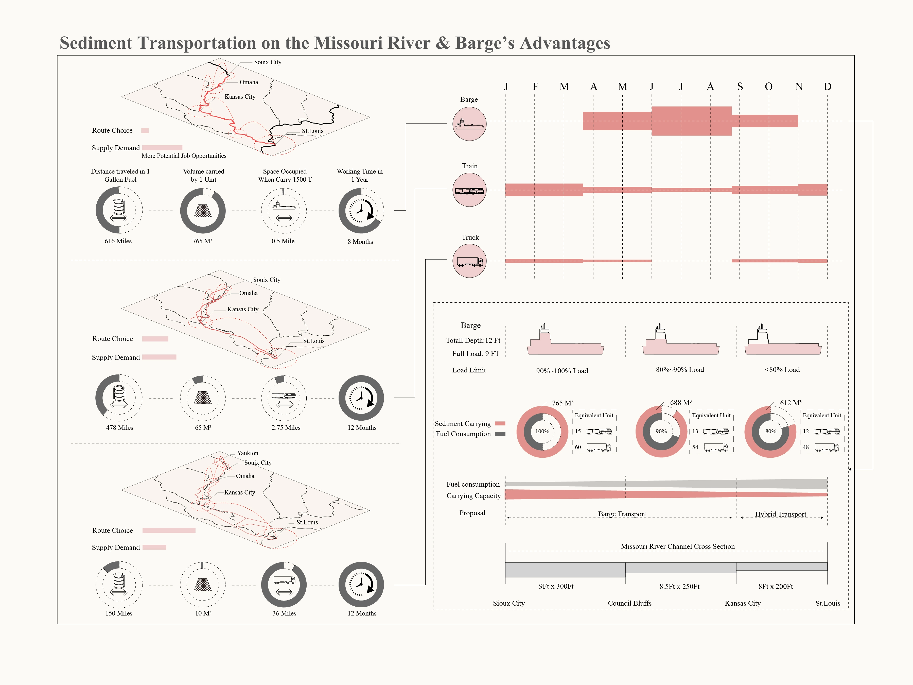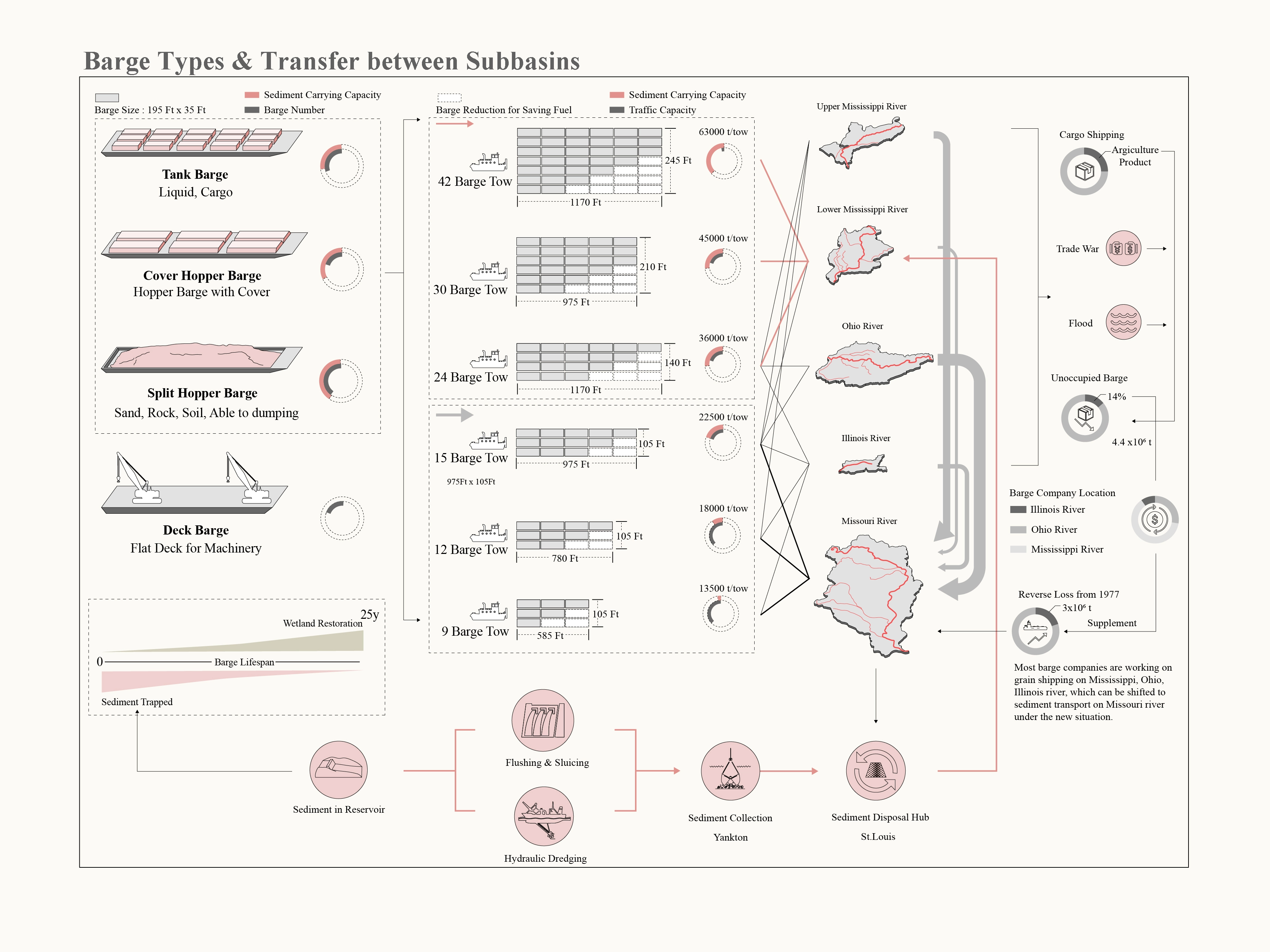 Since we do not need to tear down these structures on the river immediately, using barges to transport trapped sediment for riverine and coastal wetland restoration could be an offset for the ecological problems caused by infrastructures built for navigation purposes. The Missouri River provides the majority of the sediment in the Mississippi River Basin and as such, most of the trapped sediment is on the Missouri river, in the massive reservoirs behind the six huge dams. The lack of sediment makes the lower Mississippi and Louisiana coastal area vulnerable to wetland loss. It is necessary to figure out how to relocate the trapped sediment. Compared with other transportation tools, such as train and truck, barges are still the cheapest one and the most ecological one with lower carbon emission. Despite barges still being powered by diesel, hopefully in the future they can be powered by renewables. The sediment transportation can be a new commercial direction for barge transportation, as a new ecologically-based industry. Sediment trapped behind dams are flushed away by regular sluicing of dams and collected in Yankton, the starting point of the shipping channel on the Missouri river. Due to the depth and width of the Missouri river, a barge tow of 9-15 can navigate there. When the tow arrives in St. Louis, the riverine port on confluence of the Missouri and the Mississippi Rivers, the sediment could be classified and reloaded on larger barge tows of 24-42, and transported to the Lower Mississippi River Basin. St. Louis will be a future sediment hub, providing jobs for local communities. The restoration of wetlands, such as swamps and fresh water marshes, along with levee modification in the Lower Mississippi River Basin and other sub-basins will improve environments for natural species and also produce job opportunities, such as wetland management and traditional fisheries. The Louisiana coast will be the last stop of this trip. Restored coastal marshes coupled with abandoned barges can form a defense line over floods. The barge industry can play an important role in river management on the Mississippi River in the next 20-25 years.
