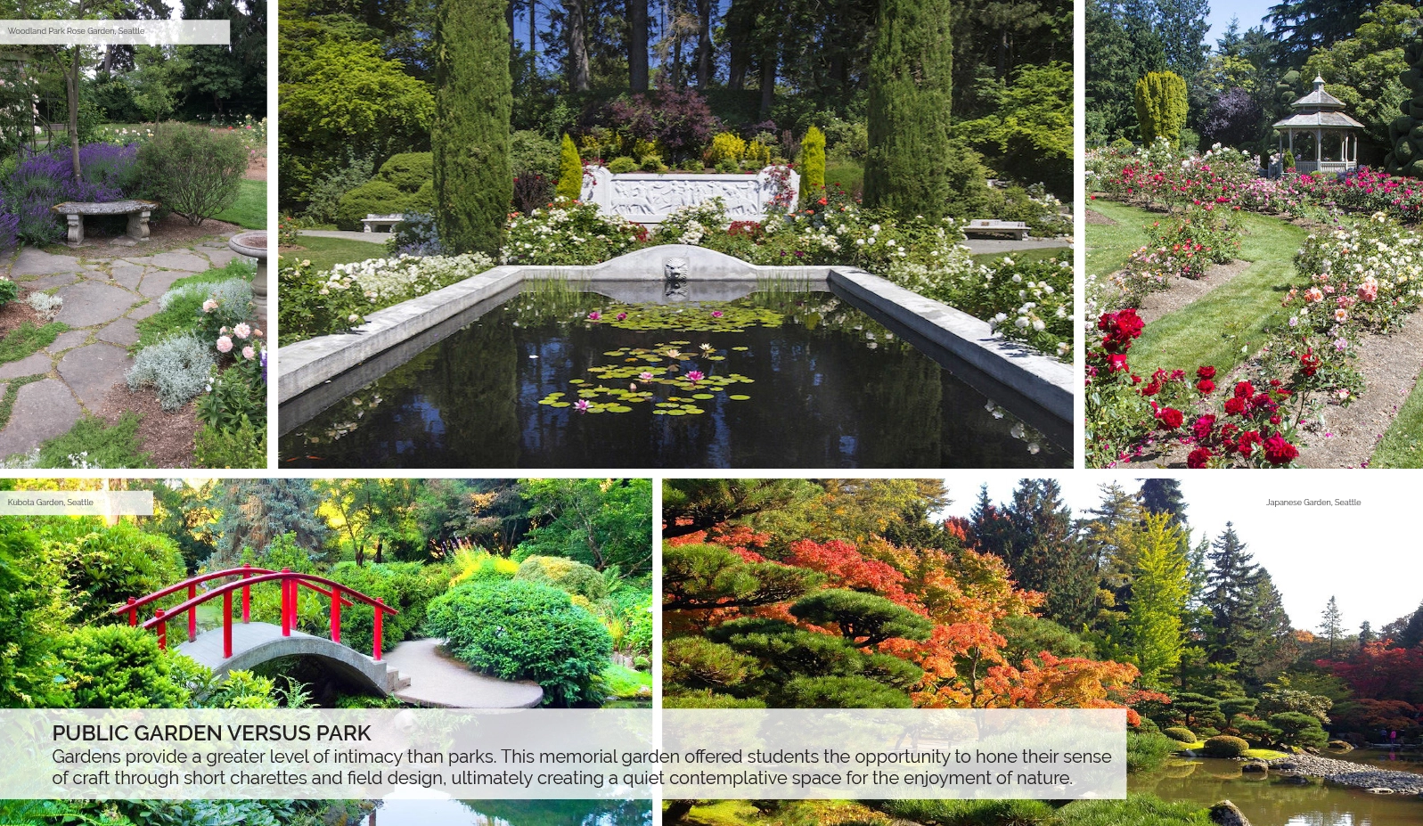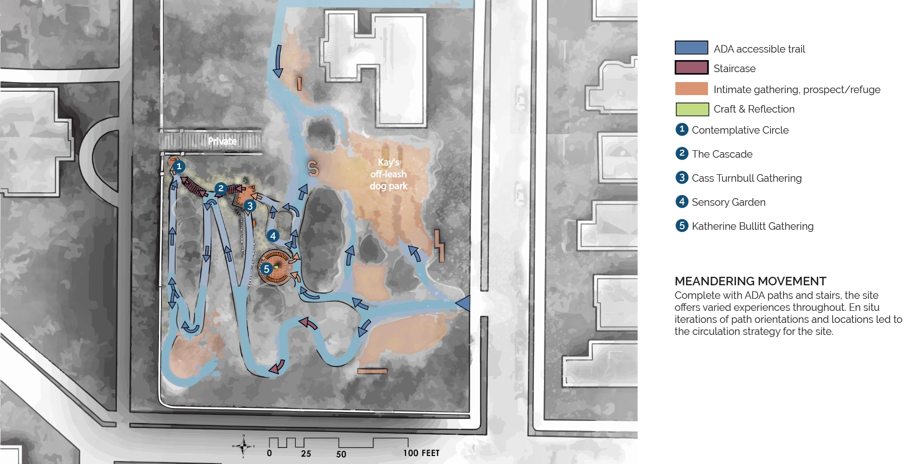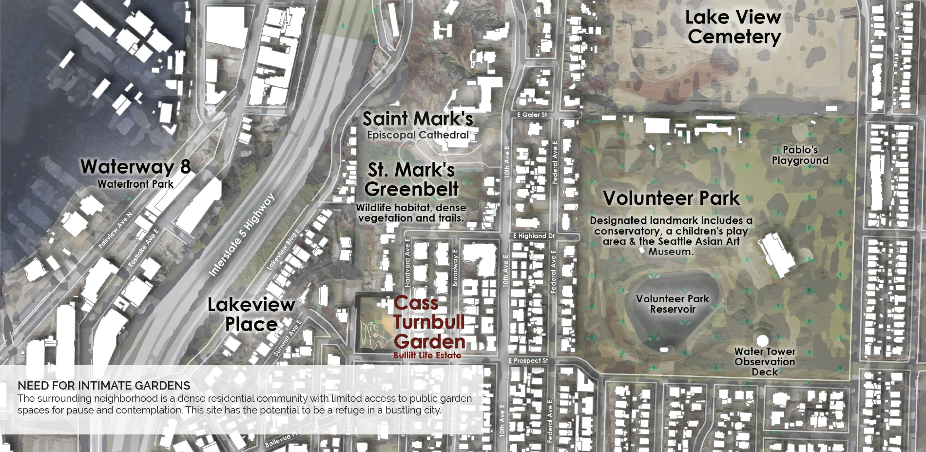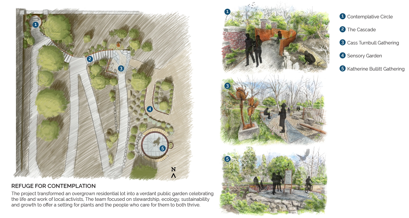 Community Process: Much of our process was gaining an understanding of Katherine Bullitt and Cass Turnbull, both of whom are memorialized in the garden. Interviews with those who knew them were conducted to understand their preferences, personalities, and aspirations. Several Zoom presentations hosted by Plant Amnesty were held to explain the project and solicit feedback from local nearby residents and the general public. These have been critical to the success of the project as the earlier concept development and site preparation had limited public input. To address this lack of inclusion, the student team plays a significant role in cultivating a community dialogue that included site tours, presentations, and discussions to create a responsive feedback loop that will better integrate community engagement in the process. The students reduced the hostility that had grown and have garnered much community support for the project that had previously not existed.