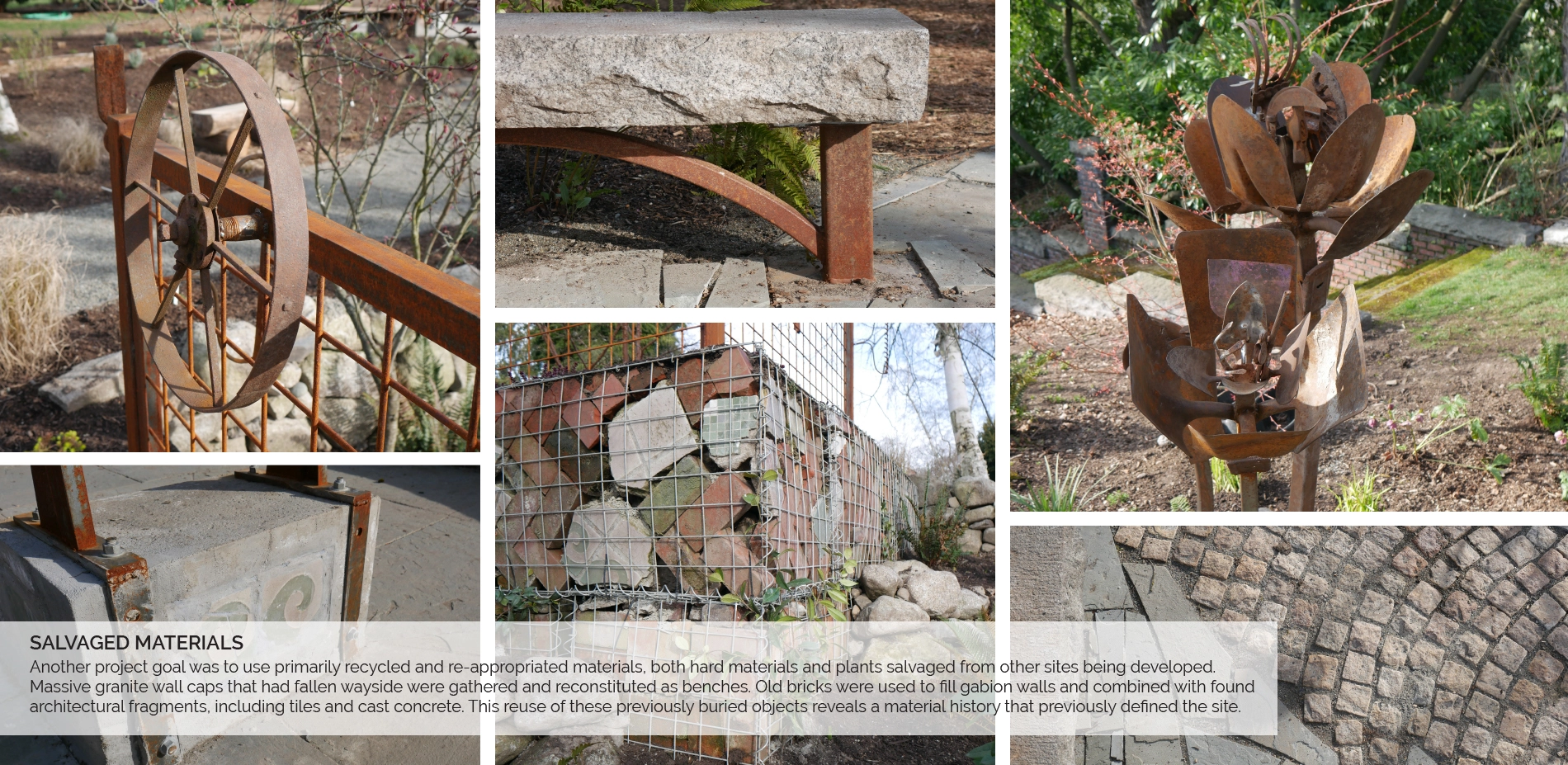 Goals and Objectives: Located on the grounds of a private residence in the Capitol Hill neighborhood of Seattle, WA, this site is being transferred to the Seattle Parks and Recreation Department as a future public space in one of the city’s densest parts of the city. One goal was to use primarily recycled and re-appropriated materials, both hard materials and plants salvaged from other sites being developed. A second goal was to celebrate the many overlapping histories relevant to this site. During excavation, we slowly began to peel back and reveal these layers by salvaging fragments of architectural ornament and other viable structural artifacts that were re-incorporated into the project. The former 19th century residence and carriage house were both destroyed by fire and demolished in the 1970s. In the process of clearing invasive plants from the site, we were able to recover architectural elements of these former structures and implement them into newly constructed garden elements. Massive granite wall caps that had fallen wayside were gathered and reconstituted as benches. Old bricks were used to fill gabion walls and combined with found architectural fragments, including tiles and cast concrete. This reuse of these previously buried objects reveals a material history that previously defined the site.
