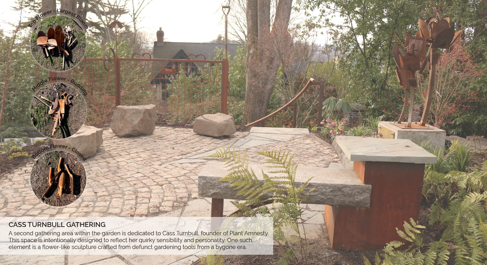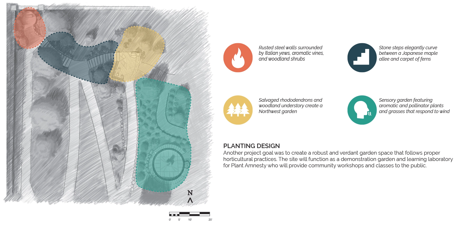 Behind a nondescript brick wall, an overgrown residential lot is transformed into a verdant public garden celebrating the life and work of local activists Cass Turnbull and Kay Bullitt, champions of the diverse lives of plants and people. Over 10 weeks, this exploratory design-build program brought students out of the isolation of remote learning into the tactile realities of working on-site. Through this process students were challenged to bring their designs to life, respond to site conditions, and embrace adaptability in the field. By emphasizing the reuse of materials and plants, both found and donated, students were able to create unique site features such as rock walls, seating areas, and staircases that together reflect a focus on craft and an expressionist approach to the site. The garden acts not only as a refuge for contemplation in the city but also as a living laboratory for Plant Amnesty, a local volunteer-run non-profit. Together, this focus on stewardship, ecology, sustainability and growth offers a setting for plants and the people who care for them to both thrive.