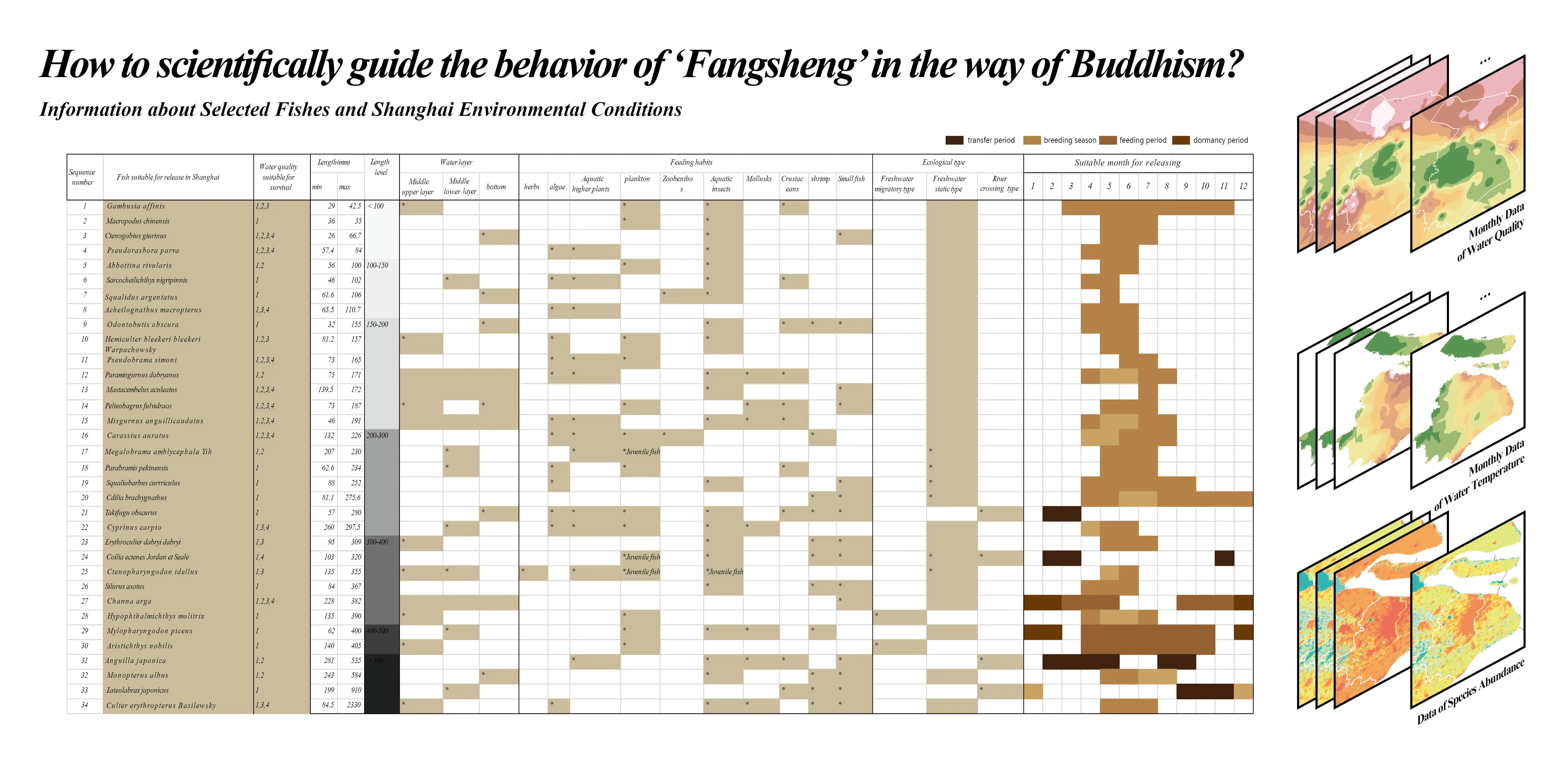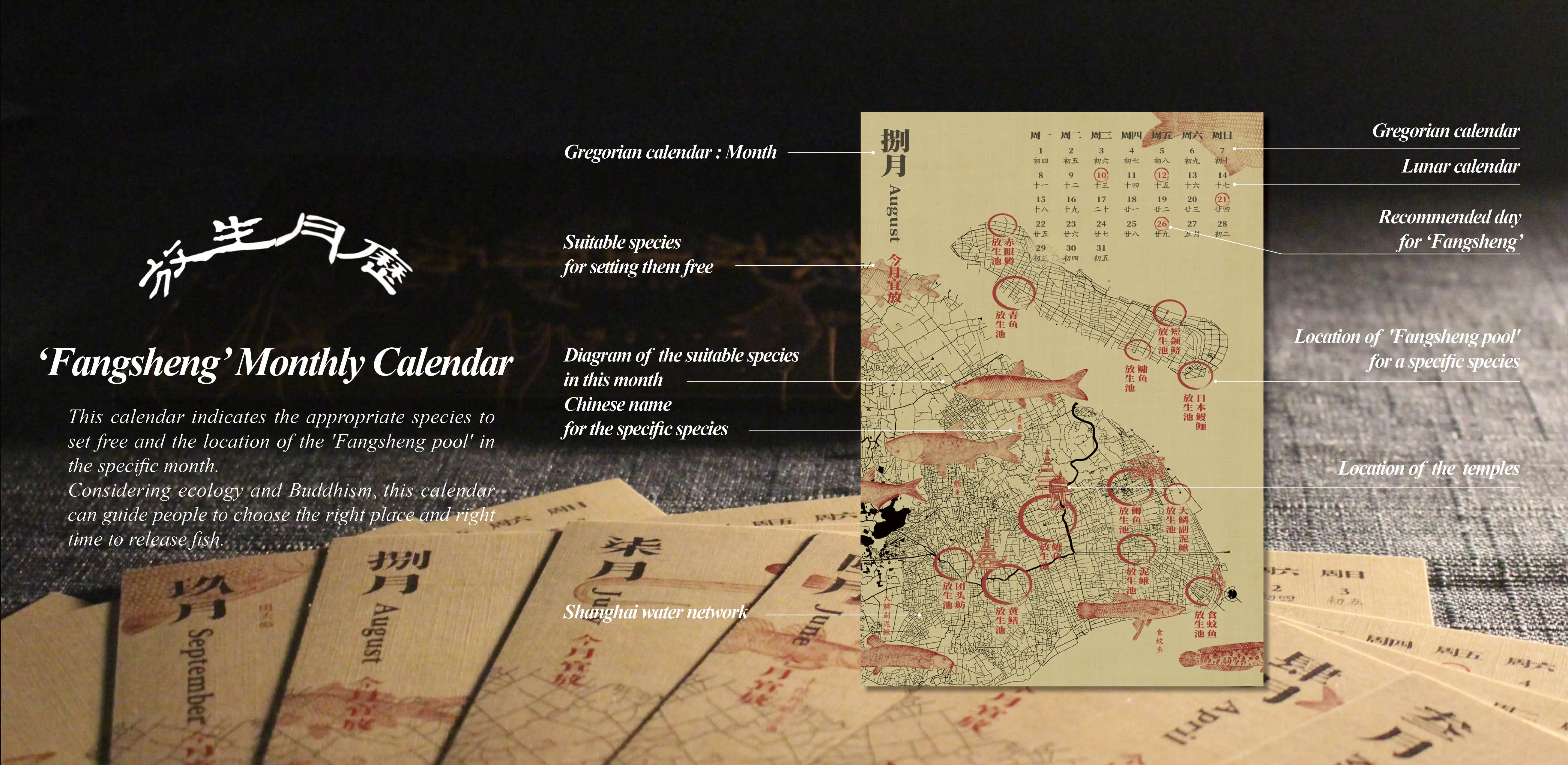 'Fangsheng' monthly calendar contains a map of Buddhist style, marking suitable places for releasing certain kinds of fish, called 'Fangsheng pool’, and the calendar next to the map marks the Buddhist festivals suitable for 'Fangsheng'. Guided by this calendar, Buddhist believers will understand when and where to release certain kinds of fish. The suggestion on the calendar is made through scientific methods, integrating multiple urban data of shanghai, such as the data of water quality, water temperature, and species abundance, which are integrated into GIS to assist decision making. In addition, the process gives full play to the advantages of landscape architects.