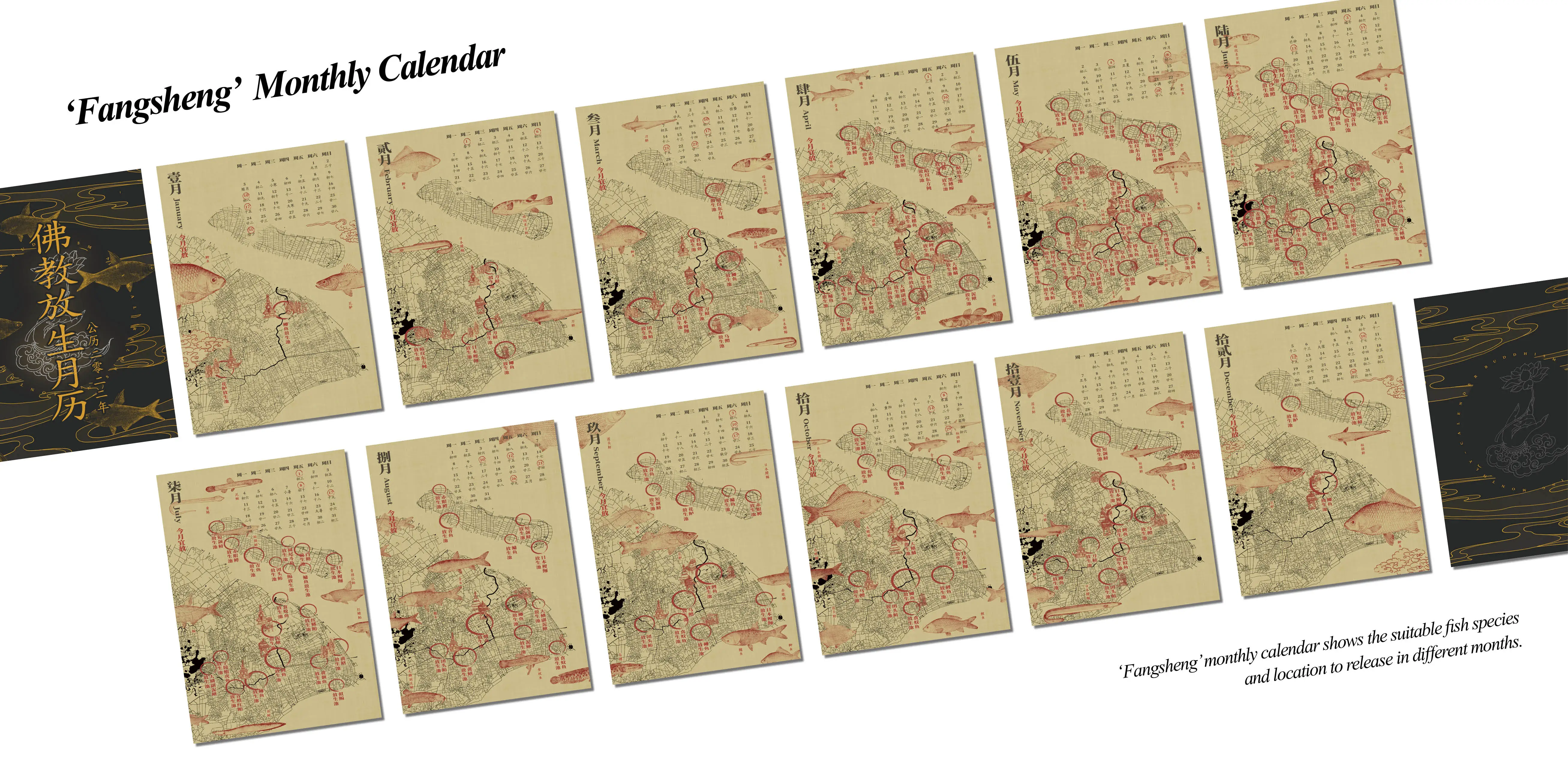 In the 'Fangsheng' weekly calendar, we create connections between Buddhism and fish for release from a more detailed perspective, and the popular science on fish habits has been added. Furthermore, by combining fish species suitable for releasing at different weeks (called lucky fish of this week in the calendar) with Buddhist events, we try to put a scientific ecological concept into 'Fangsheng' while maintaining its religious nature, and we also write poetries and make paintings to deepen the idea.