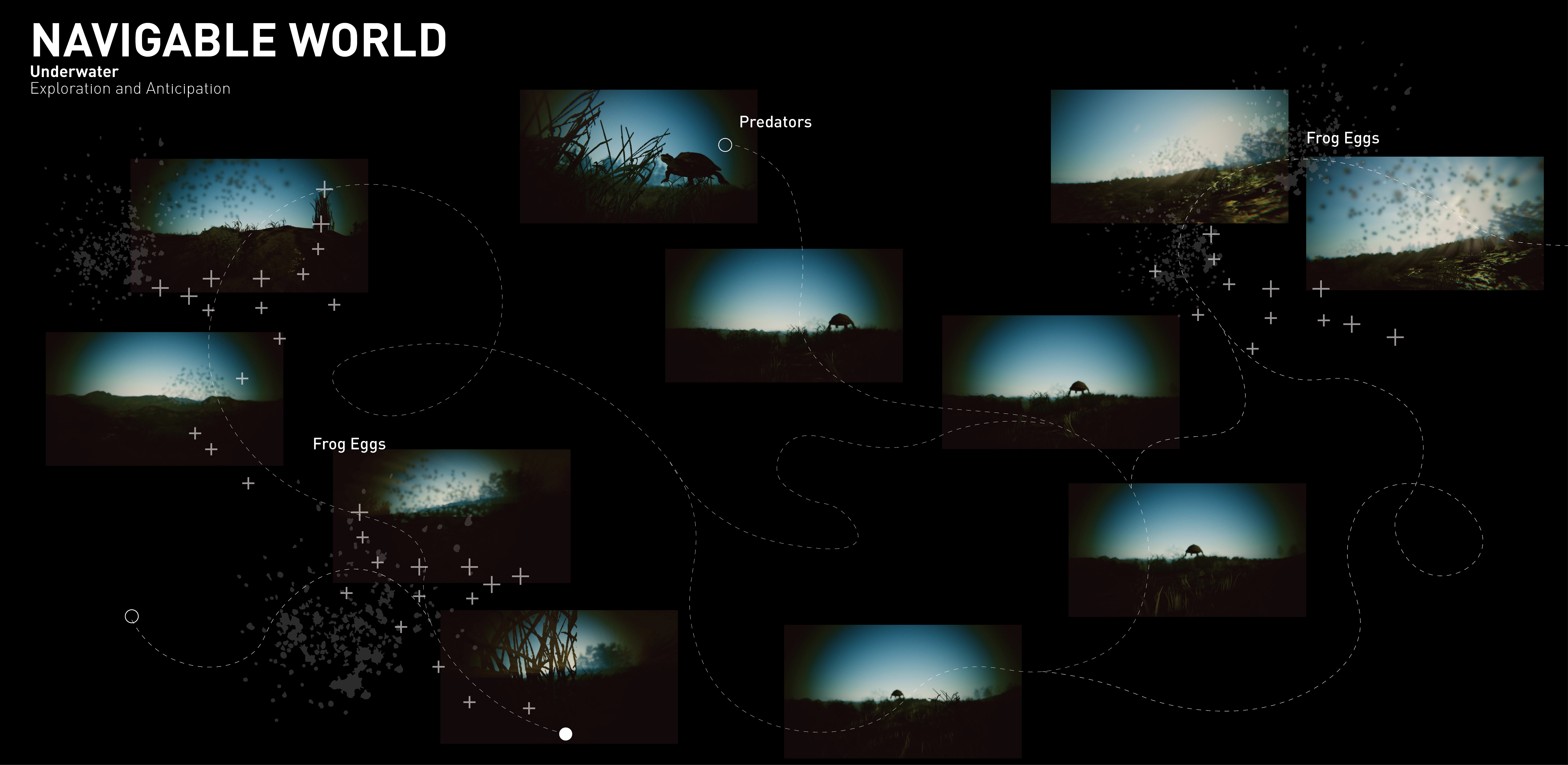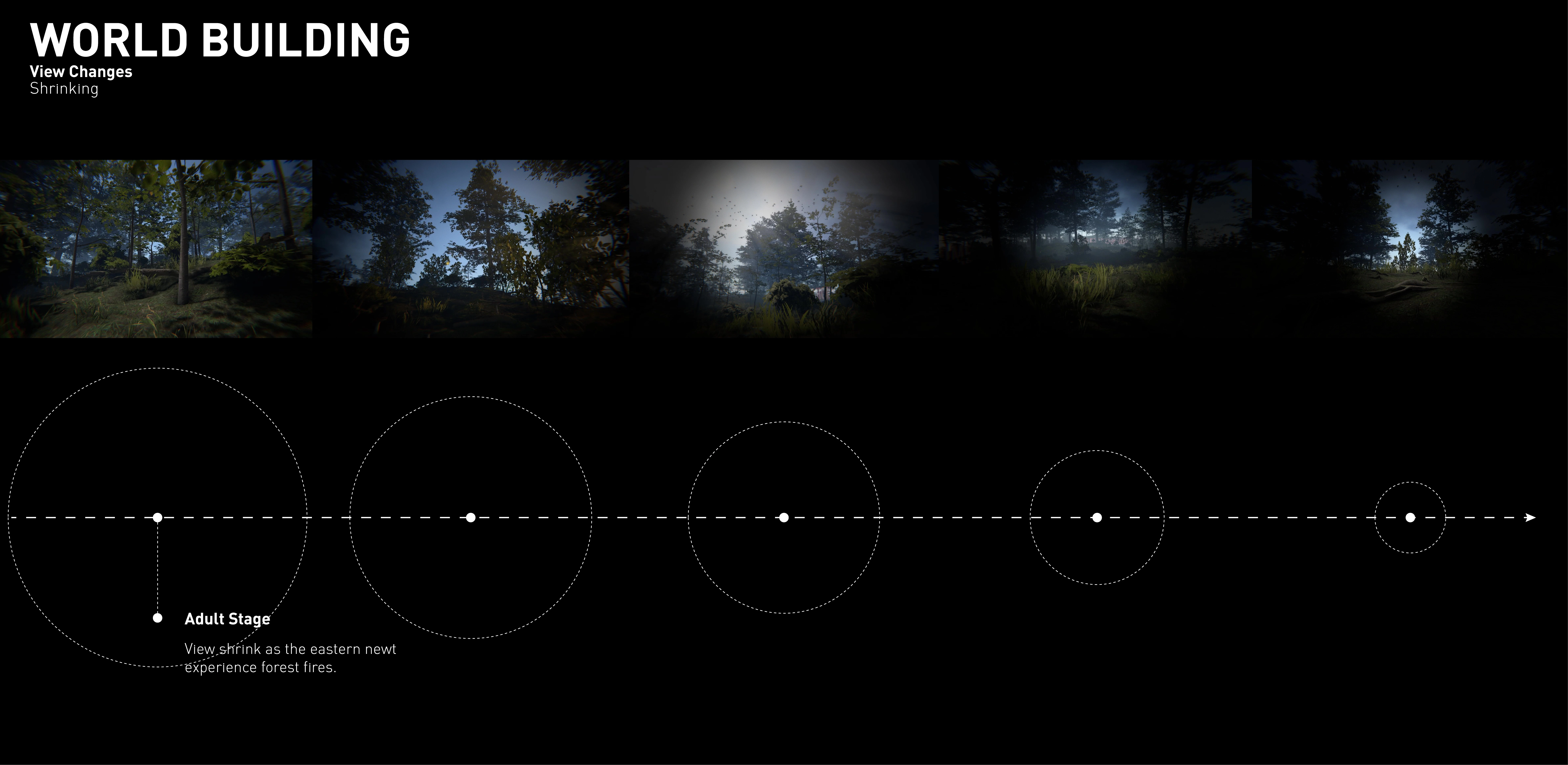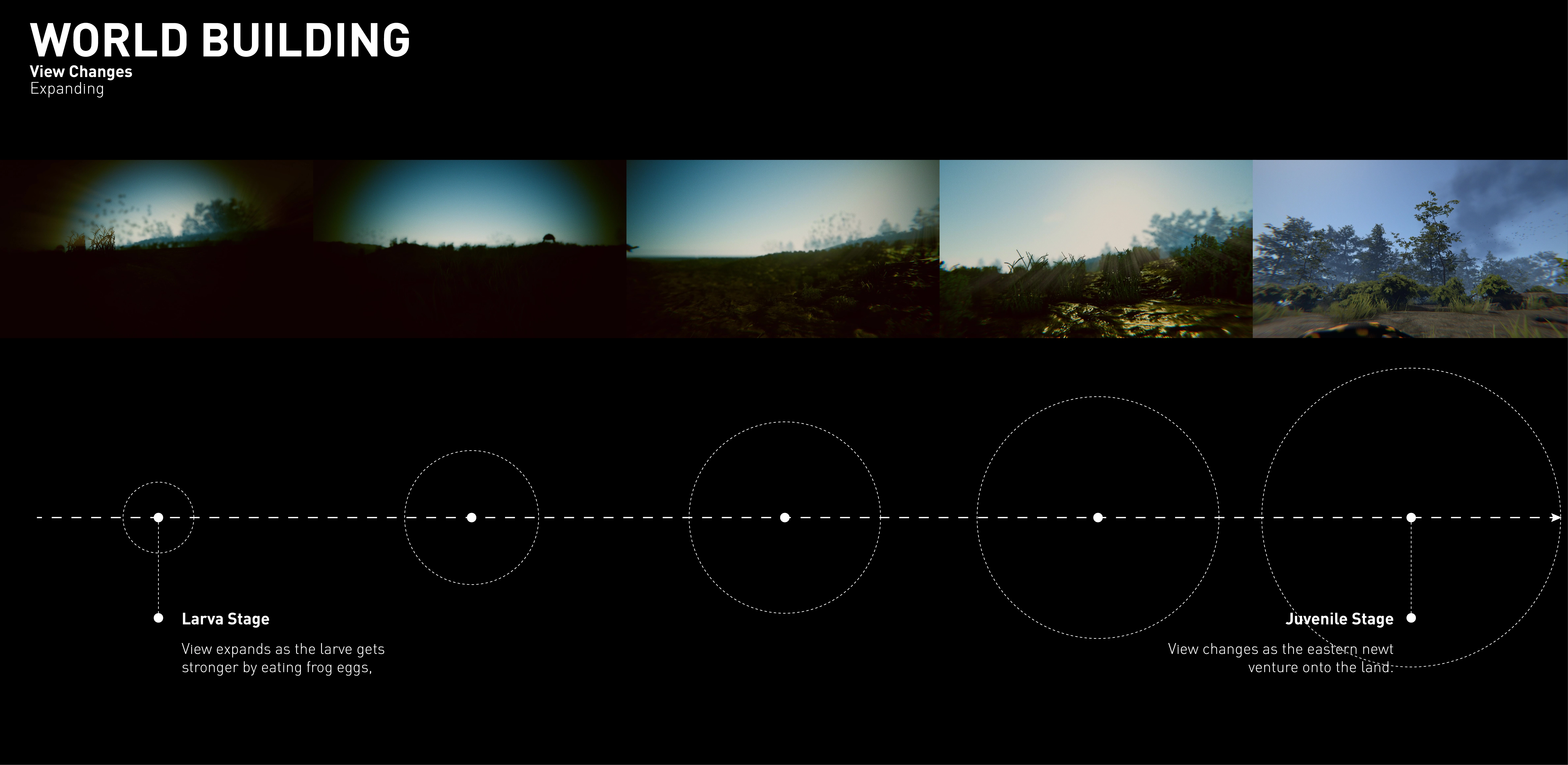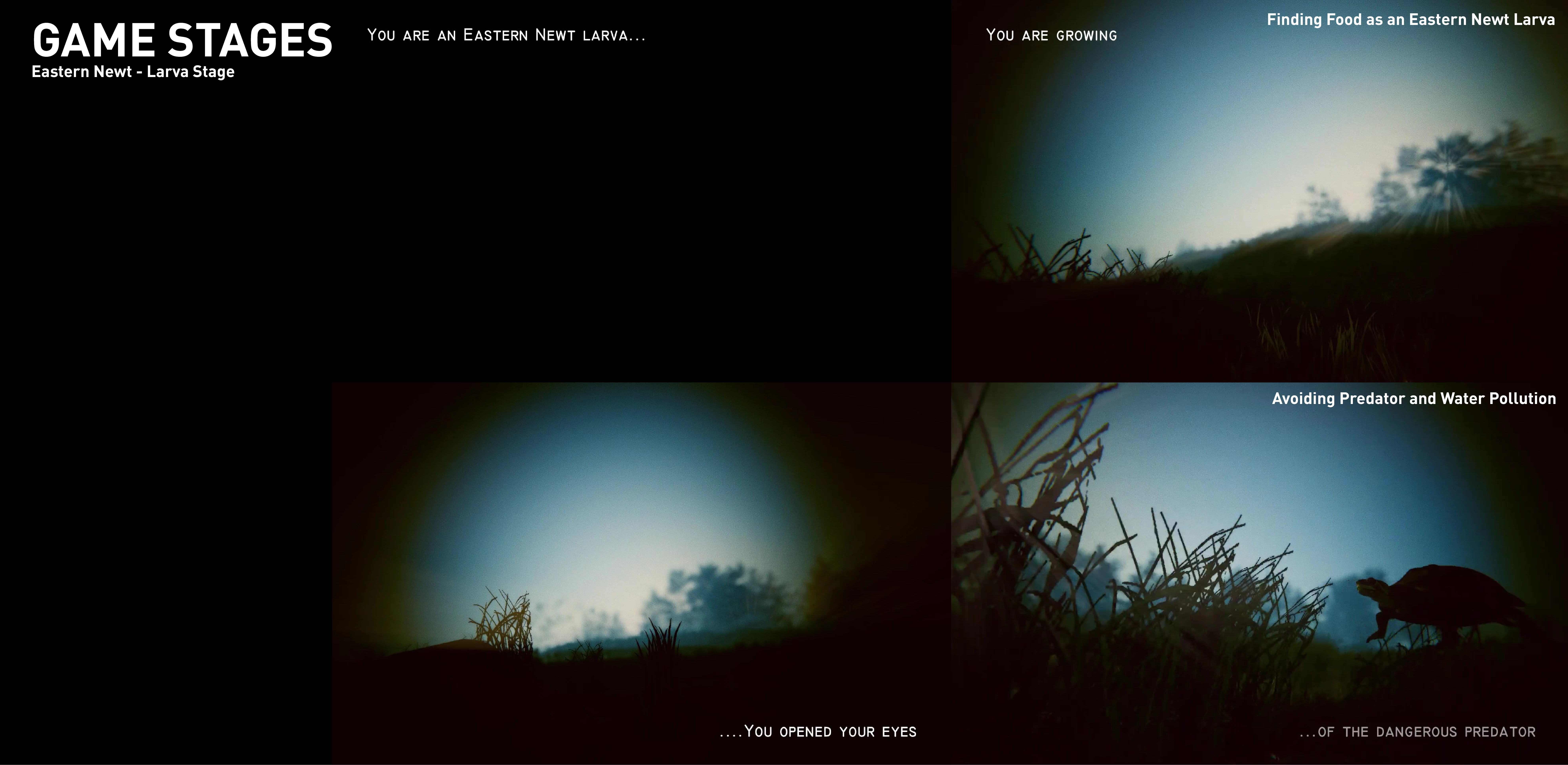 The project Eastern Newt Simulator set out to display the impact of climate change in a non-linear way by creating a first-person perspective of an eastern newt larva and encourages players to ponder what it means to be non-human, living in a world where human influence is ubiquitous.