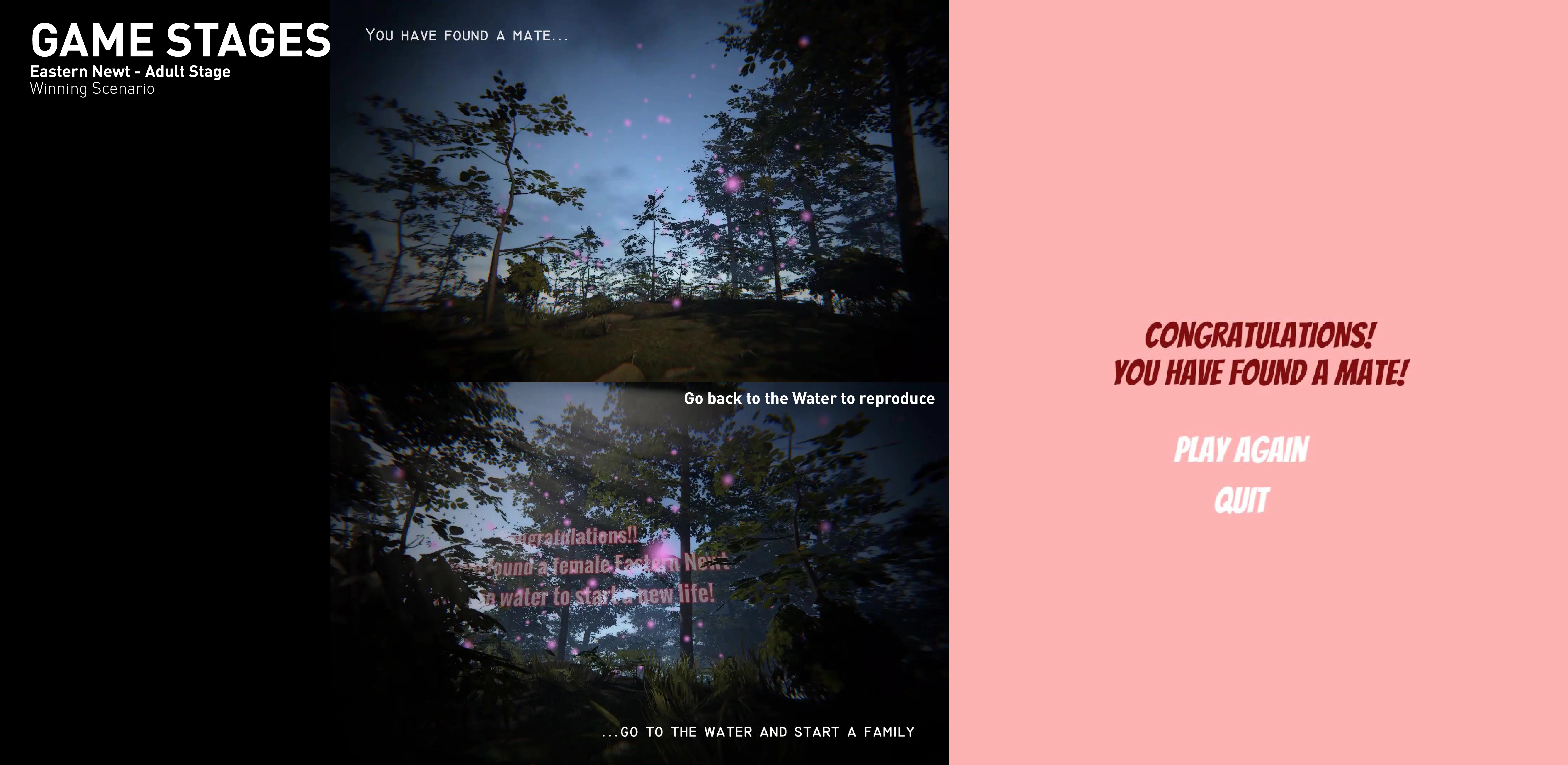 In this game, you are a male eastern newt at larva stage. Your mission is to survive and find another female eastern newt as your partner and go back to the water to reproduce. Survival is not an easy task in a bay with human activities and natural predators. Staying in the water for too long might be dangerous, for it is polluted by toxic chemicals that are discharged by human industries. Forest fires might occur due to extreme weather conditions, or it might be a prescribed burn by humans for maintenance purposes. You might lose your habitat due to urban development, or it could be inhabitable simply because of the lack of precipitation.