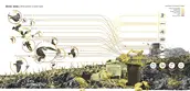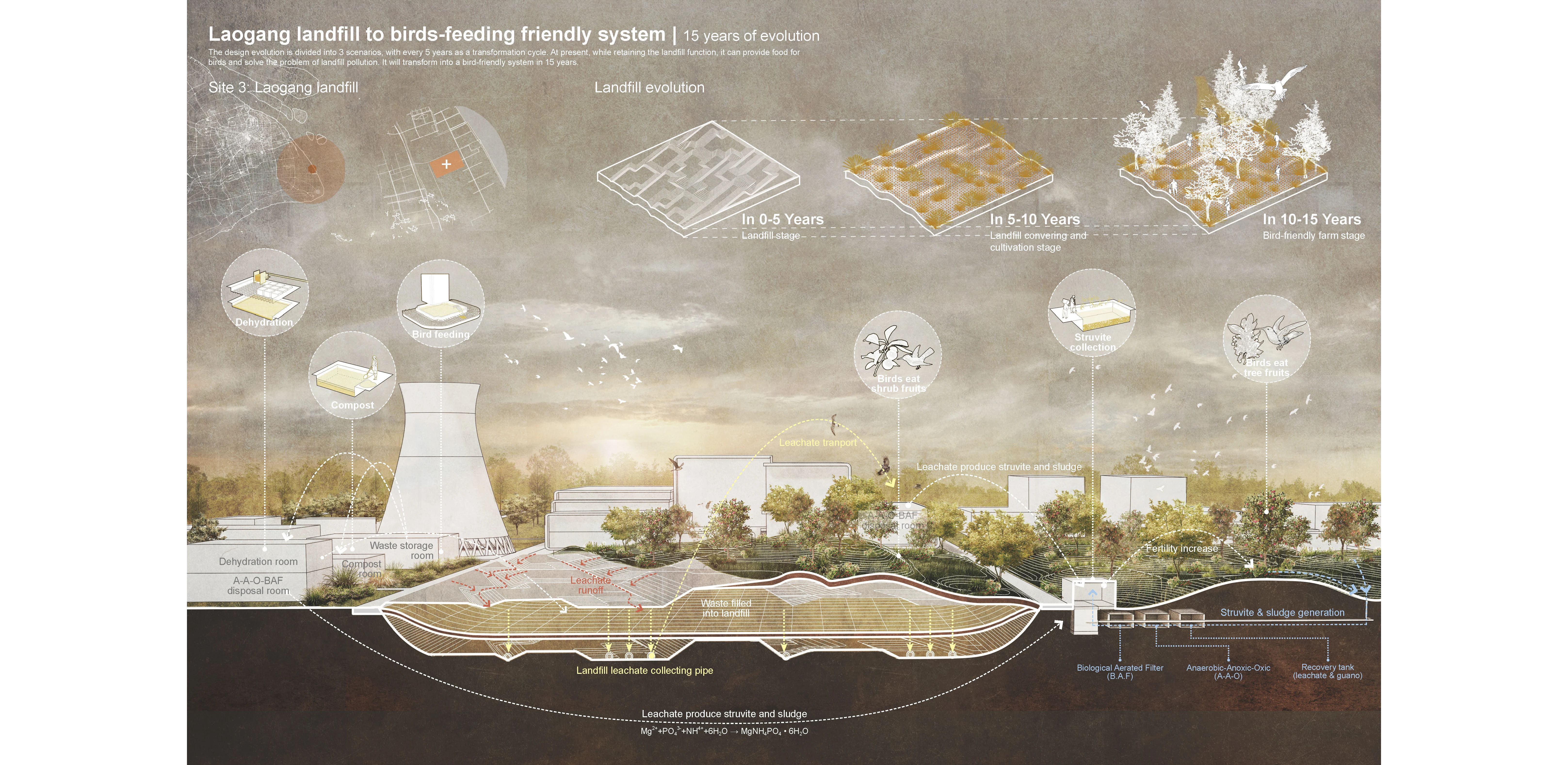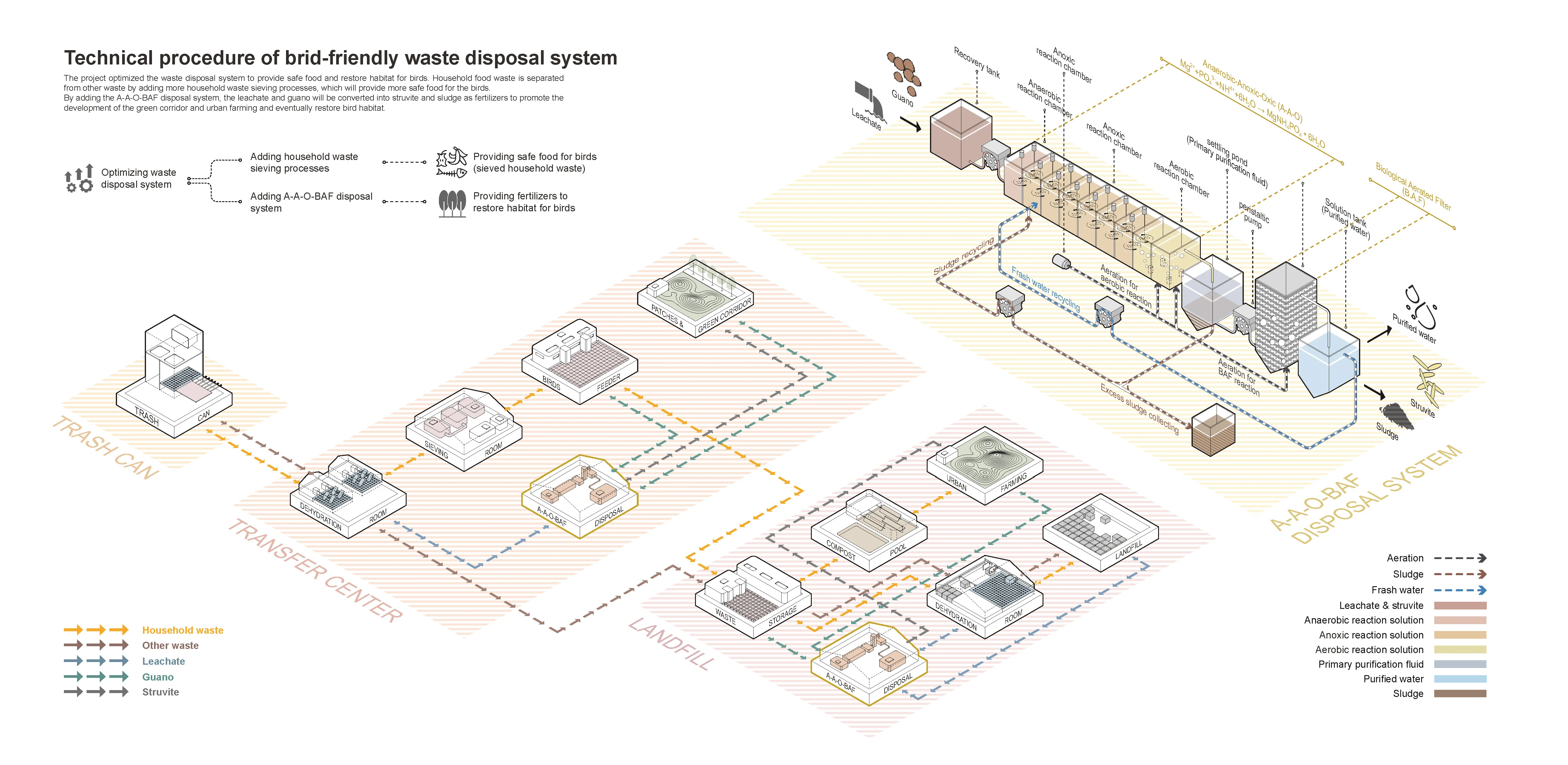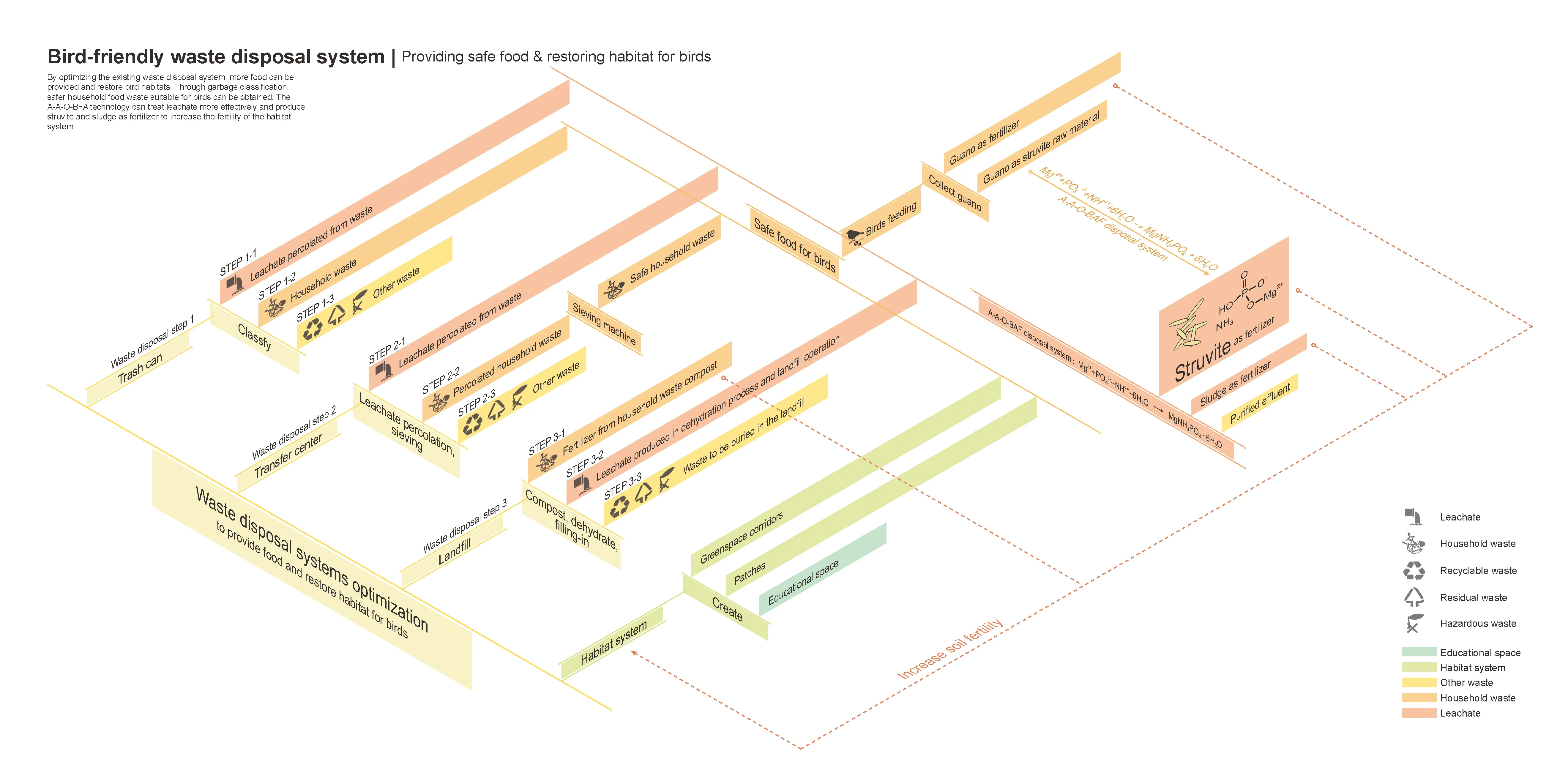 According to birds’ occurrence data and garbage treatment points, we analyze the spatial relationship and plan two systems: garbage disposal system and birds’ habitat system. These provides birds edible waste at selected places and times, collect the droppings to compost to provide fertilizers for organic farming, plant edible food for both human and birds, and provide habitat patches and corridors for birds and as nature experience sites for human. The two systems join together through stuvite that generated both in process of garbage disposal and birds’ metabolism, forming a sustainable cycle.