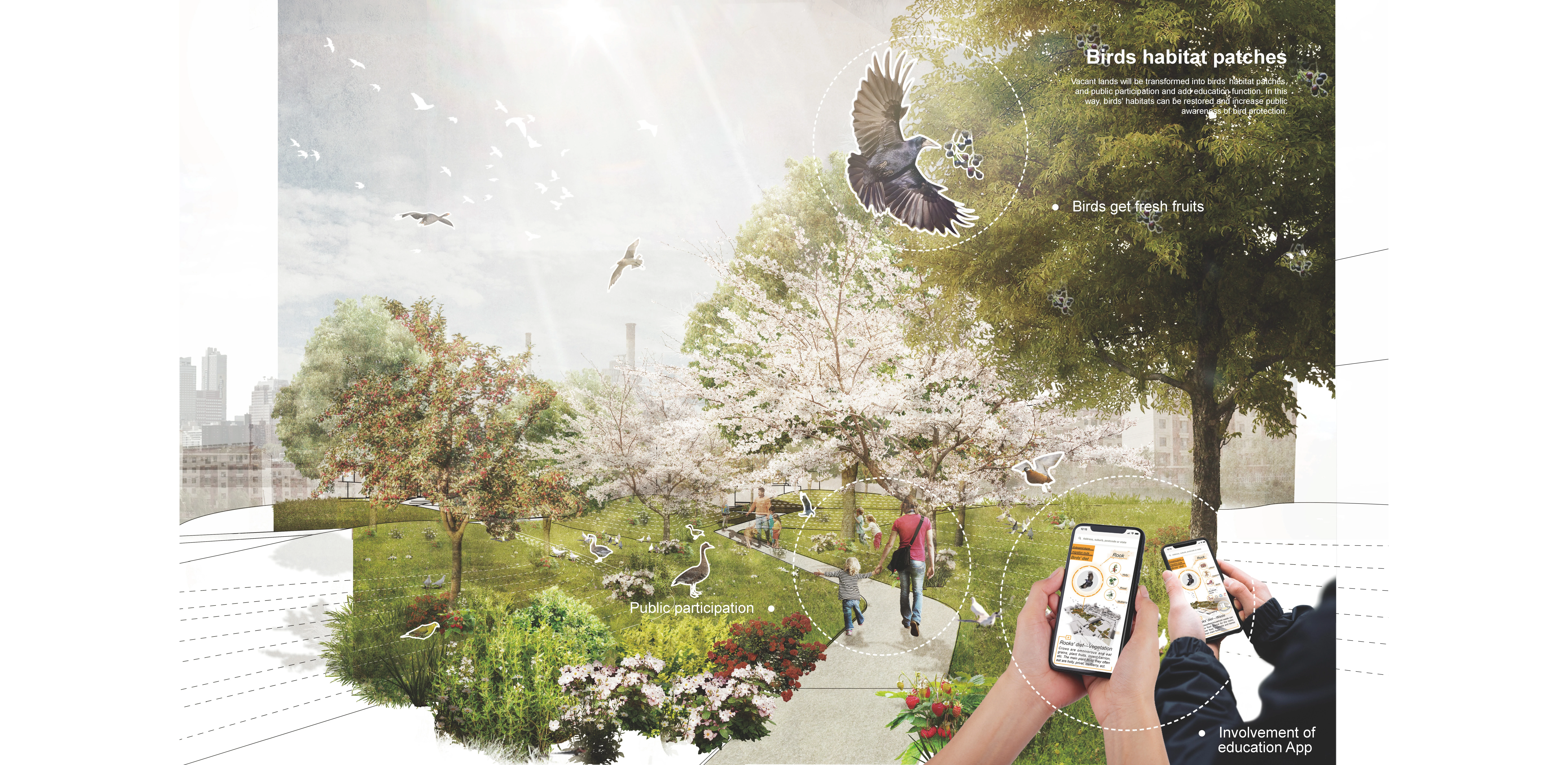 Based on the data analysis of the current bird spots in the city, we search for 3 types of place to be target areas for habitat improvement: (1) hot spots with high bird diversity and abundance; (2) free land near hot spots with high bird abundance; and (3) potential corridors that connect the hot spots. Use the fertilizer produced in the garbage disposal process to plant appropriate types of trees, crops and fruits in the target areas to provide habitat and food for birds, and form a well-connected network, thus forming a cycle of garbage and bird food. In these habitats, we also provide space for natural experiences and ecological educational activities for citizens, enhance people's awareness of ecological protection by learning related knowledge and birds-watching, and contribute to a resilient and sustainable city.