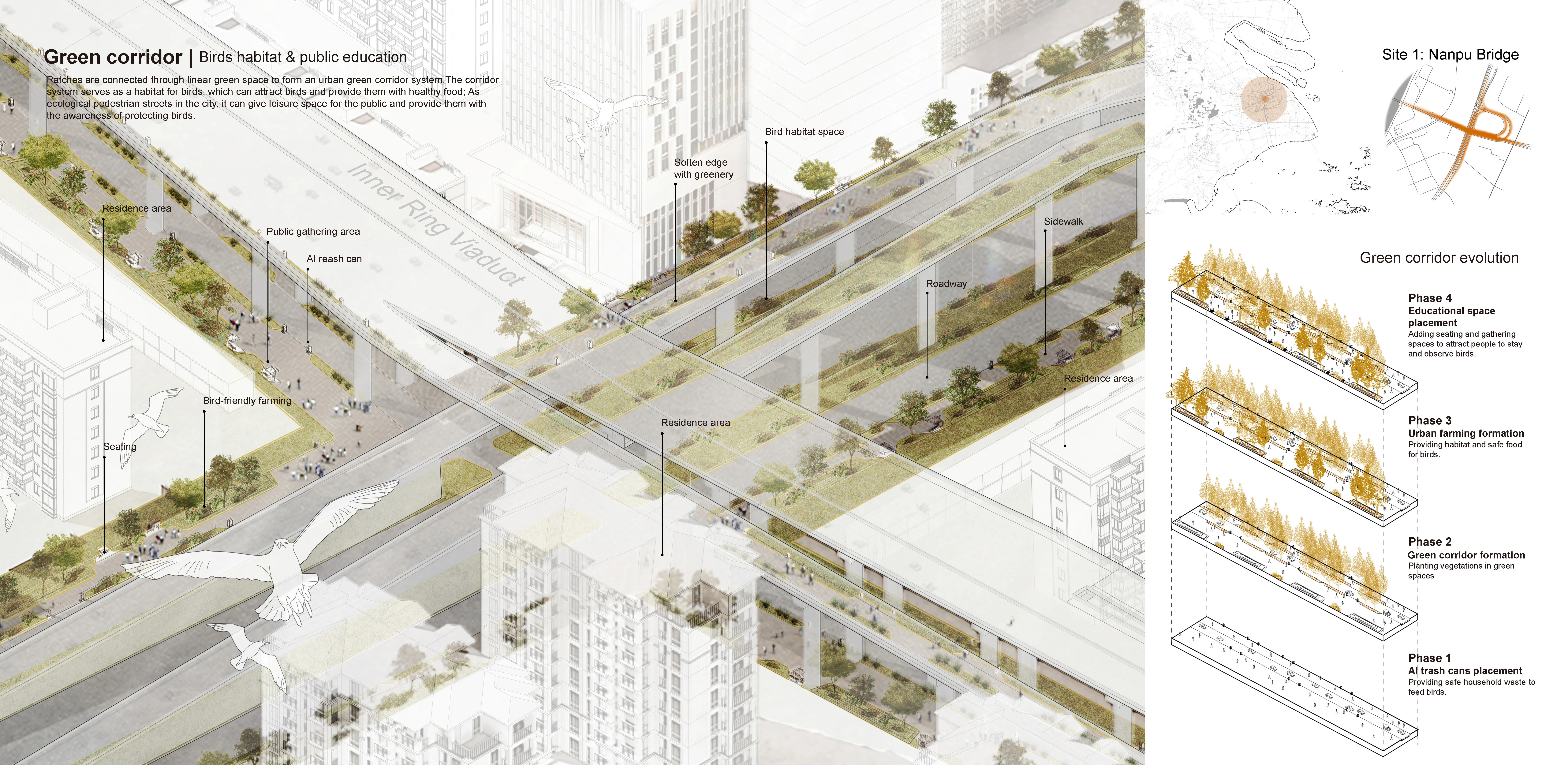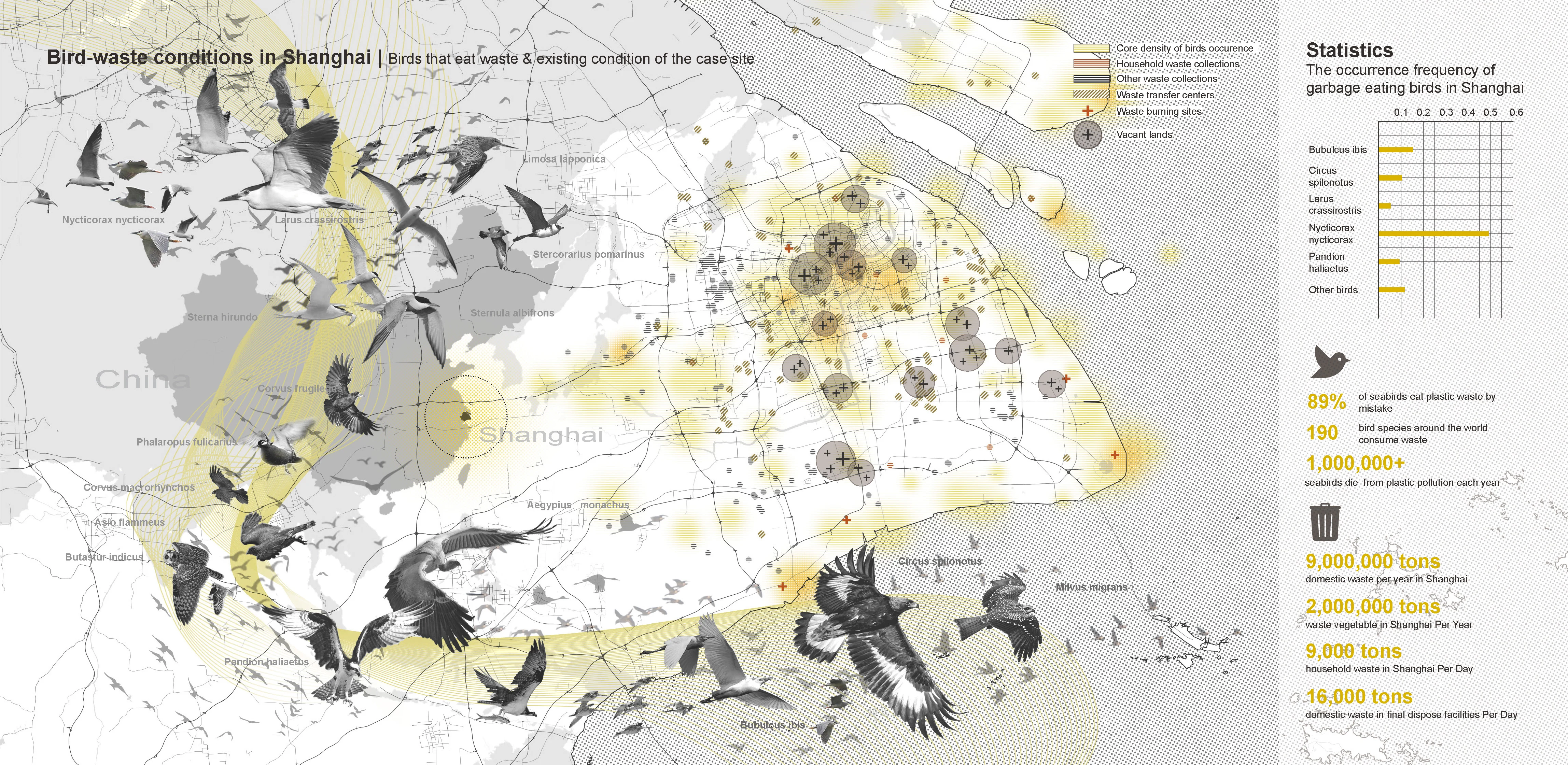 Shanghai locates in east coast of China and is under reforming of garbage classification and dispose system in recent years. It has 9,000t wet garbage (organic waste) to be disposed every day and thousands of birds spotted in the city which may take these waste as food. These provide abundant possibilities for this exploring plan to reform the garbage disposal system into an avian-friendly one while contributing to human society through landscape planning and design. Shanghai has lots of scattered green spaces across the city and some green corridors while there is still potential to improve this system in terms of coverage and connectivity.