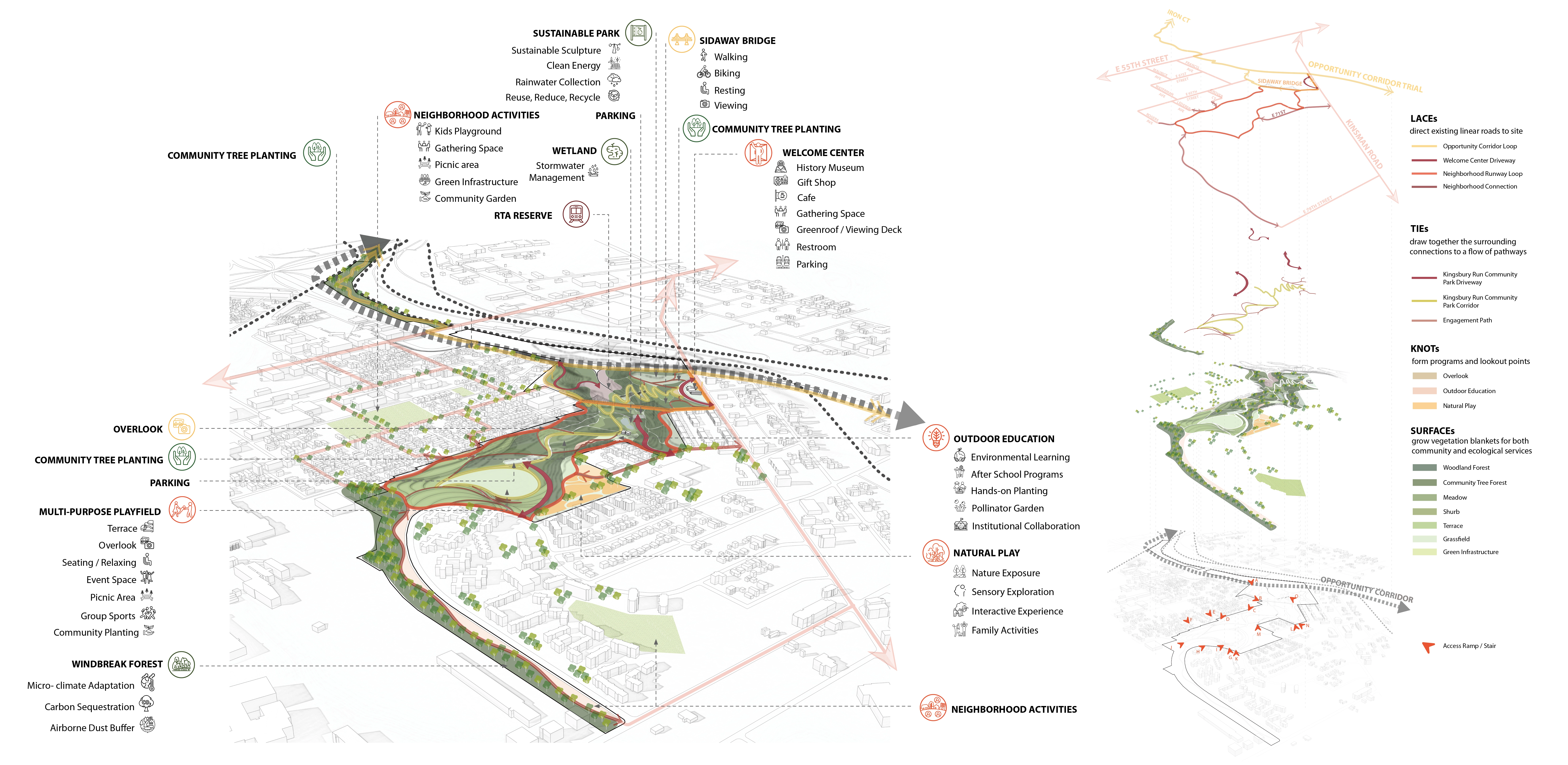 The proposal - Laces, Ties, and Knots, establishes a stronger and healthier relationship between the park and adjacent communities, between communities and neighborhoods, and between neighborhoods and the city of Cleveland. Kingsbury Run is envisioned as a community park to celebrate a reunion between humans and the natural environment. Understanding the scale of the site, phasing strategies in parallel with the design framework are essential for executing the proposal: