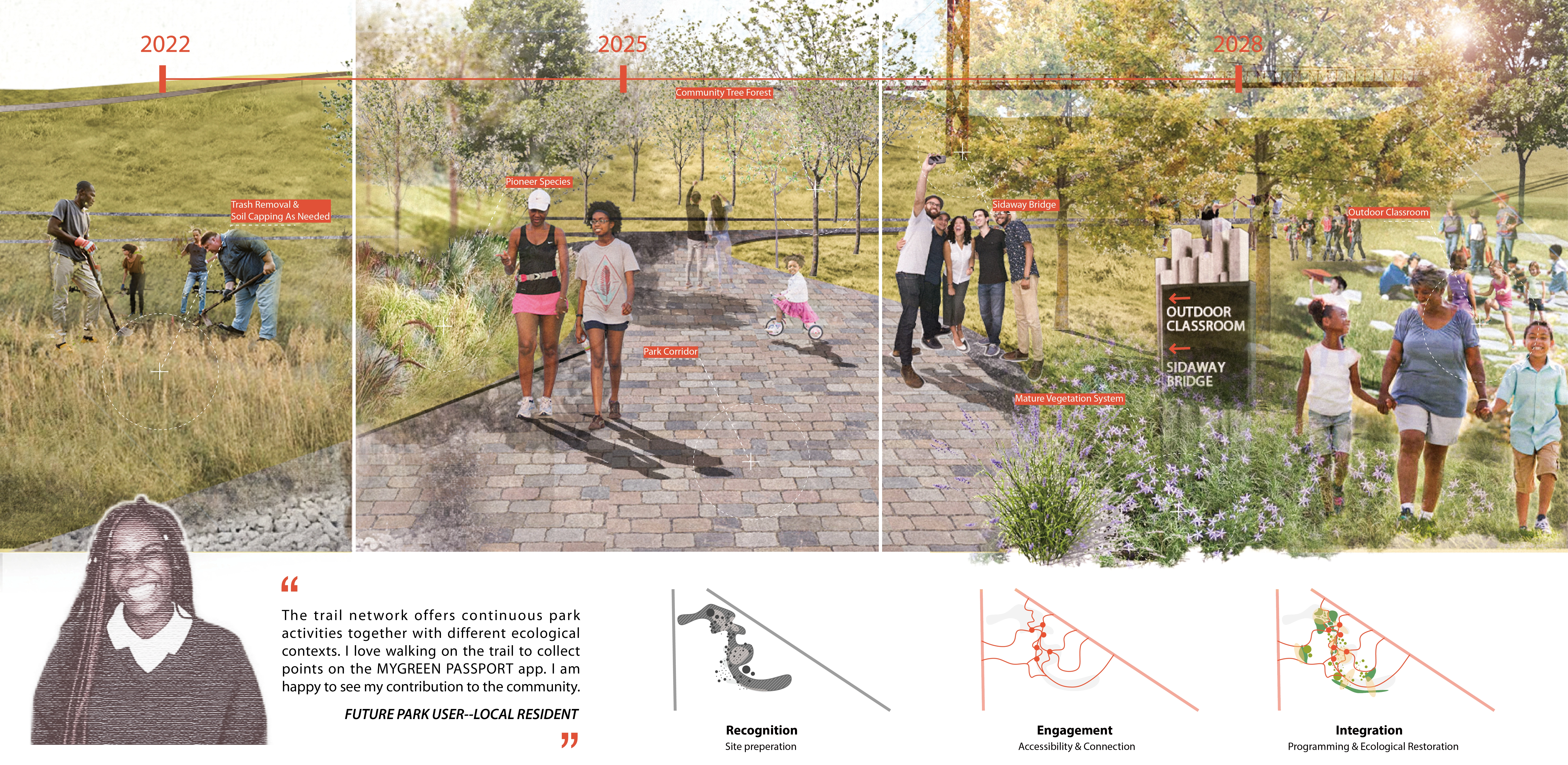 Listening to the local stakeholders and community members was essential for us to offer a design proposal, which could uphold the community’s priorities. With the COVID-19 travel restrictions, our team was unable to conduct neither a site visit nor a survey. We were thankful to stakeholders and community members who spent time with us on zoom and provided us with a tremendous amount of information that enriched our knowledge and understanding of the area. Community outreach and engagement through zoom meetings helped collect thoughts and insights of what nature meant to them, and they provided feedback on challenges and opportunities of the site from the local perspective. They spoke about providing an inclusive space for all people to elevate the quality of life in a way that would not gentrify the neighborhood and what amenities for people should come first. Our design proposal focused on responding to the requests for the design framework for recognition, engagement and integration.