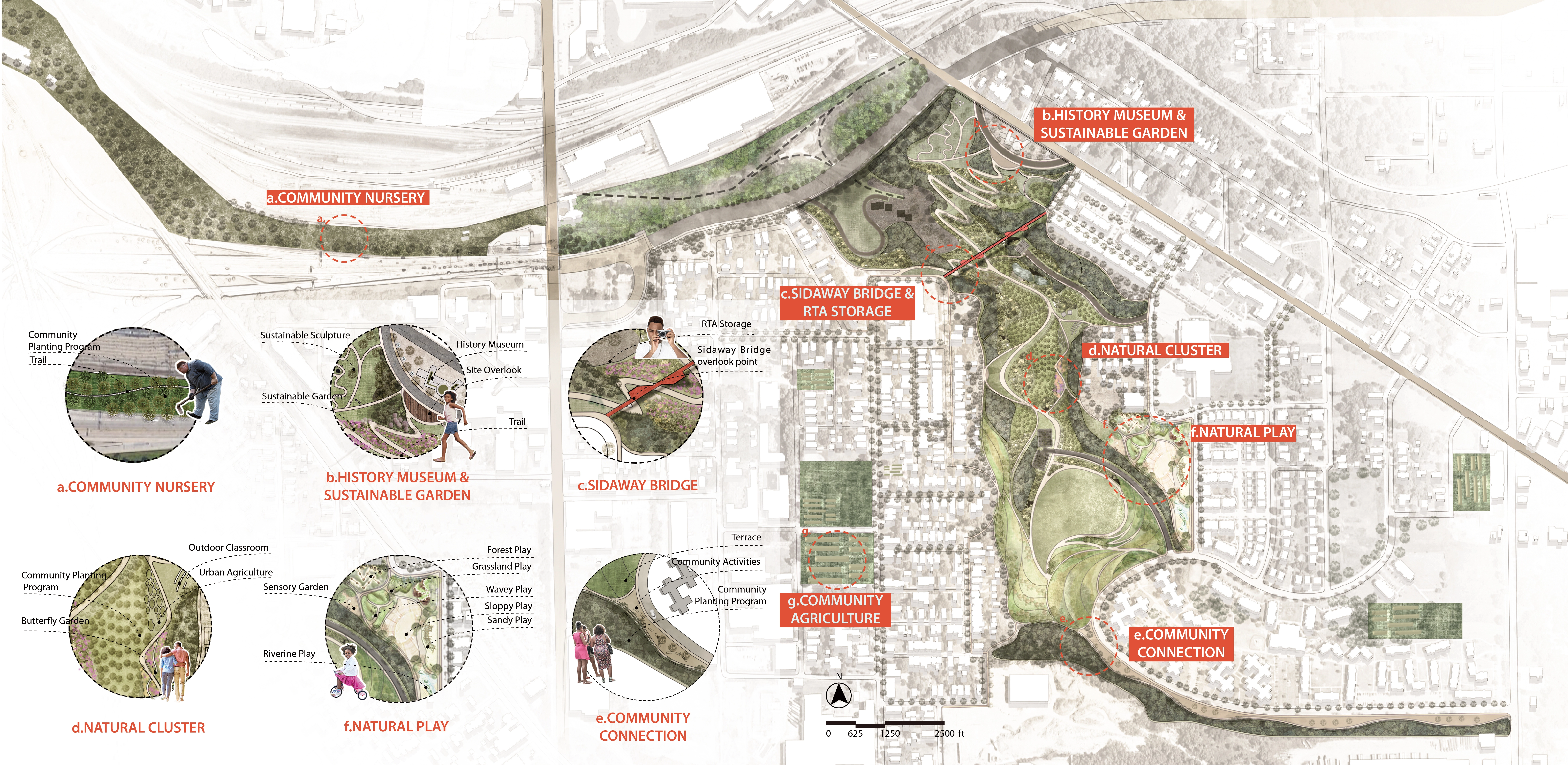 Highlight the historical significance of the Sidaway Bridge by renovating it to a walkable, bikeable and sociable place. Introduce layers of neighborhood trails around the street level of the site to bring the existing linear road system to the edge of the community park. Work with the existing site topography and exploit the height difference for view shed moments. Sample the existing plants / woods assessment and understand how the soil was capped. Incorporate “50 Actions to Elevate the East” public art program to express the unique character of the area’s people and topography through public art. This will also create innovative experiences with clean energy, rainwater collection, recycling and upcycling.
