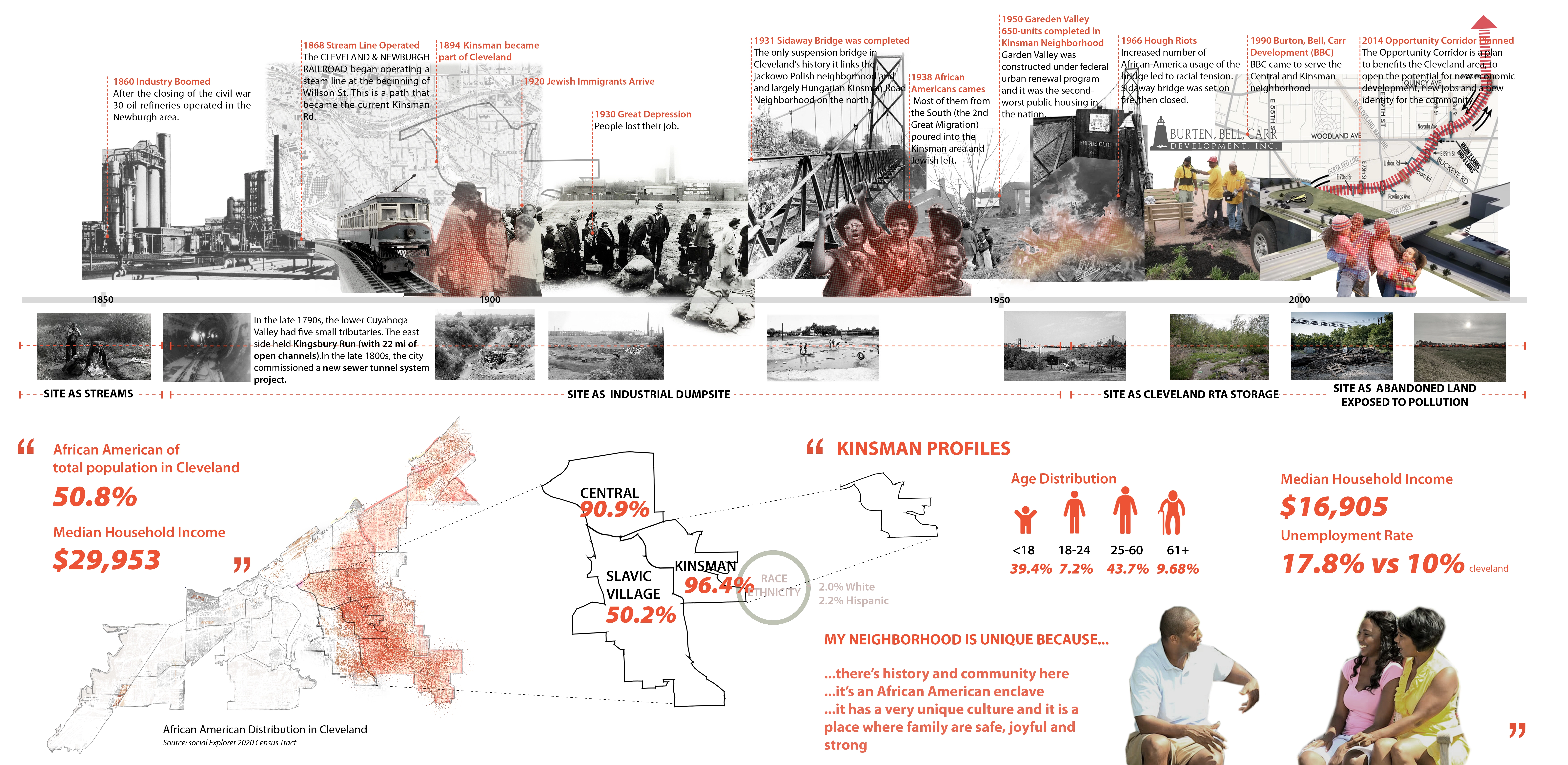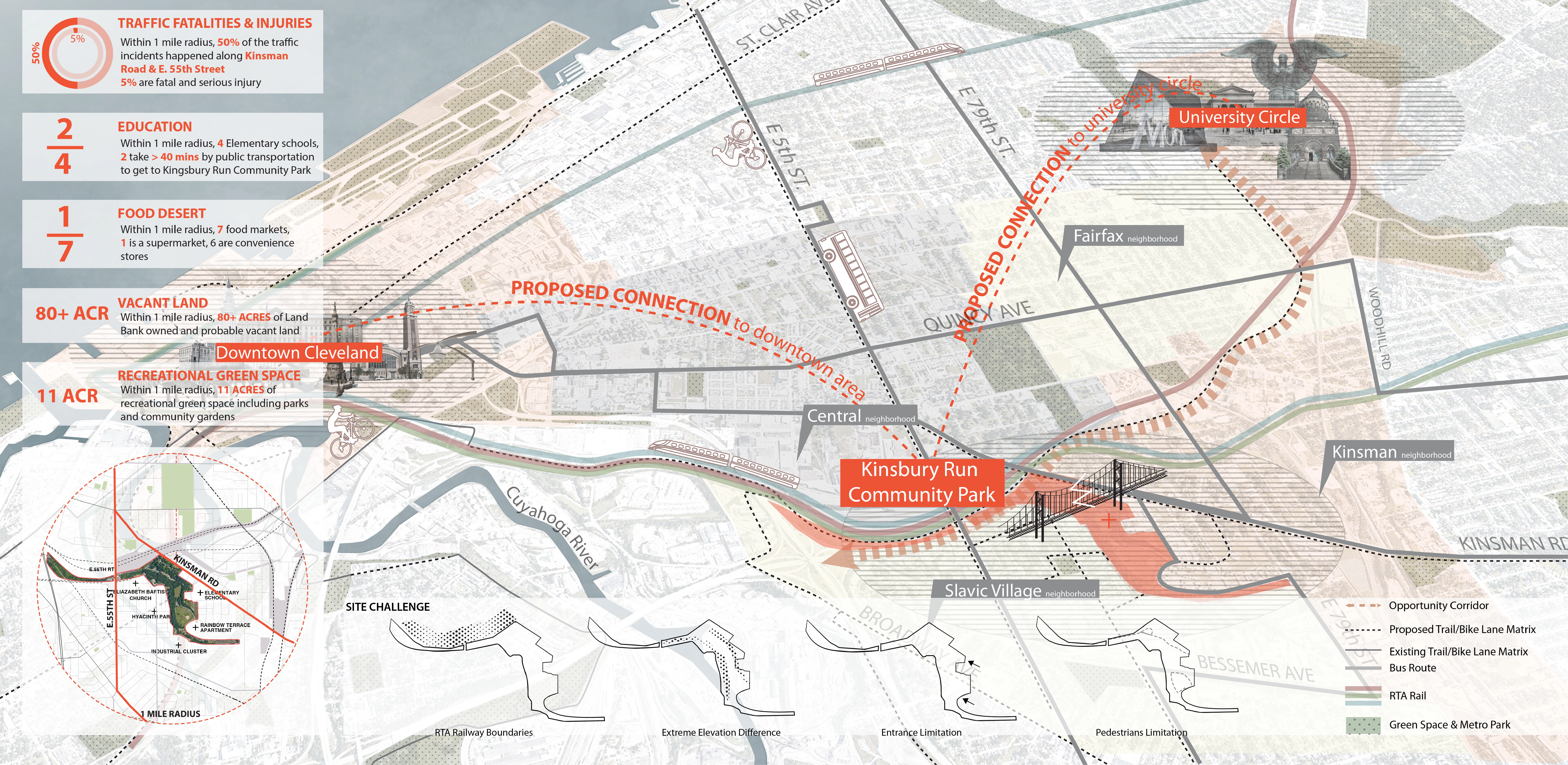 In parallel with the ongoing neighbrohood plan for regeneration, Cleveland’s “Opportunity Corridor” roadway development project, promises to bring new economic development, job opportunities and identity to the Central / Kinsman / Slavic Village neighborhoods by connecting them with University Circle and Downtown. These are the largest employment and development districts. However, the project's over-emphasis on vehicular mobility has been criticized for its lack of sensitivity to the surrounding neighborhoods. The absence of a recognizable and comprehensive green infrastructure network, fails to address the immediate quests of the communities for friendly, walkable and bikeable connections to community assets. Most importantly, this highway network runs directly through the north section of the Kingsbury Run, which further disrupts the land which has the potential to be the neighborhood jewel.
