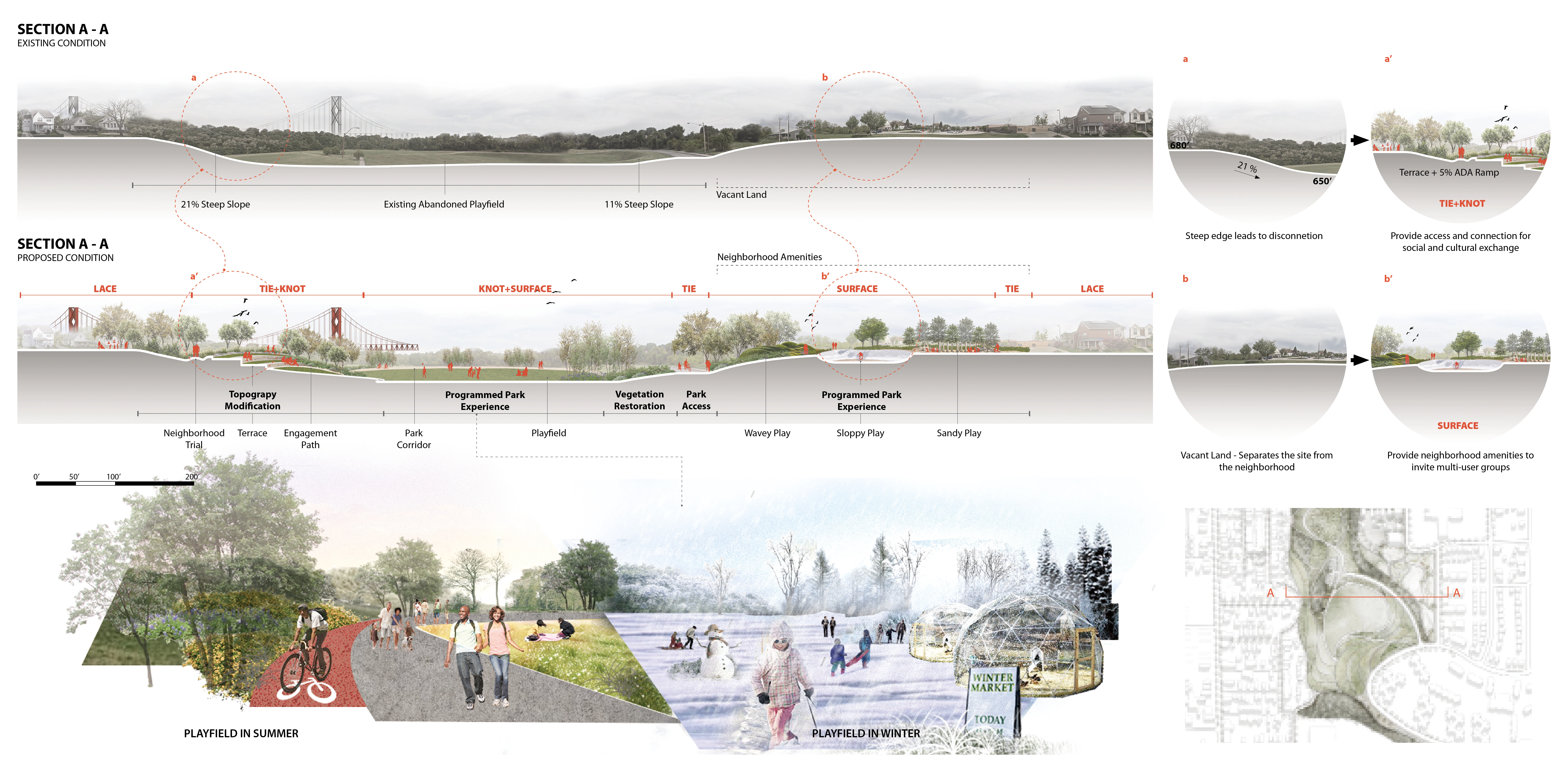 Kingsbury Run, an abandoned landfill in the heart of the Kinsman neighborhood in Southeast Cleveland, has long been neglected and labeled as a brownfield site. Despite its current appearance, it was once an ecologically rich watershed. Presently, this land is perceived as an eyesore due to it’s embedded history of precariousness, segregation, and racism. This negligence has created opportunities for nature to take over. Wildlife and flora has repopulated the land, including invasive plant species. It gives the sense of wilderness within an urban setting. Laces, Ties and Knots proposes to establish a new relationship between the people in the Kinsman neighborhood not only with nature, but also with the entire city. The project envisions a process which restores the disconnected communities as the result of environmental racism and creates a comprehensive social, cultural, and ecological unity, through revitalizing this forgotten site.