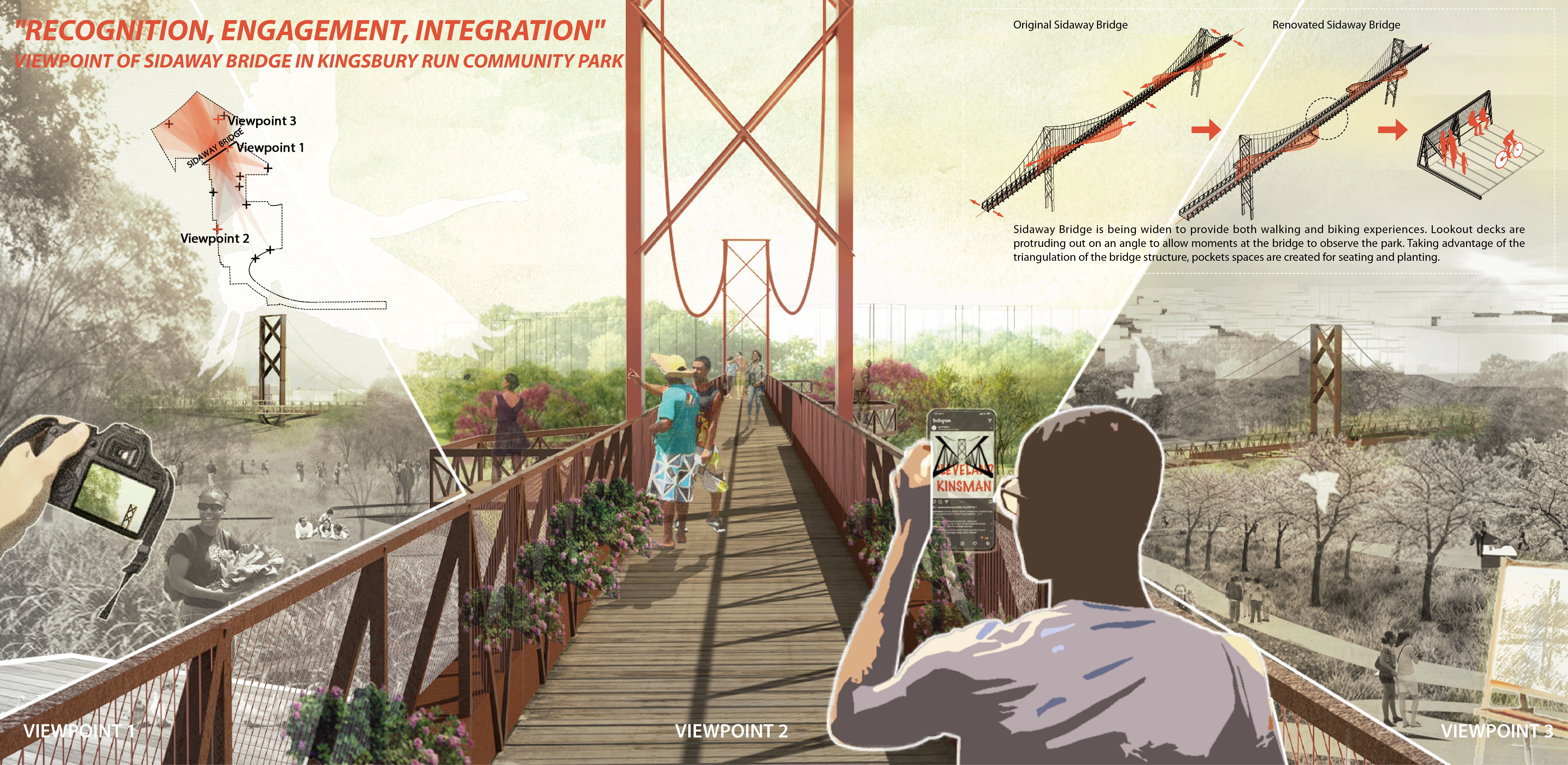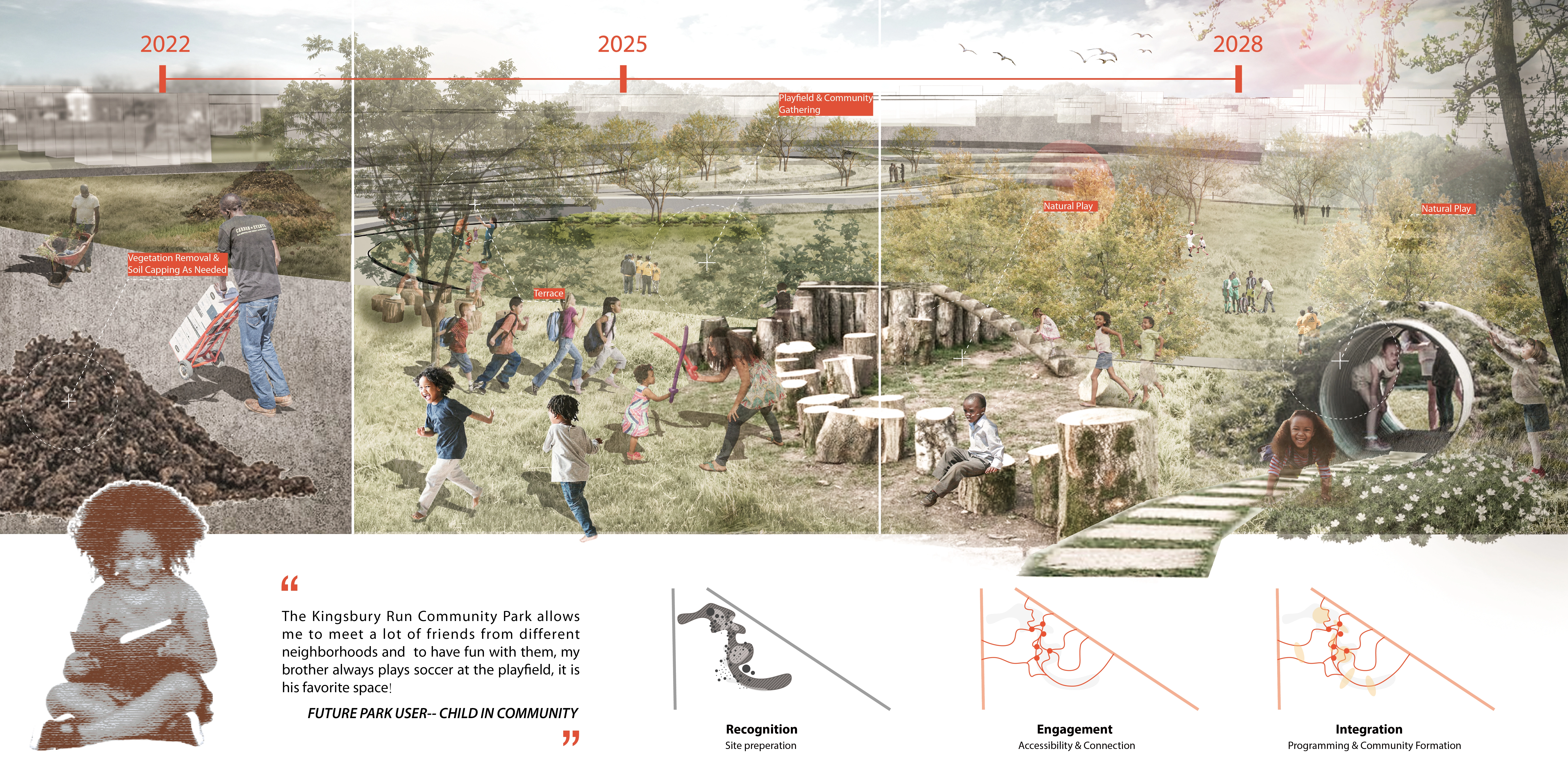 Phase 1 - Recognition - The history of the surrounding neighborhoods, Kingsbury Run and Sidaway Bridge will be revealed. The site’s challenges and assets will be acknowledged and address the needs of the communities. The concept and importance of a sustainable lifestyle will be introduced. Phase 2 - Engagement - Opportunities for community inputs of the development process of the park will be provided to the community to allow for social and cultural exchange between neighborhoods. Phase 3 - Integration - People of various interests, background and experience groups will collaborate. Relationships with nature and citywide connections will be encouraged.