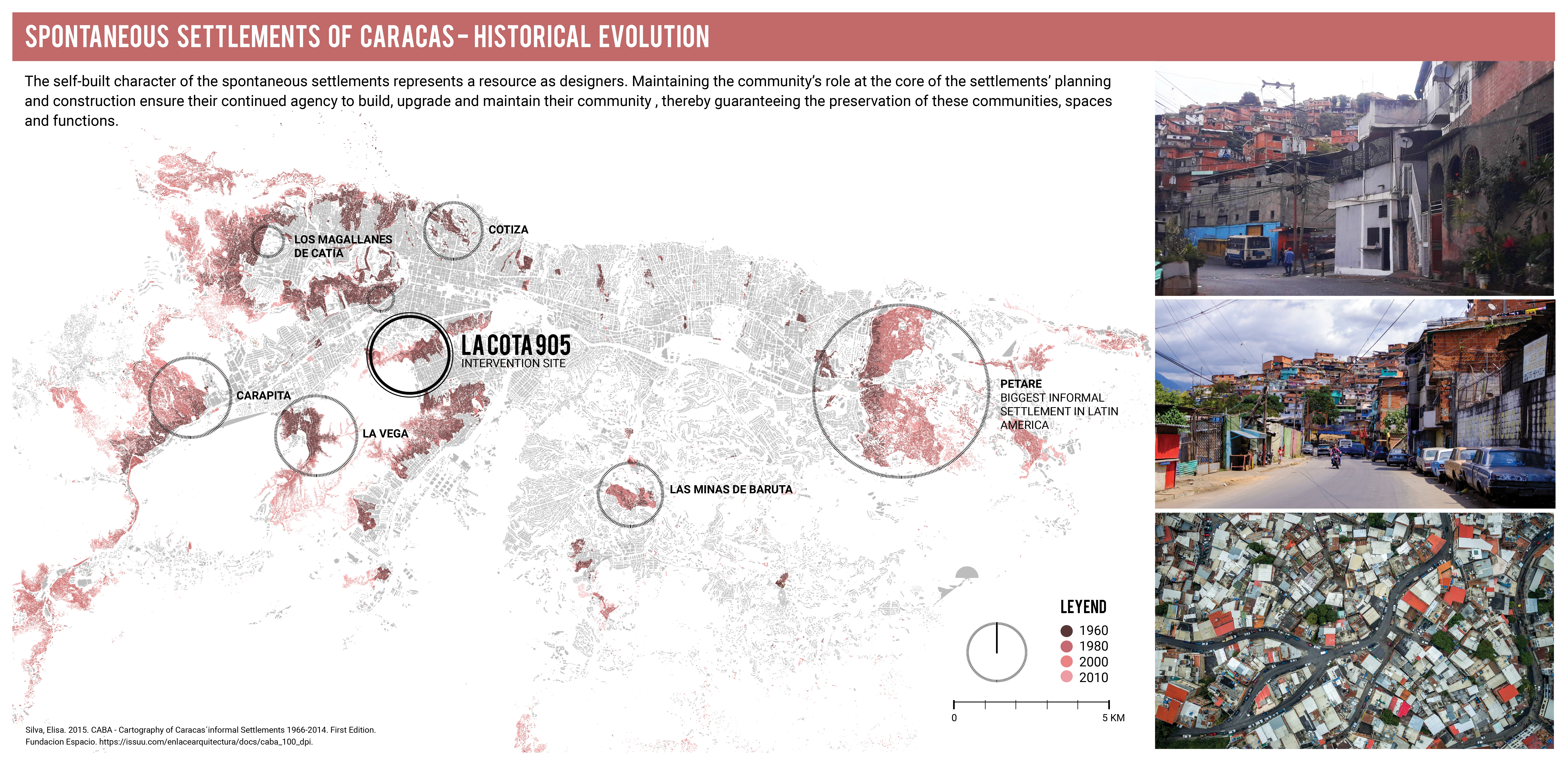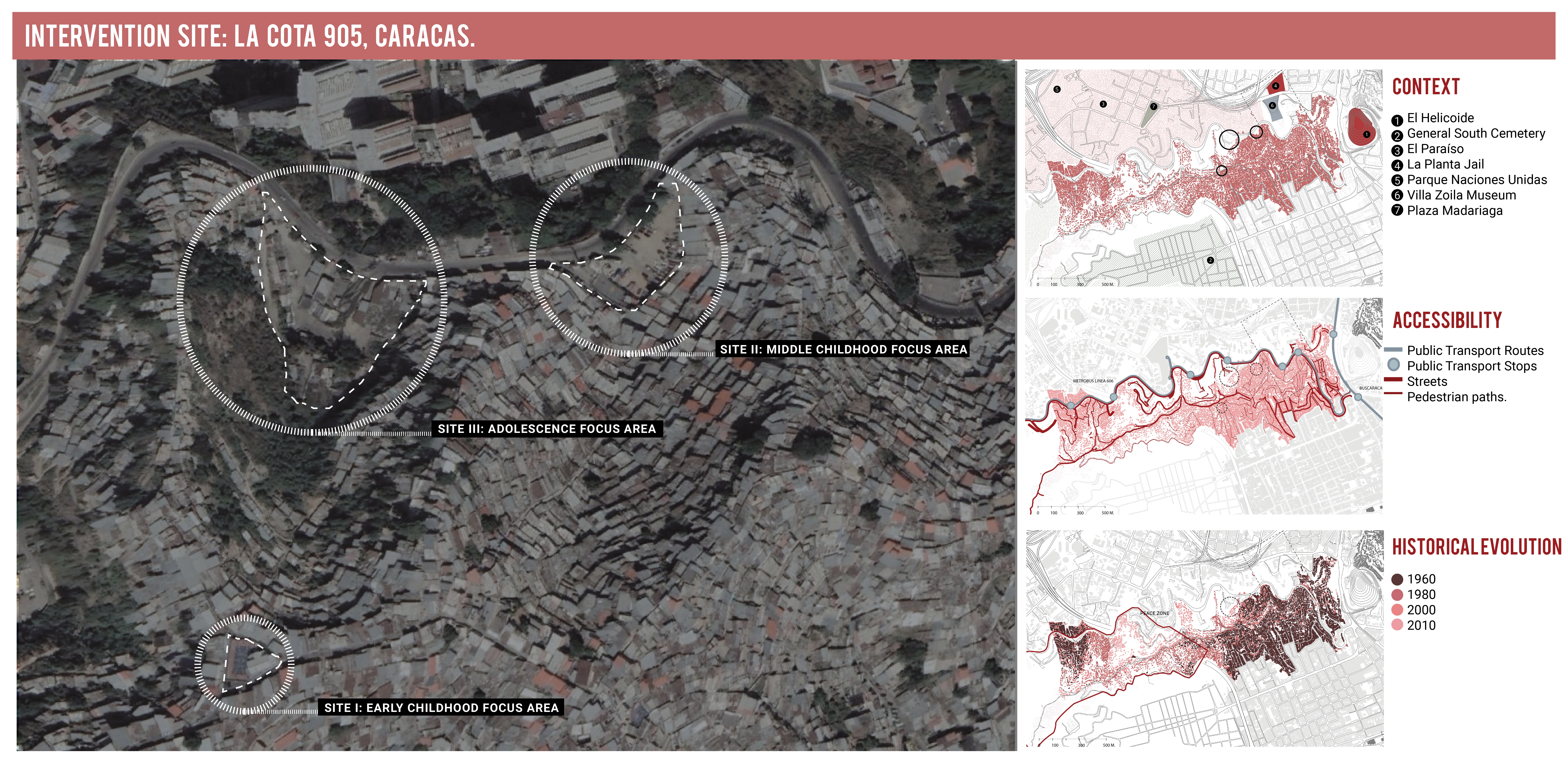 The strategies developed during the research phase and toolkit are adapted as a series of place-specific interventions in an informal settlement known as La Cota 905. Currently, La Cota 905 is known for its high levels of violence and is currently governed by a powerful criminal gang. La Cota 905 runs along Antonio Guzman Blanco Avenue in southwest Caracas and has slopes ranging between 40 and 70%. The area is designated as a "peace zone", meaning that police and other security forces cannot enter and intervene in the area. The three proposed interventions work as a connected network to respond to needs of children and adolescents within this community.