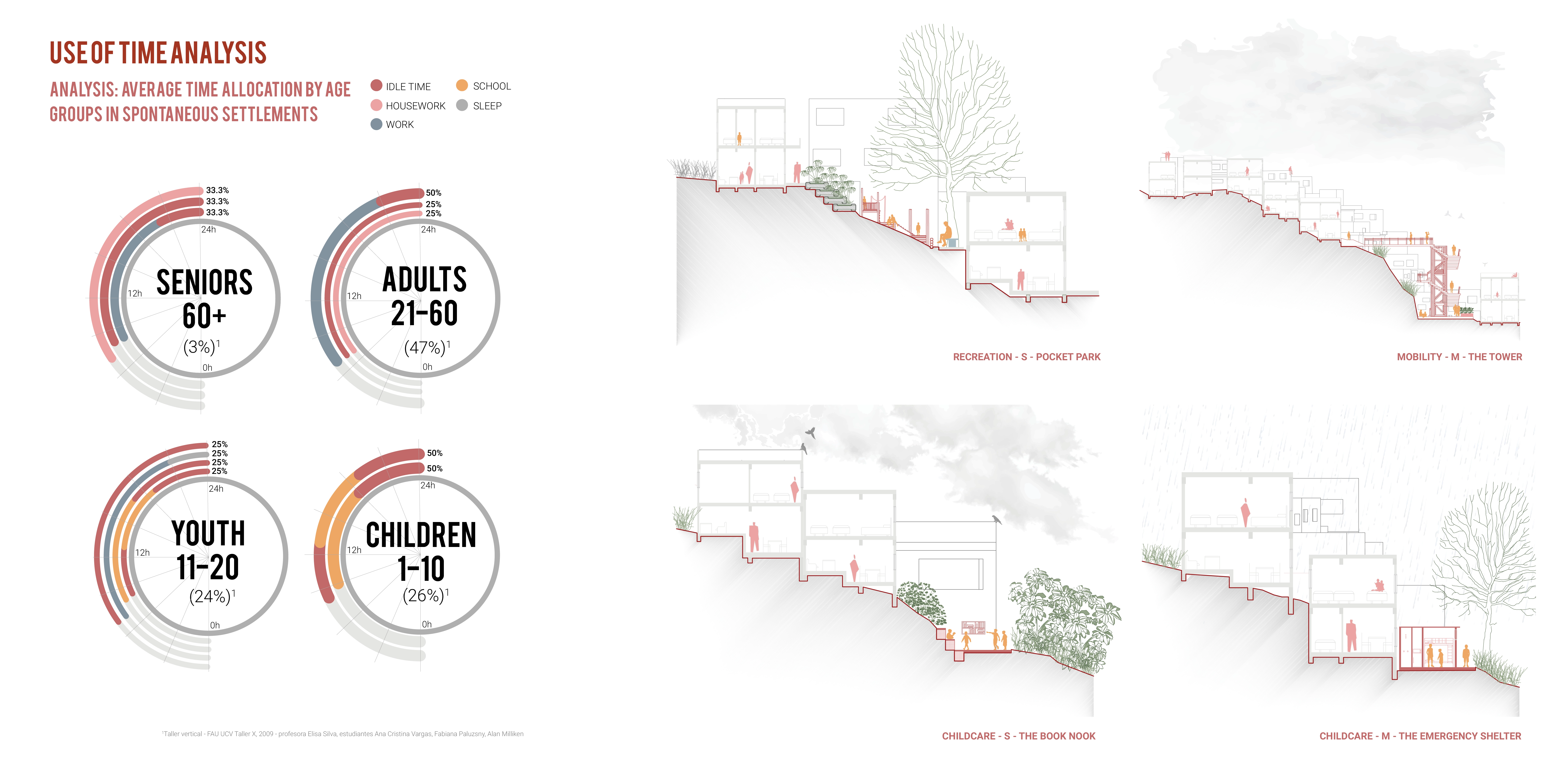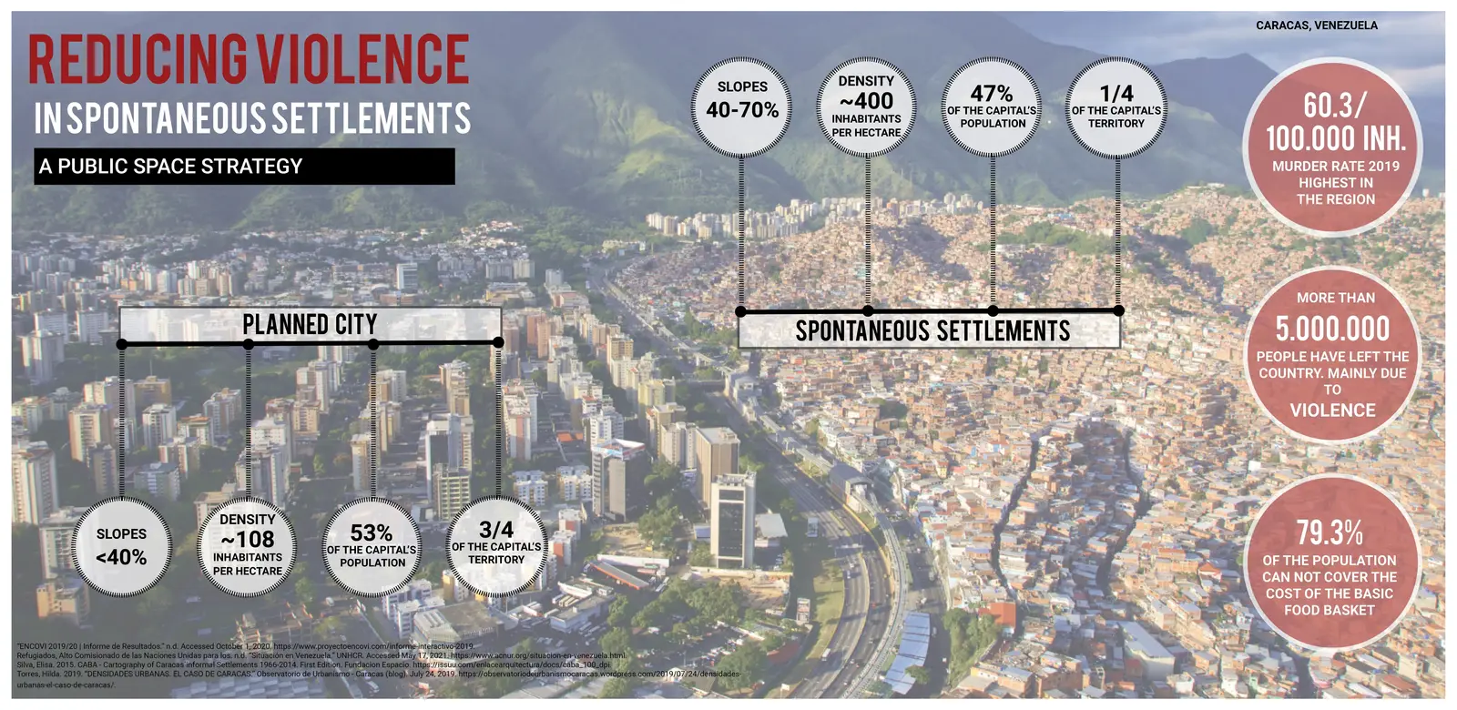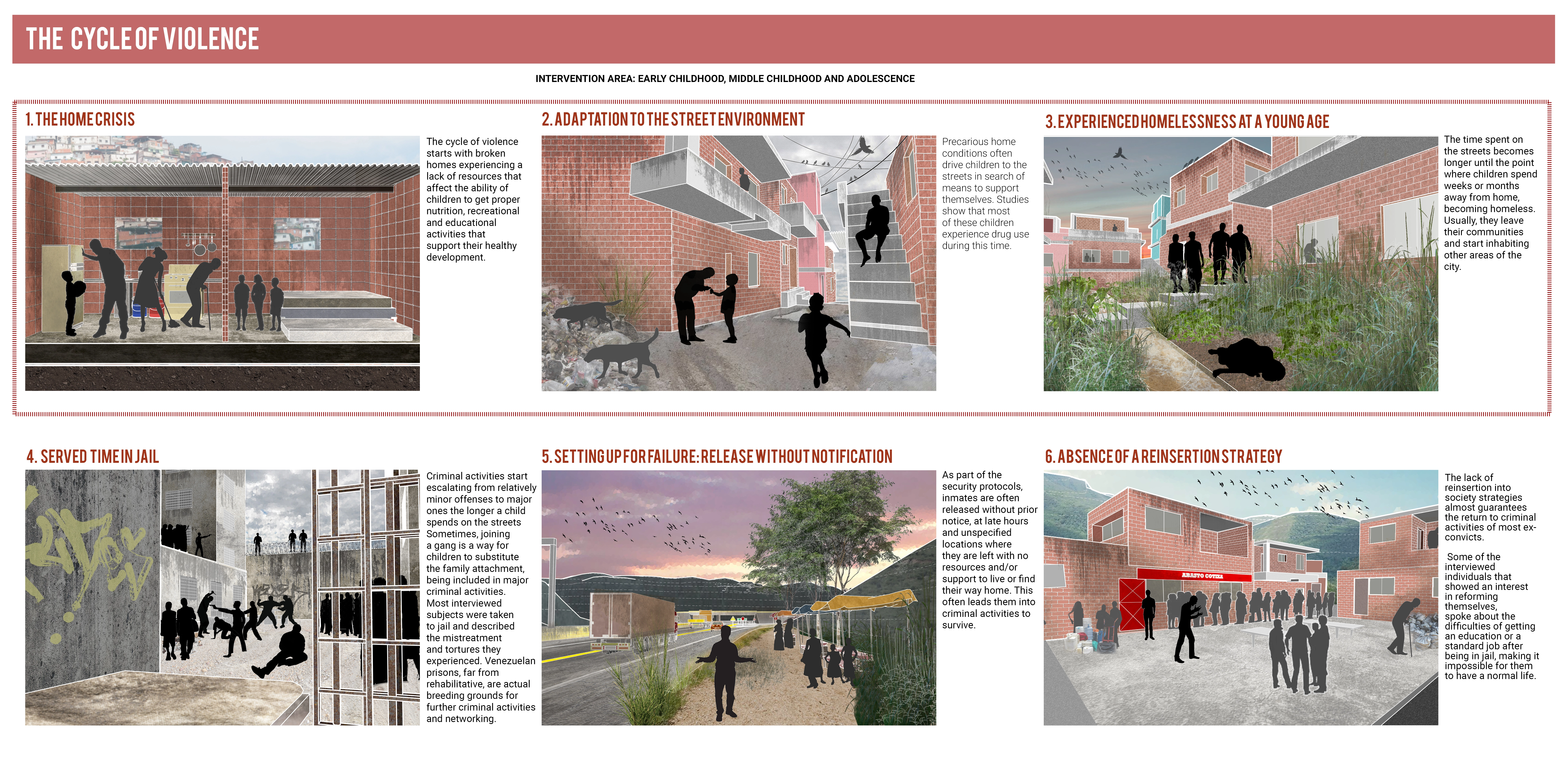 Drawing from sociology, psychology, and cartography, the project began by exploring personal stories of cycles of violence in Caracas. This process involved analyzing fourteen stories of people who shared events from childhood that led them into criminal activities. The study revealed six common stages of violence. These stages were used to inform spatial and social interventions to minimize and hinder the cycle of violence. The strategies were then collected into a toolkit of spatial interventions focused on improving living conditions and reducing risk factors that lead children into the cycle of violence. Working toward spatial justice, the project focuses on the causes of violence as spatial and systemic issues, as opposed to responses to violence, which often focuses on individual failings.