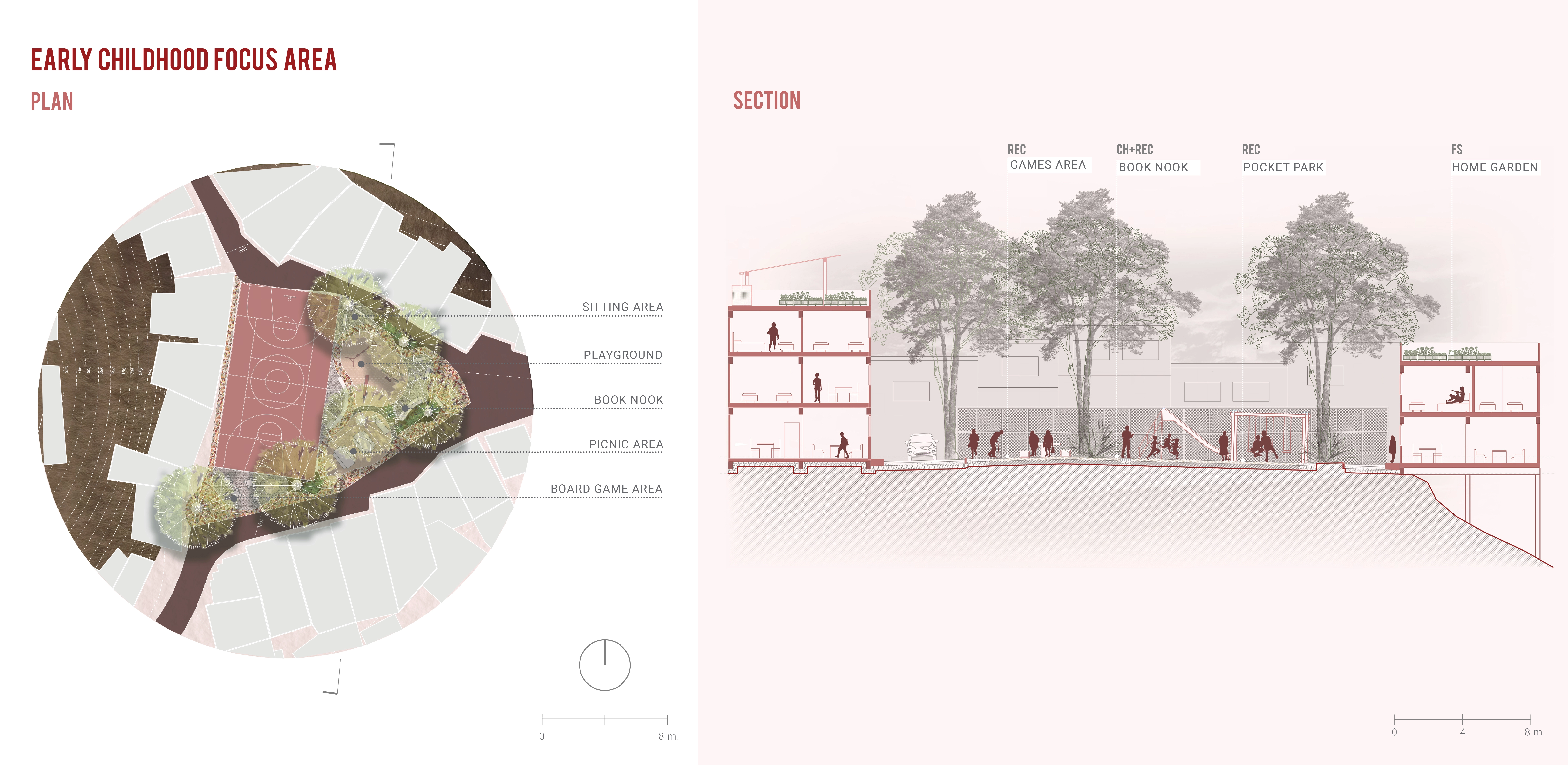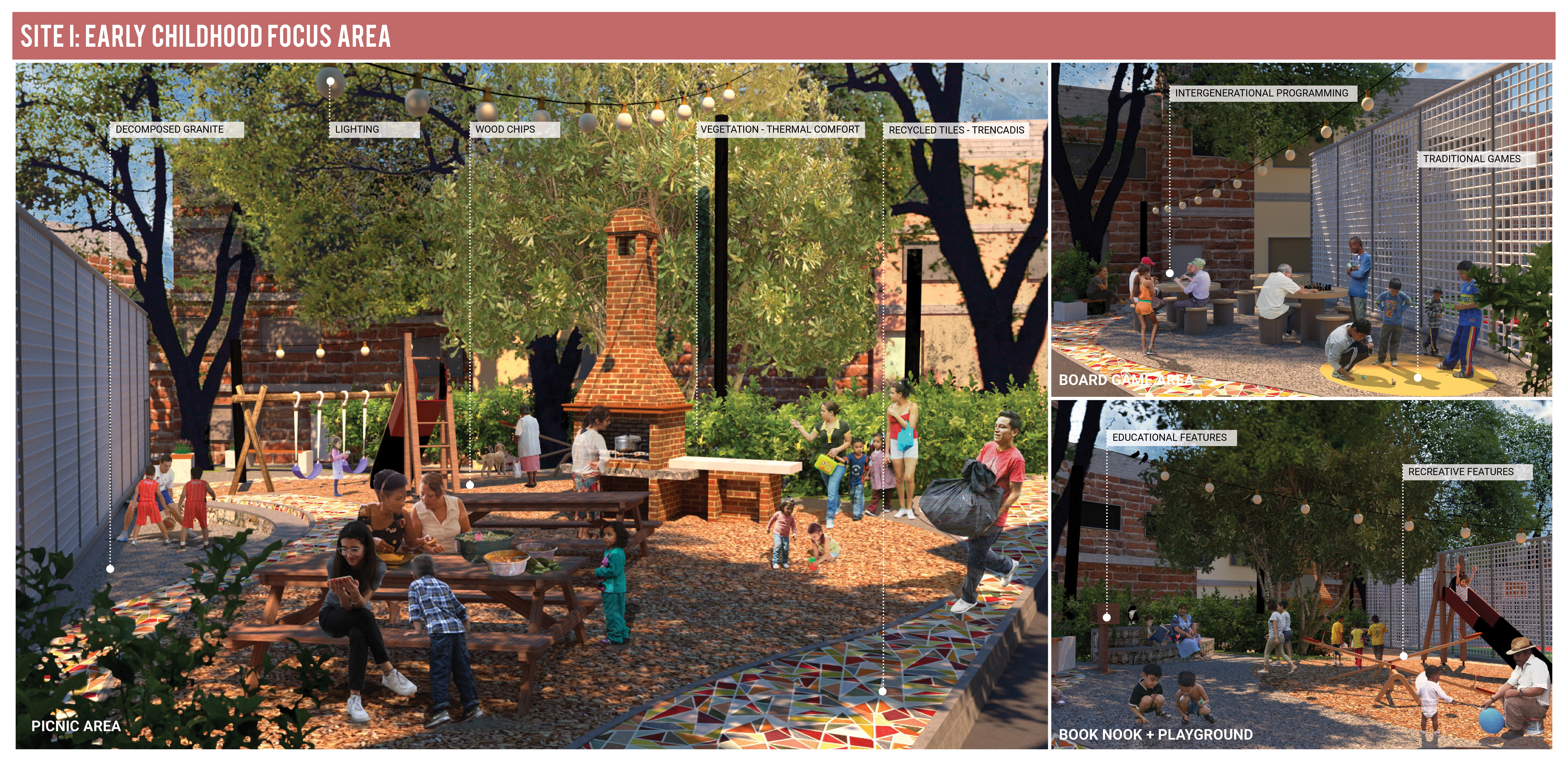 The Early Childhood Focus Area is the first intervention and is located at the highest topographic point in the community. The design utilizes the surrounding ground of an existing basketball court to create a space focused on early childhood programming and needs. The Early Childhood Focus Area represents how a small space could be designed to provide a space for young children to be under the constant supervision of adults. The intervention creates a community around childcare by supporting programs for adults and children alike. The design includes a playground, a book nook, an area for board games, and multiple sitting configurations around the existing basketball court. The design also includes a picnic area with a coal kitchen for holding small events and community celebrations, as is common and traditional in the area. The intergenerational focus of this intervention and embrace of traditional activities guarantees that there will be constant support from community elders.