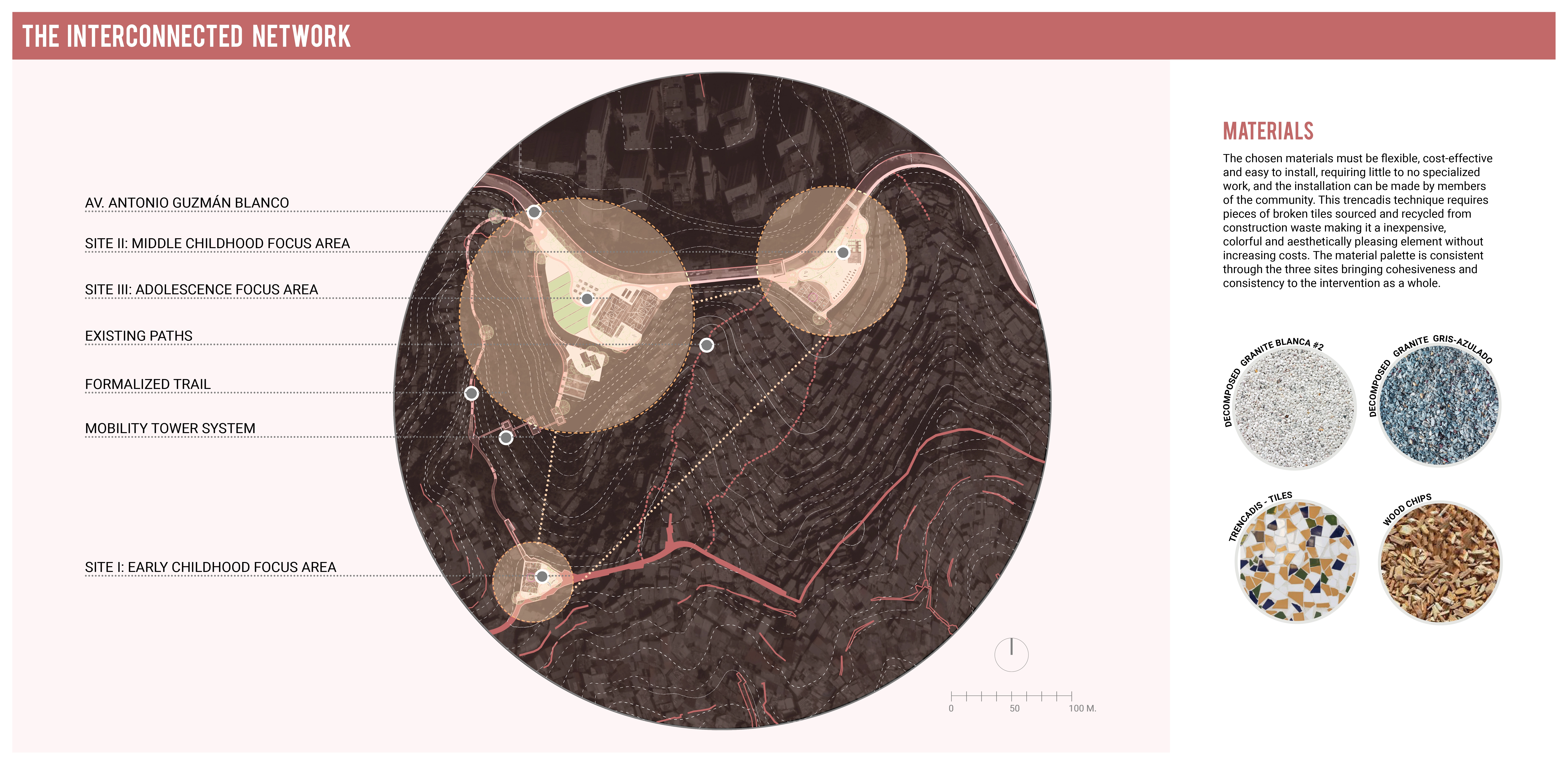The three proposed interventions work at varying scales to form a comprehensive public space strategy for the community. Together they create an interconnected network of public spaces that respond to the existing community dynamic to support children of all ages. The construction materials for each proposed space are drawn from a shared palette of materials that are affordable and easy to acquire. The three spaces work with existing site conditions to maintain already present homes, shops, and roads. They are connected using existing footpaths and roadways. The planned future formalization of the west trail into a stair and sidewalk system would further increase connectivity on the west side of the neighborhood. Finally, a mobility tower system is proposed to ease the connection between the Early Childhood Focus Area and the Adolescent Focus Area, helping navigate the almost 100 meters vertical distance between these two locations. The self-built character of informal settlements should be seen as a resource to designers. Maintaining the community’s role at the core of the planning and construction ensures their continued agency to build, upgrade, and maintain these spaces.