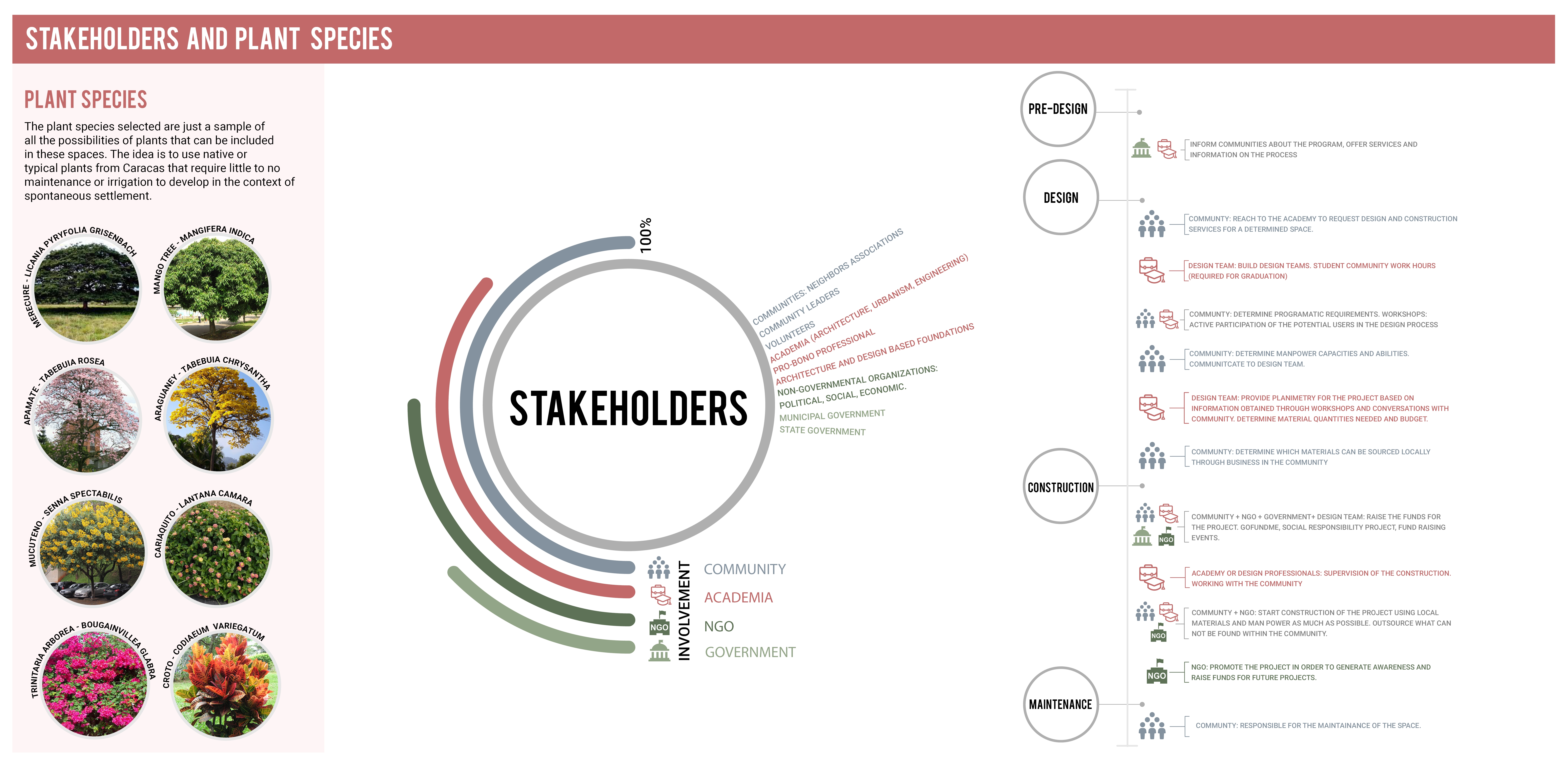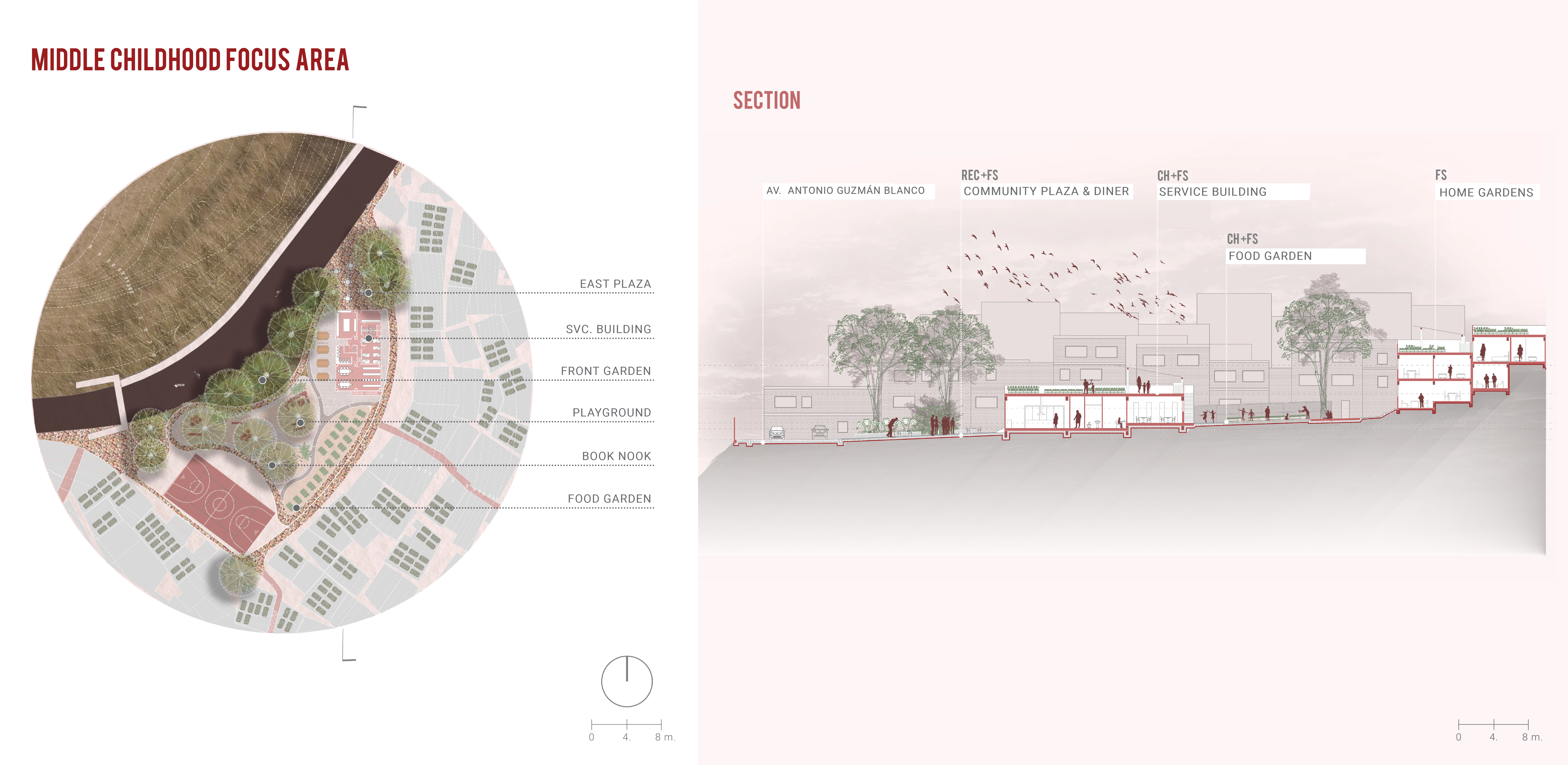 Caracas, Venezuela is a city of inequalities. The city's informal settlements are marked by stigma of poverty and crime. In these communities, structural misgovernance has turned violent criminal gangs into normalized institutions. Consequently, Caracas is one of the most dangerous cities in the world. In response, this project proposes spatial strategies for reducing risk factors that drive children toward violence as means of survival in informal communities. Using interdisciplinary methods of site analysis and design, the project works with existing community spaces to address food insecurity, childcare and recreation, and mobility through a series of public space interventions. The project departs from typical applications of landscape architecture focused on responses to crime by working within existing community frameworks to focus on the causes of crime and violence. The resulting proposal is at once a celebration of how public space shapes and is shaped by communities, and a reimagination of a Caracas where the future of children and families in informal settlements is free from violence and inequity.