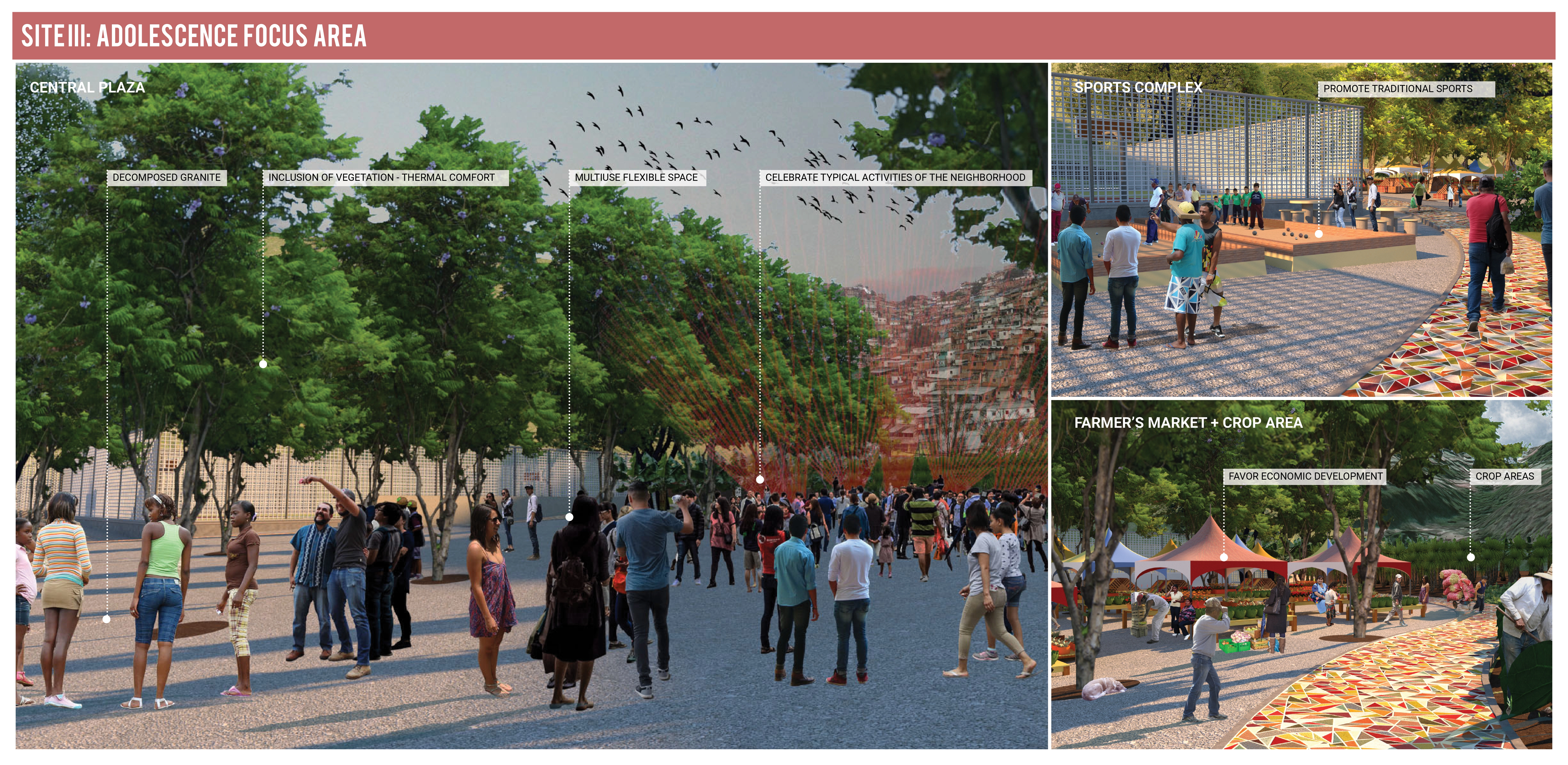 Lastly, The Adolescent Focus Area is composed of three programmatic areas arranged to create a space that serves multiple age groups. The first area is the sports complex. The intention is to host sports tournaments and practices that bring the youth of La Cota 905 together with the youth of other areas in Caracas around sports and teamwork. The second element relates to food security. Eighteen hundred square meters of crop area plus a community dinner are devoted to increasing local food production. The focus on community food production introduces adults to the space and encourages young people to learn about food production from older community members. The final element is two flexible plazas. Programming for these spaces will be determined based on community needs but are the appropriate size for artisan and food community markets or to host community gatherings. The Adolescent Focus Area could be phased over four periods to plan and develop each space to align with community needs.
