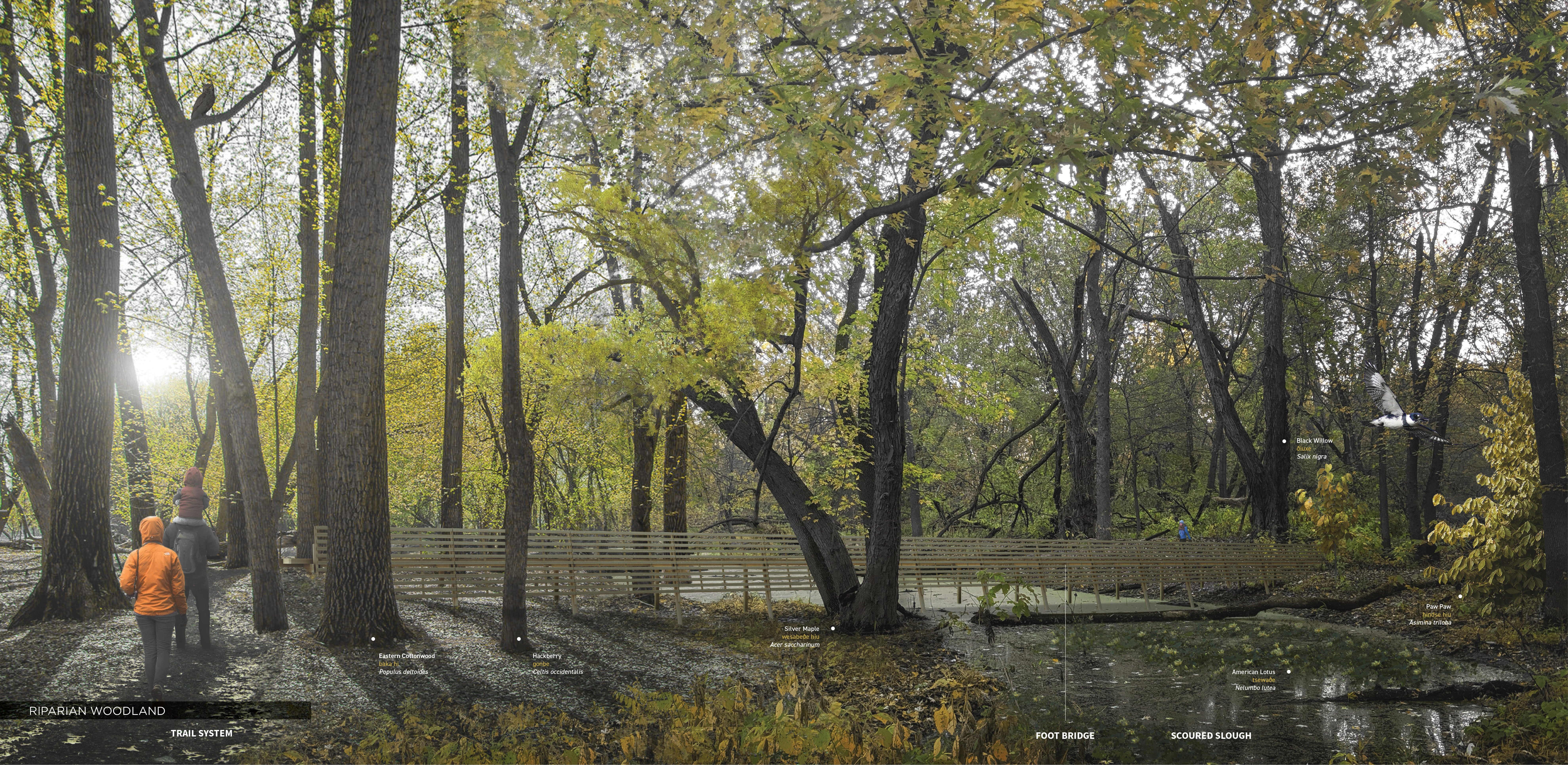 This proposal for the establishment of a biomass production operation within the river’s flood zone has integrated aspirations of ecological restoration, regional economic stability, and advancing social equity. The WRP is envisioned as a scalable equitable cooperative available to residents of New Haven, Treloar, and Missouri’s displaced indigenous communities, working in conjunction with the natural systems of the lower Missouri River Valley. In addition to the site’s potential for silviculture development, a 3.5 mile spur and ferry crossing connects the nearby Katy Trail to route cyclists between Treloar and New Haven. Campsites for Missouri River kayakers and canoeists and trail systems through the riparian woodland offer recreational opportunities for locals and visitors. Hybridized programs of production, research, and recreation expand the typology of rural public space to create opportunity for unconventional interactions between people, ecology, and place.